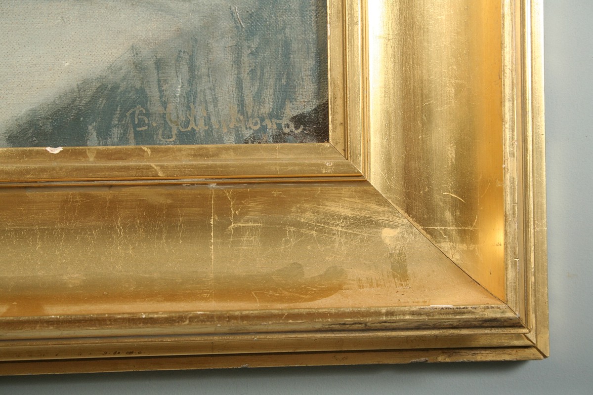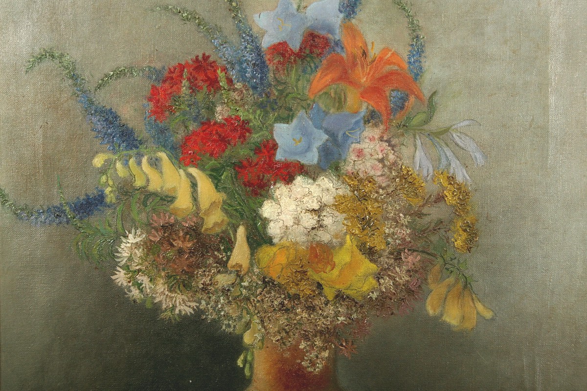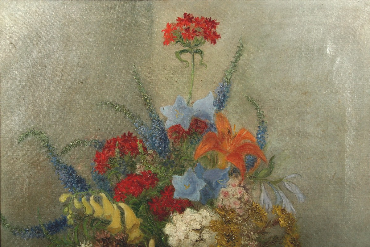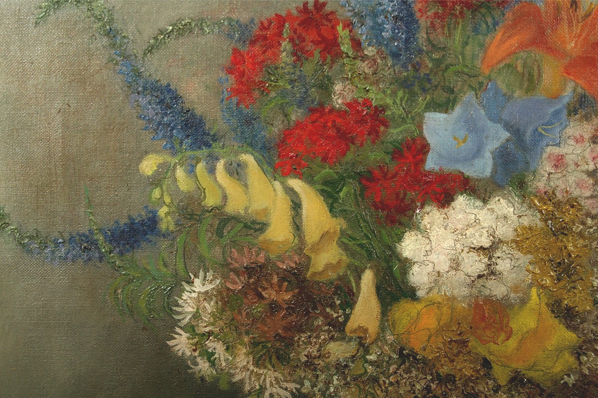 obraz kytice ve váze na stole, olej na plátně 60 x 50 cm s rámem 79 x 68 cm, autor Božena Jelínková, Jirásková, podepsáno v malbě vpravo dole B. Jelínková, rámováno ve zlaceném rámu