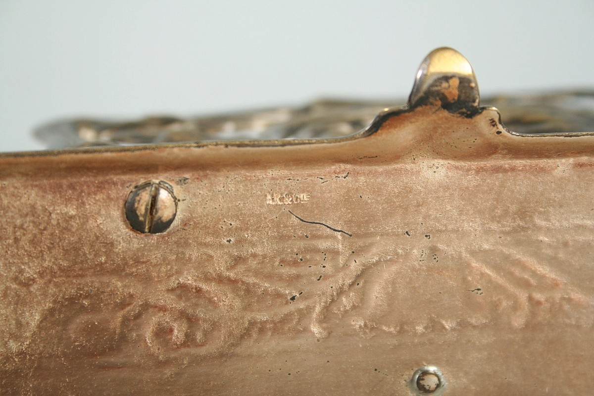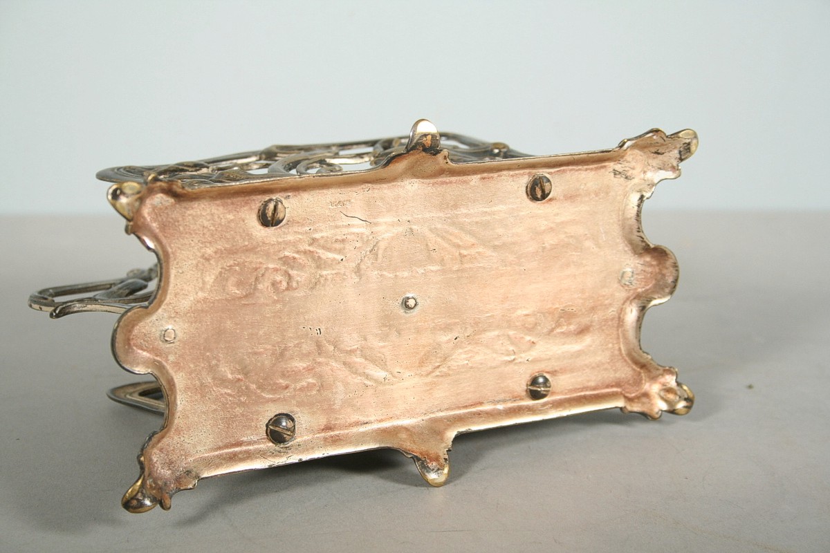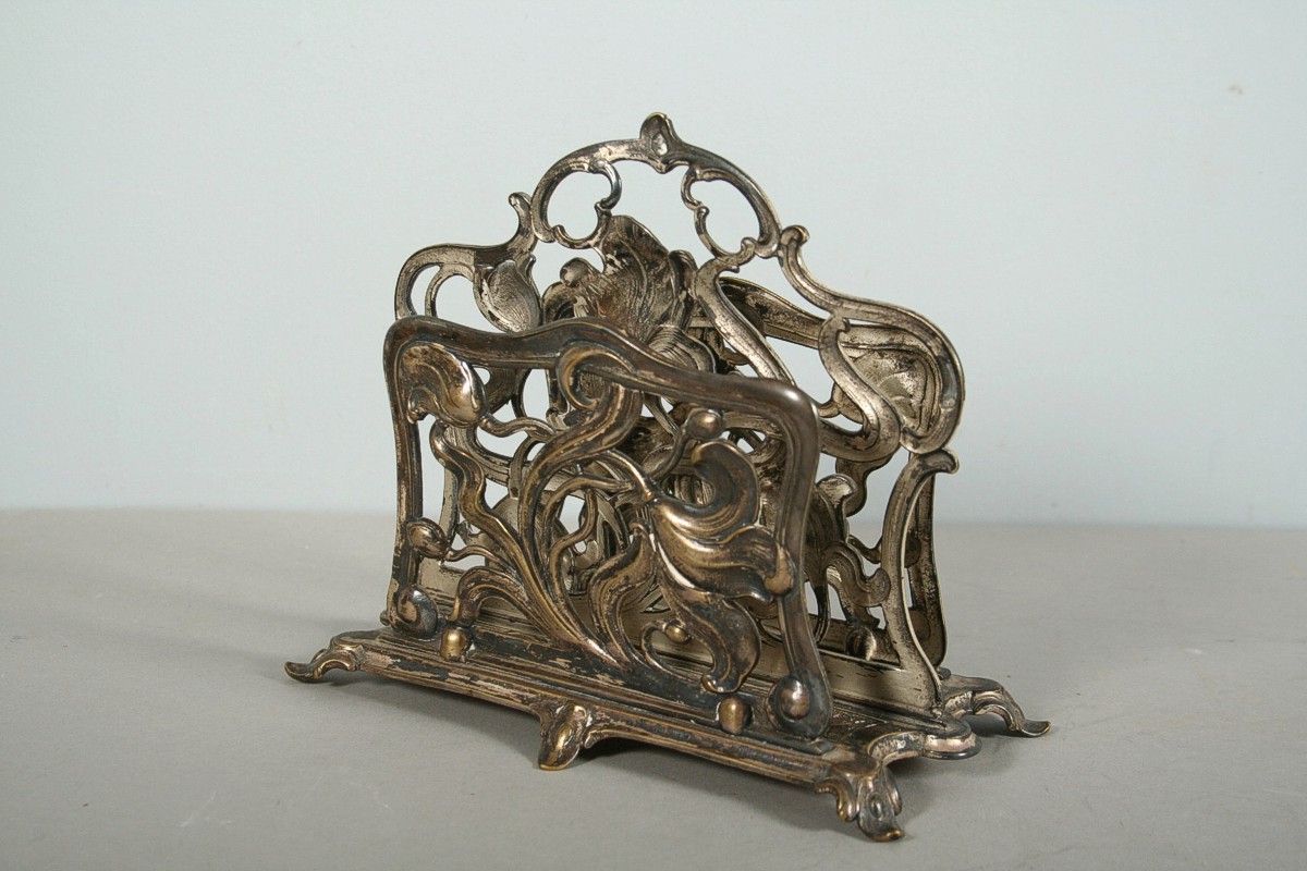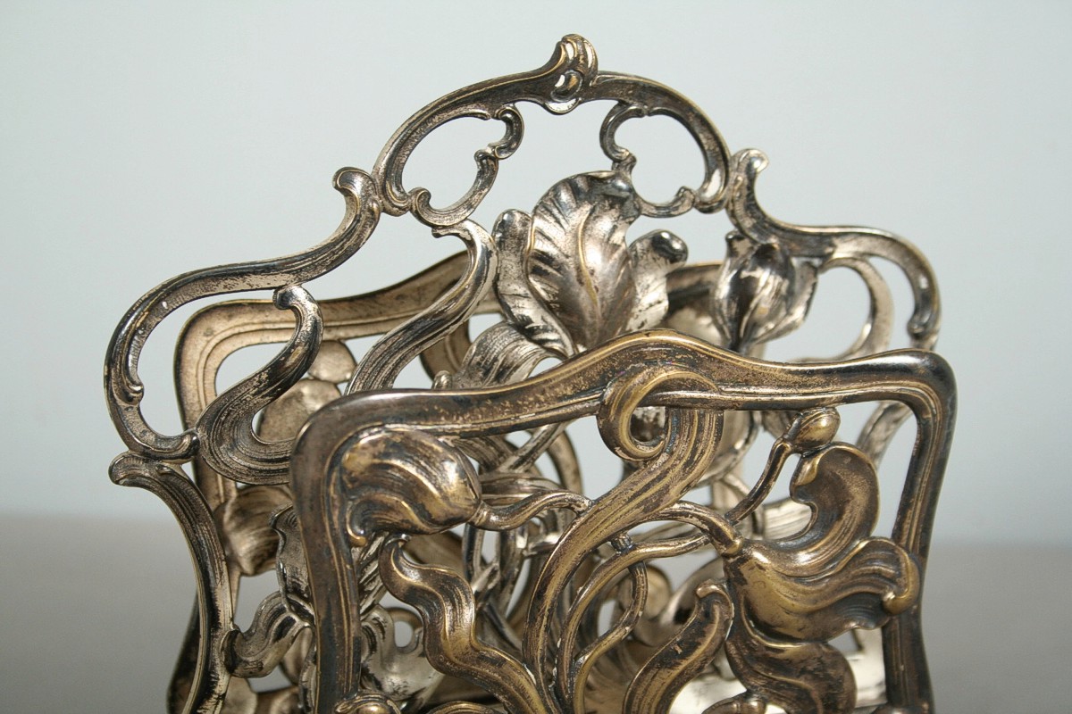 secesní stojánek z alpaky na dopisy, nebo ubrousky, kovové stříbřené provedení bohatě dekorováno plastickým reliéfem květin, vídeňská florální secese z přelomu 19. a 20. století, značeno na dně tlačenou značkou A.K.& Cie, 14 x 17 x 8 cm