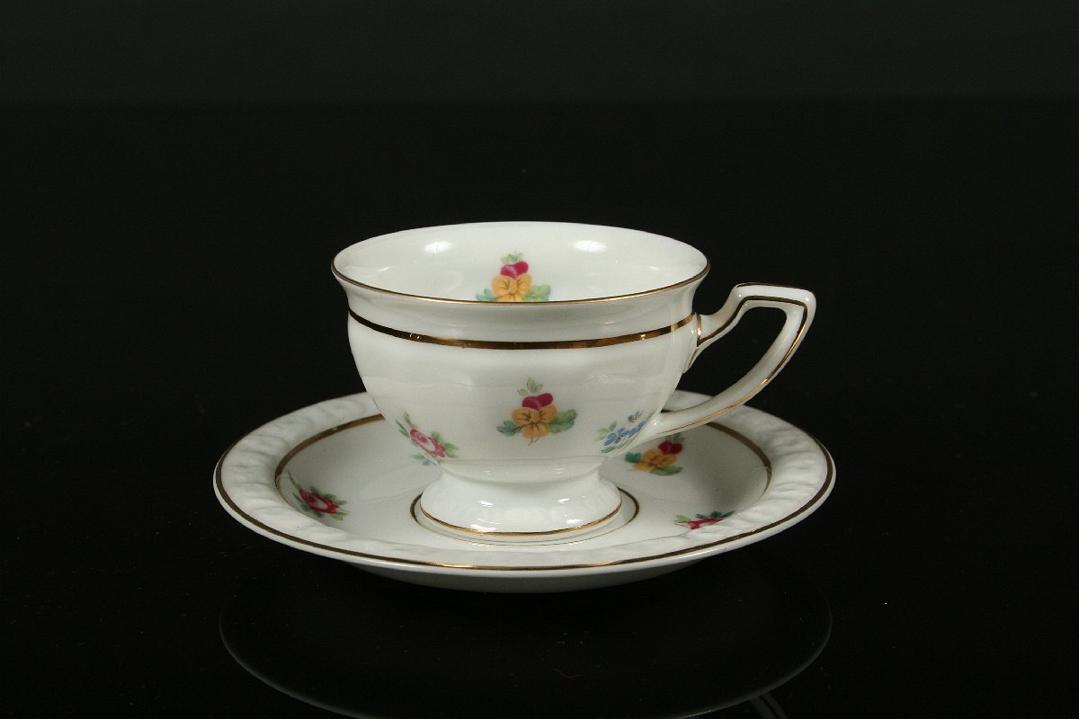 darovací moca šálek s projímaným podšálkem, bílý porcelán s dekorem květin a zlacenými detaily, značený tištěnou značkou Rosenthal, 4,5 x 10,5 cm