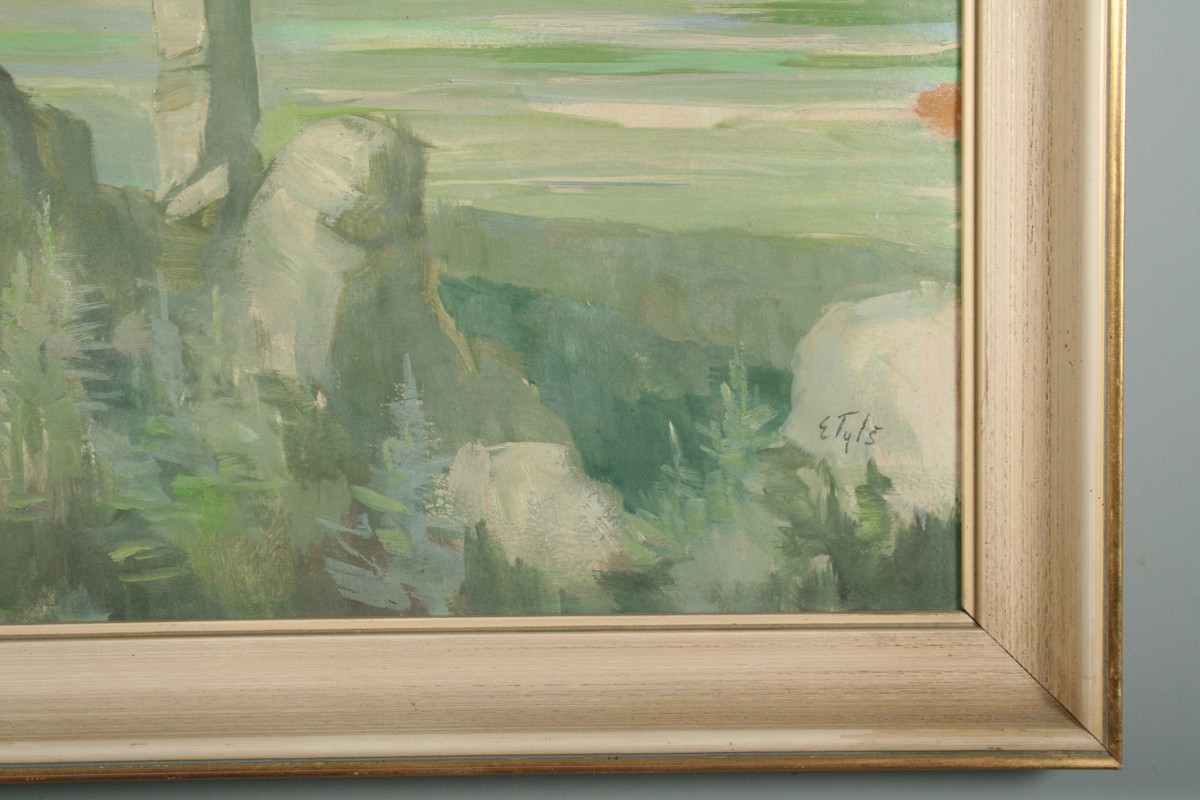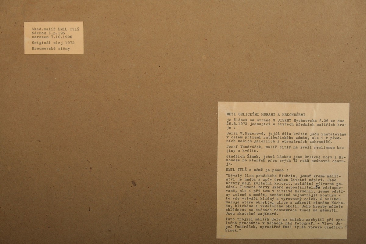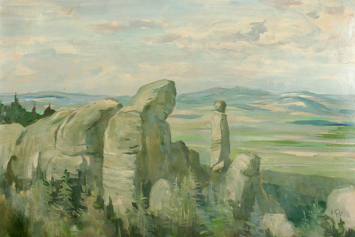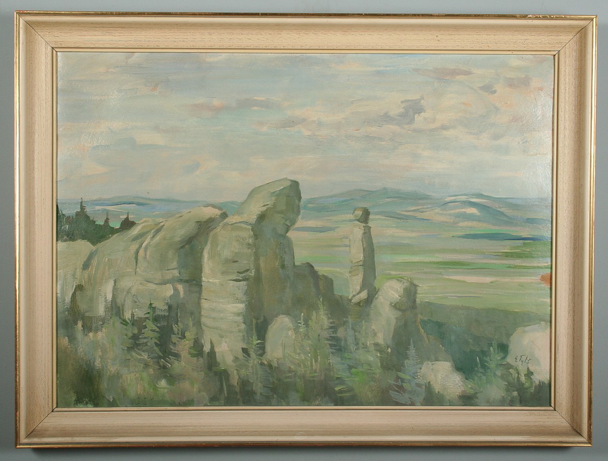 obraz skála Kačenka v broumovských stěnách, olej na kartonu 50 x 70 cm s rámem 58 x 78 cm, autor Emil Tylš podepsáno vpravo dole E. Tylš, přípis na zadní straně, rámováno v původním rámu