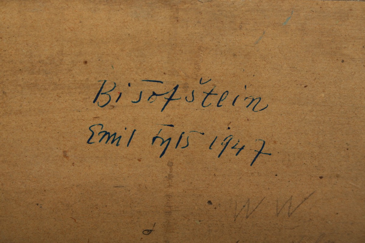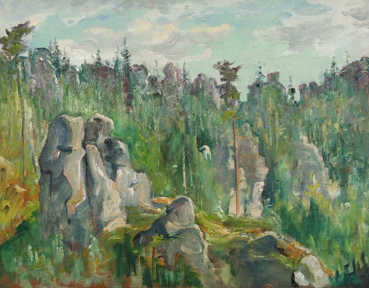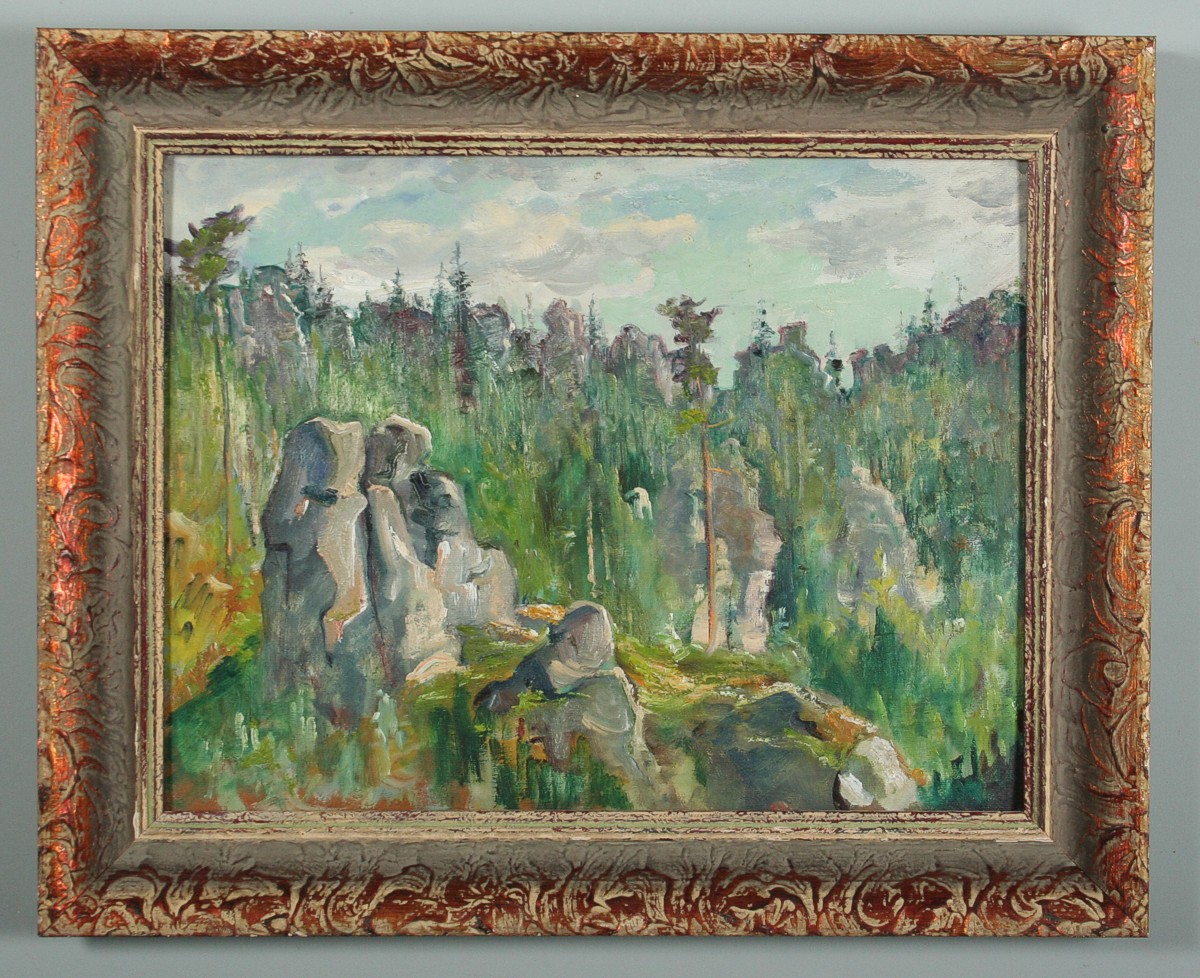 skály Bišofštein, olej na plátně lepeném na kartonu 34 x 44 cm s rámem 45 x 56 cm, autor Emil Tylš podepsáno vzadu autodedikací Bišofštein E. Tylš 1947, rámováno v původním rámu