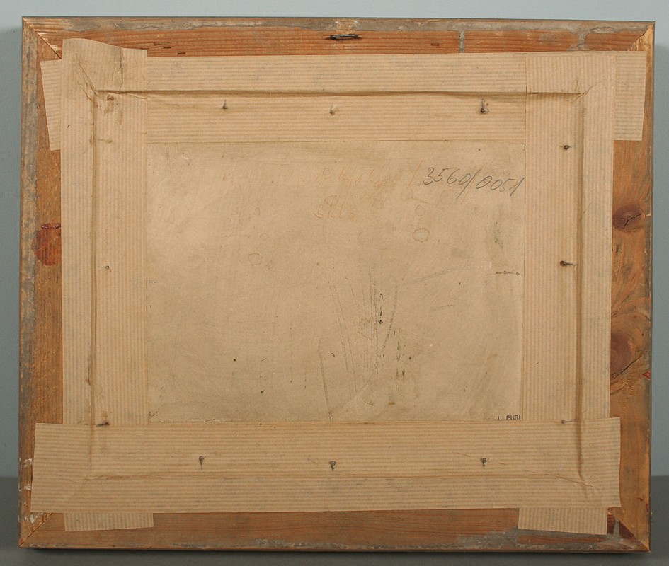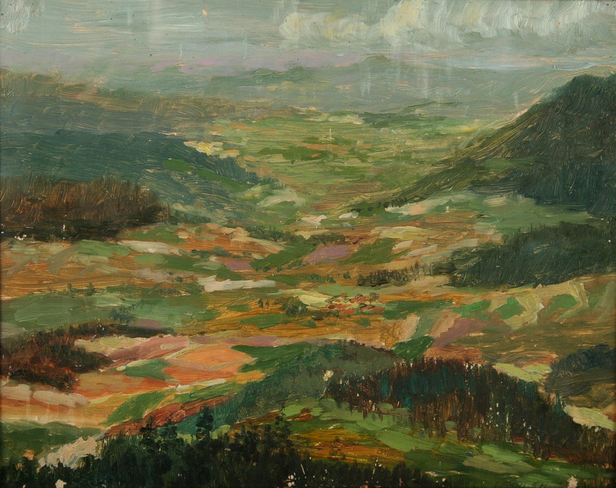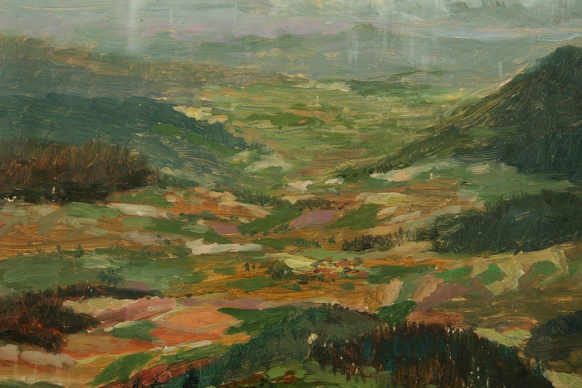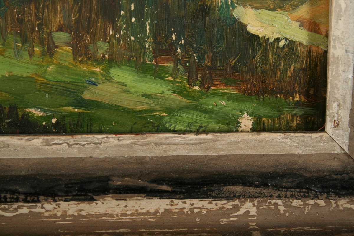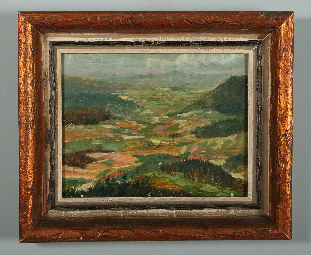 obraz údolní krajiny, olej na lepence, ve výřezu 20 x 26 cm s rámem 31 x 37 cm, autor Ladislav Ehrlich, podepsáno vpravo dole L. Ehrlich na zadní straně autorské razítko L. EHRLICH, rámováno v původním rámu pod sklem