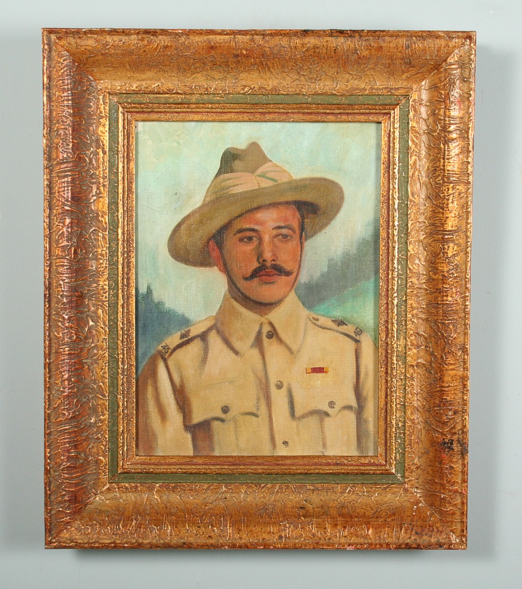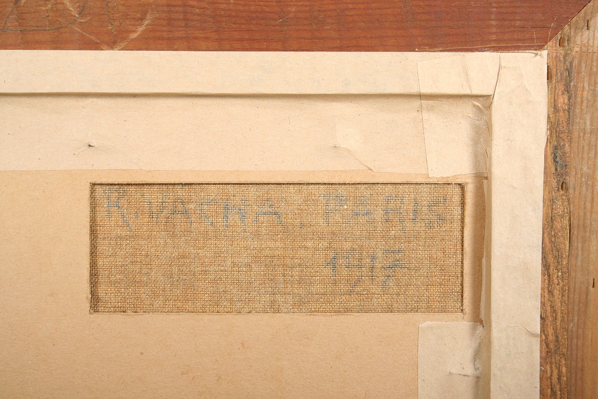portrét mladého vojáka s kloboukem, olej na plátně 31 x 23 cm s rámem 45 x 37 cm, autor Rudolf Vácha, podepsáno na zadní straně rukou autora R. VÁCHA PARIS 1917, pochází z významné náchodské zbírky, rámováno pod sklem