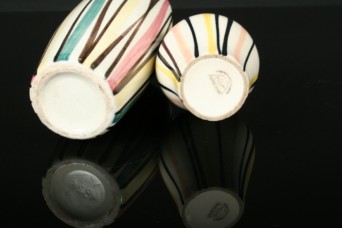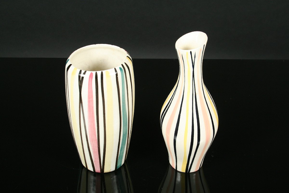 vázy ve stylu Brusel, malovaná keramika, jedna značená Ditmar Urbach tištěnou značkou, 60. léta 20. století, 24 a 20 cm, cena za jeden kus 950,-Kč za oba 1490,-Kč