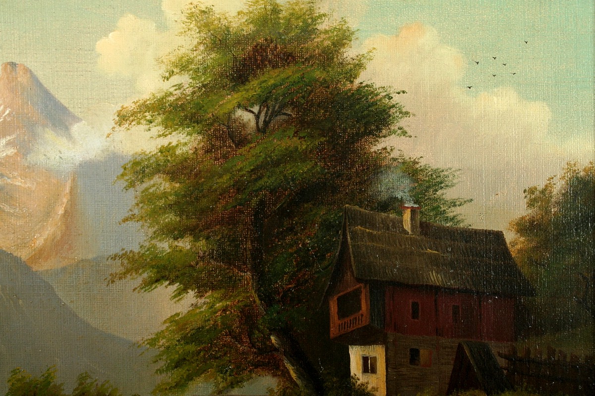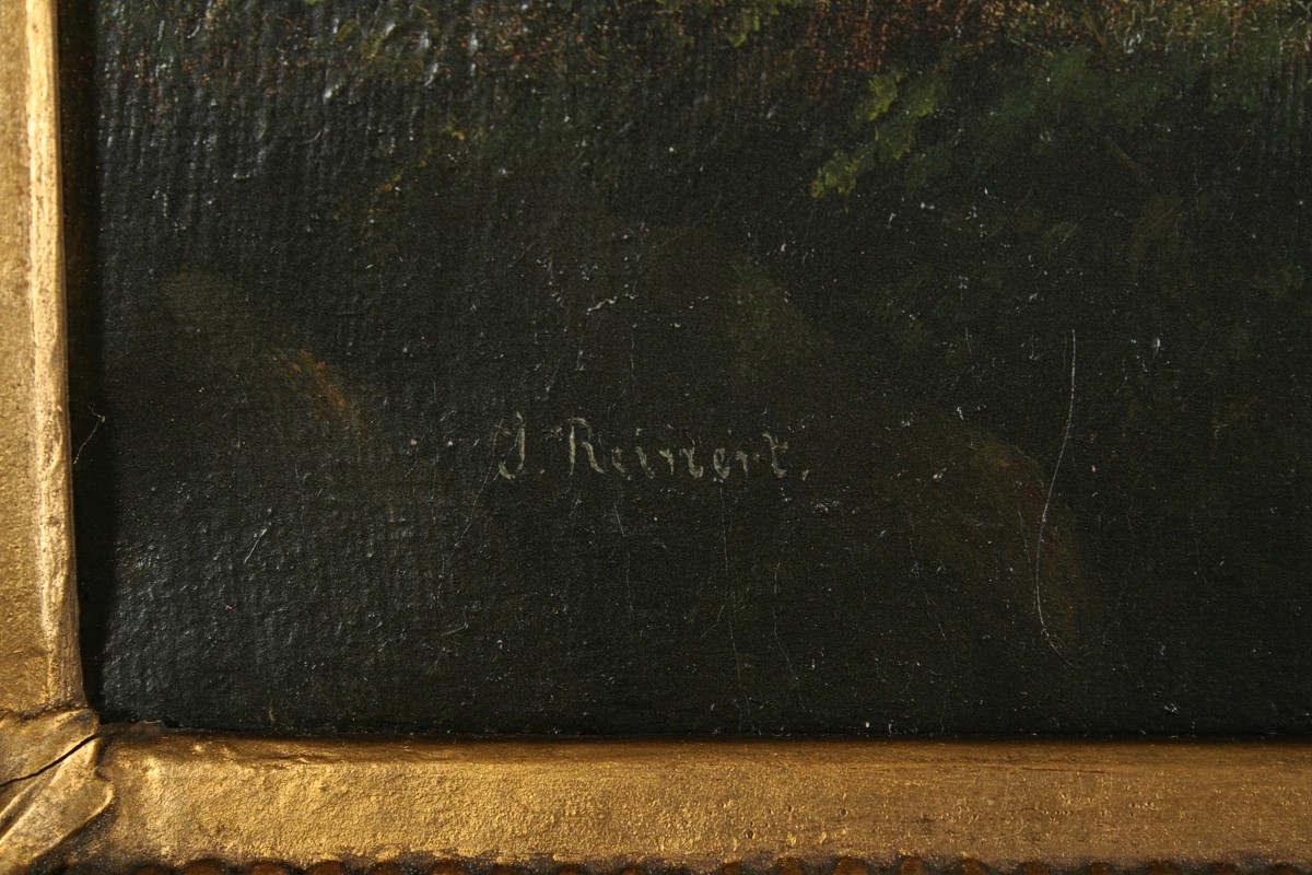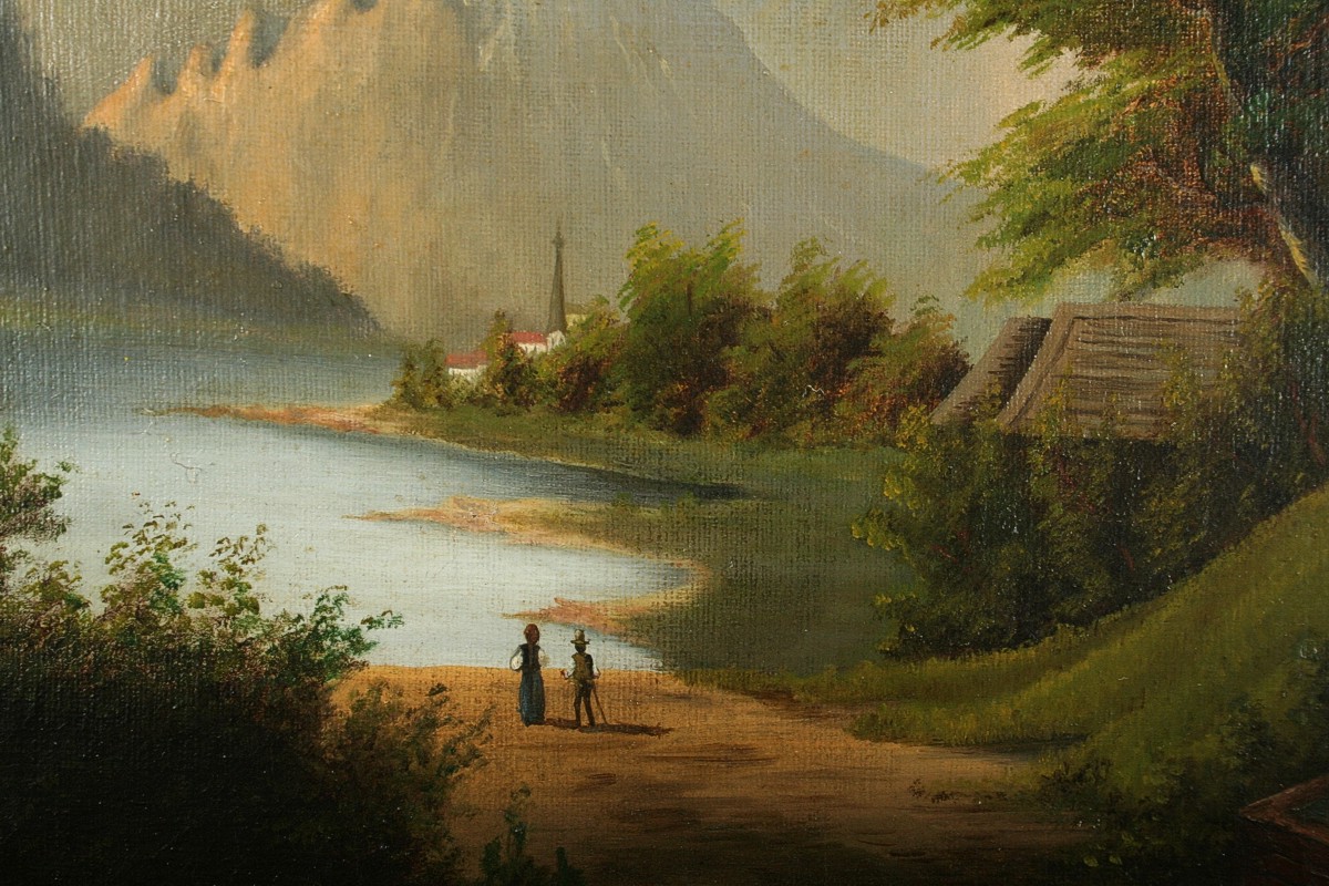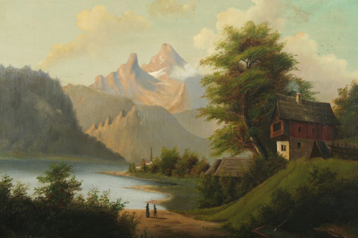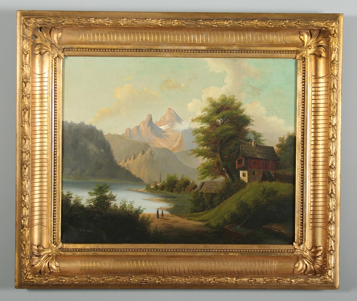 obraz romantické krajiny v horách s figurální stafáží u jezera a vesnicí vzadu, olej na plátně 32 x 40 cm, s rámem 47 x 55 cm, autor neznámý, 2. polovina 19. století, podepsáno vlevo dole J. Rainert, rámováno v původním zlaceném a zdobeném rámu