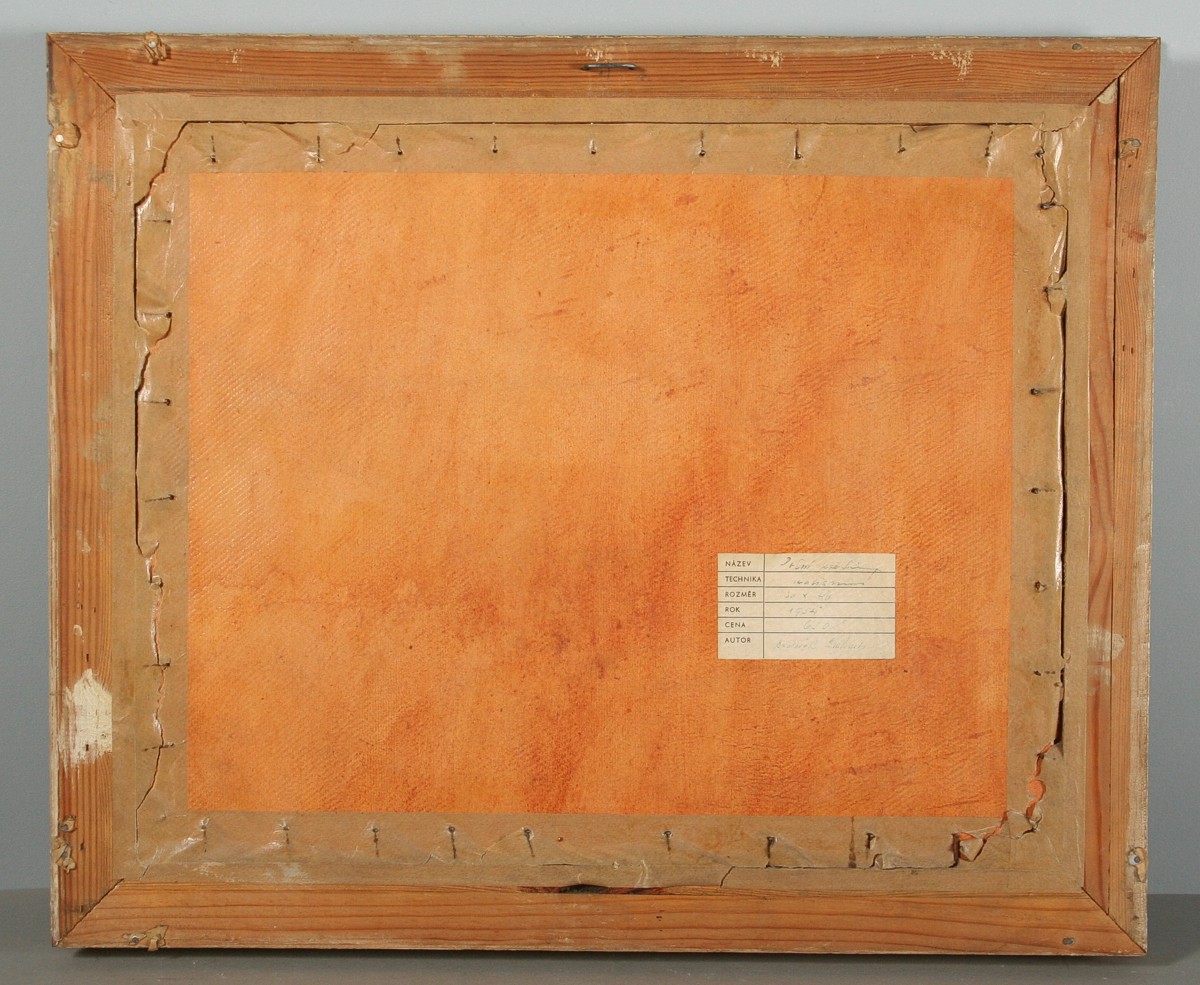 obraz lučních květin, olej na lepence, lepenka 39 x 49 s rámem 50 x 60 cm, autor Bedřich Linhart, podepsáno vpravo dole Bedřich Linhart 1954, vzadu autorský štítek s autodedikací, rámováno v původním rámu pod sklem