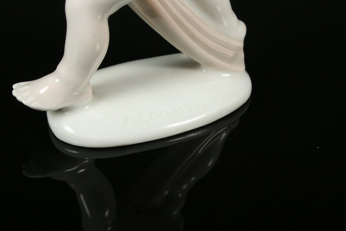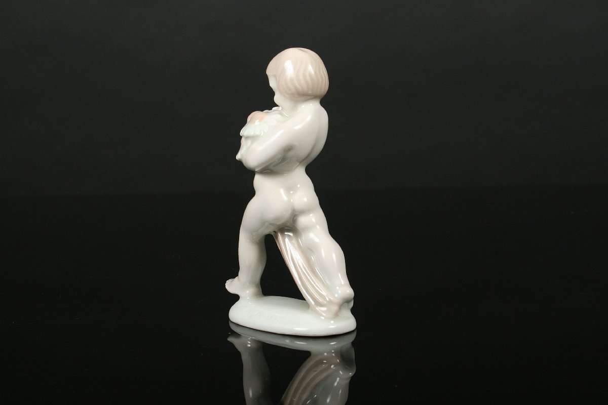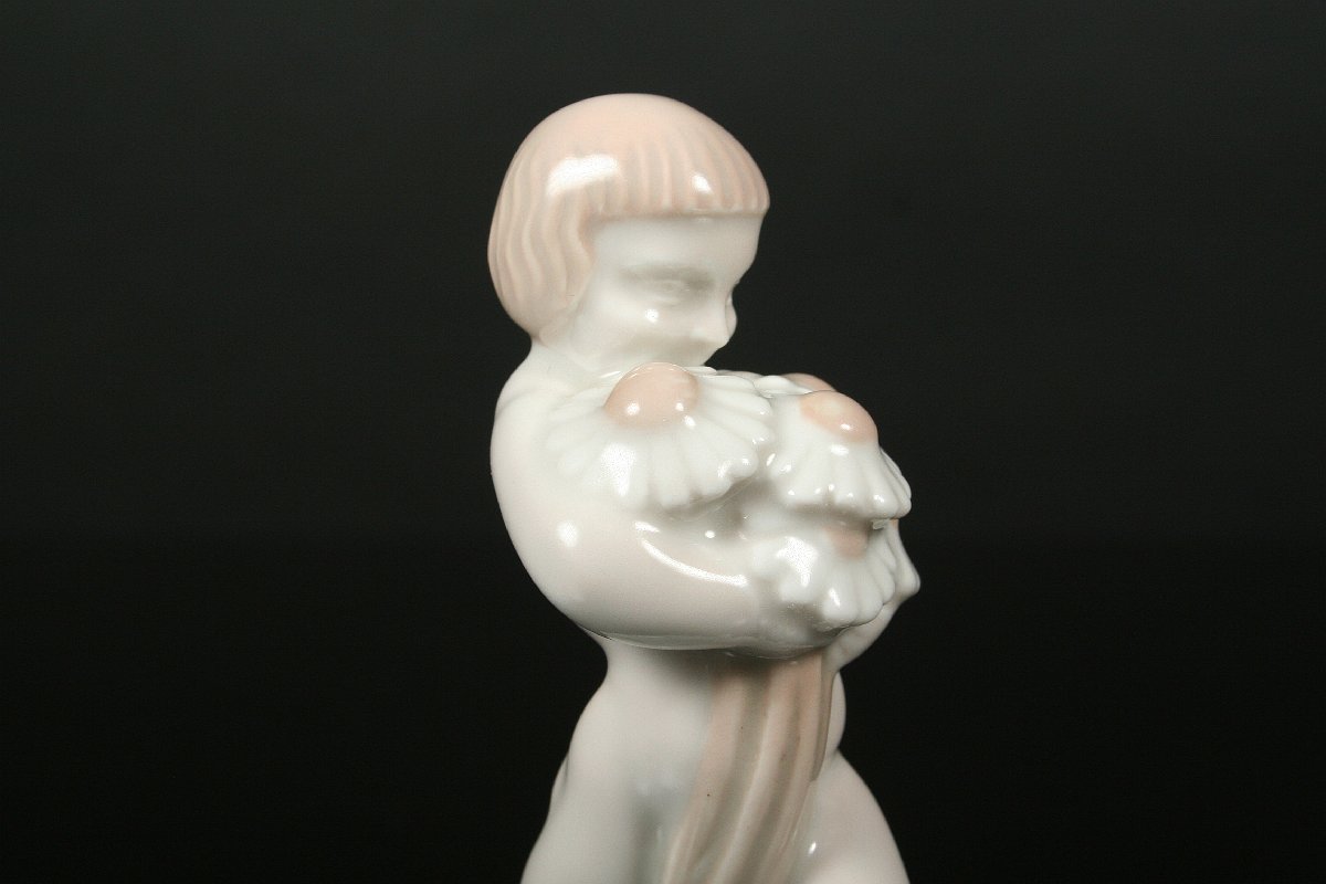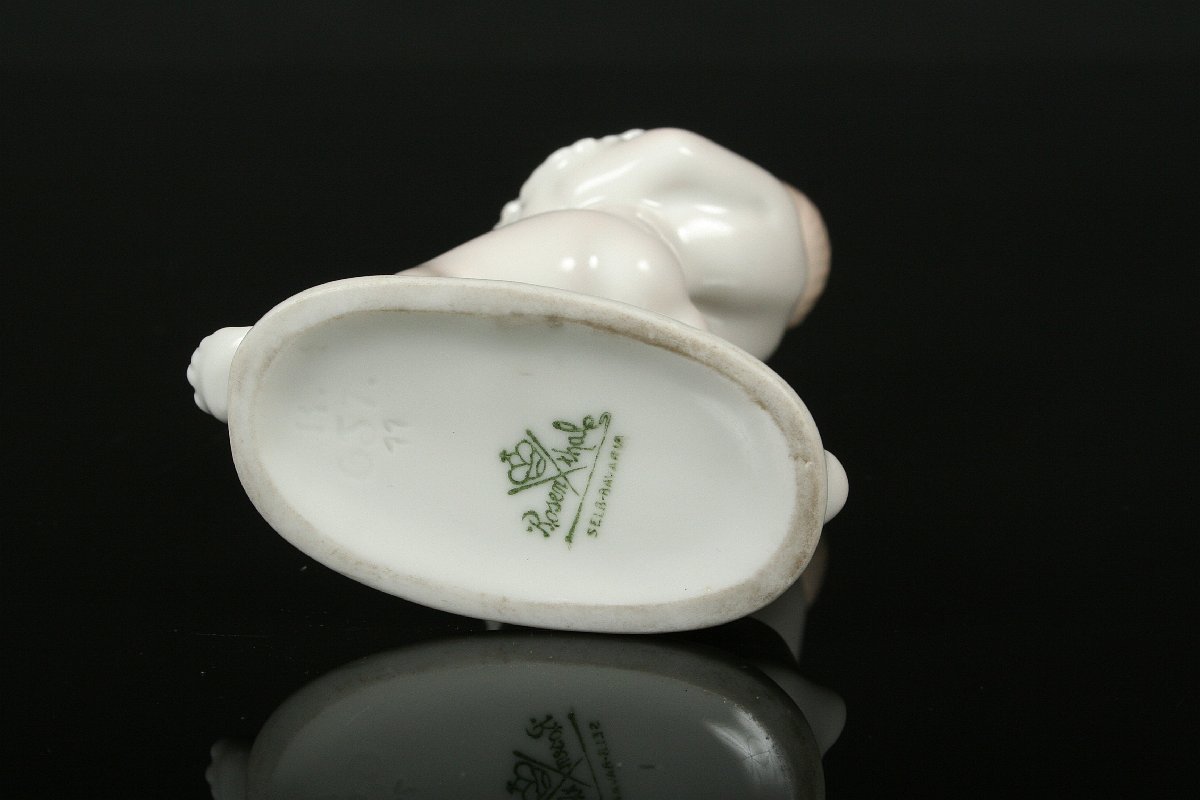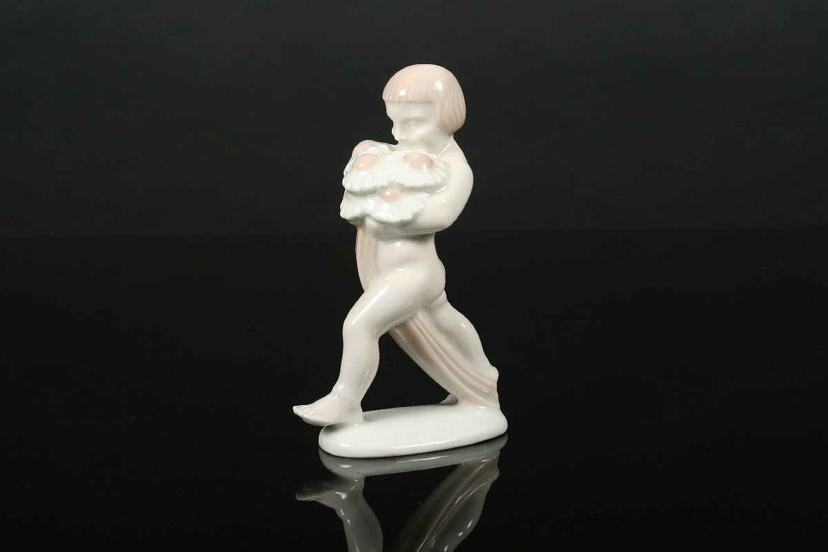 porcelánová figurka děvčátka nesoucí náruč květin, stylizovaně malovaný porcelán na dně značený tištěnou značkou Rosenthal a tlačenými čísly, návrh číslo K. 057, autor Albert Caasmann kolem roku 1915 ve stylu art deco, 1. polovina 20. století, značeno na podstavci tlačené A. Caasmann, 11,5 cm, bez poškození v perfektním stavu