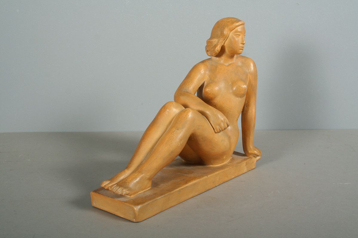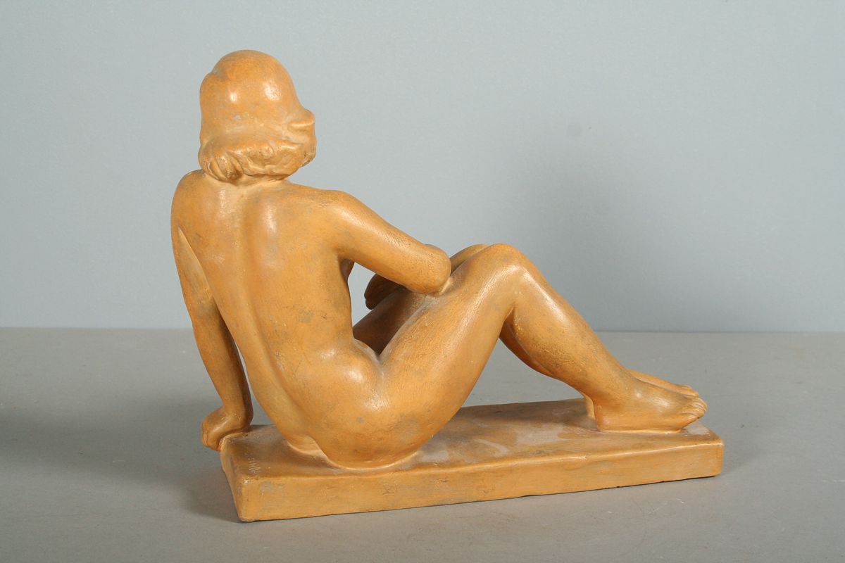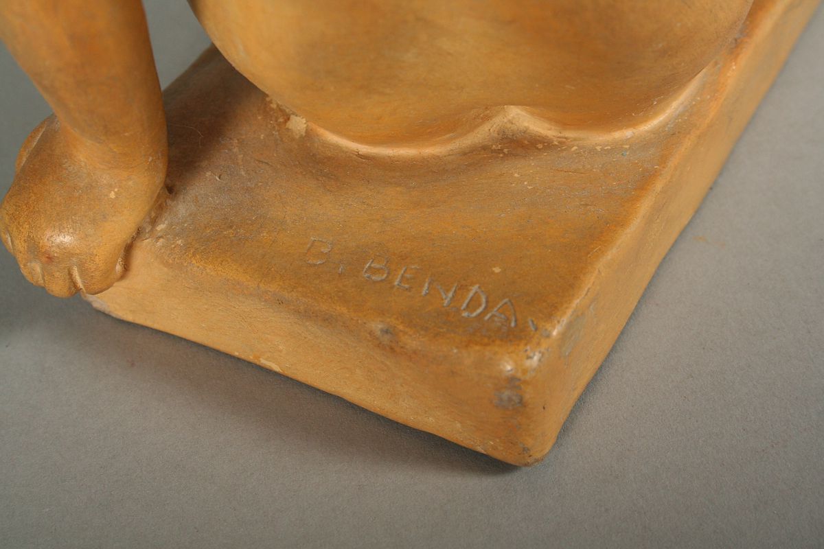 akt sedící dívky, autor Břetislav Benda, pálená hlína, 20 x 24 cm, podepsáno na soklu plastiky B. Benda