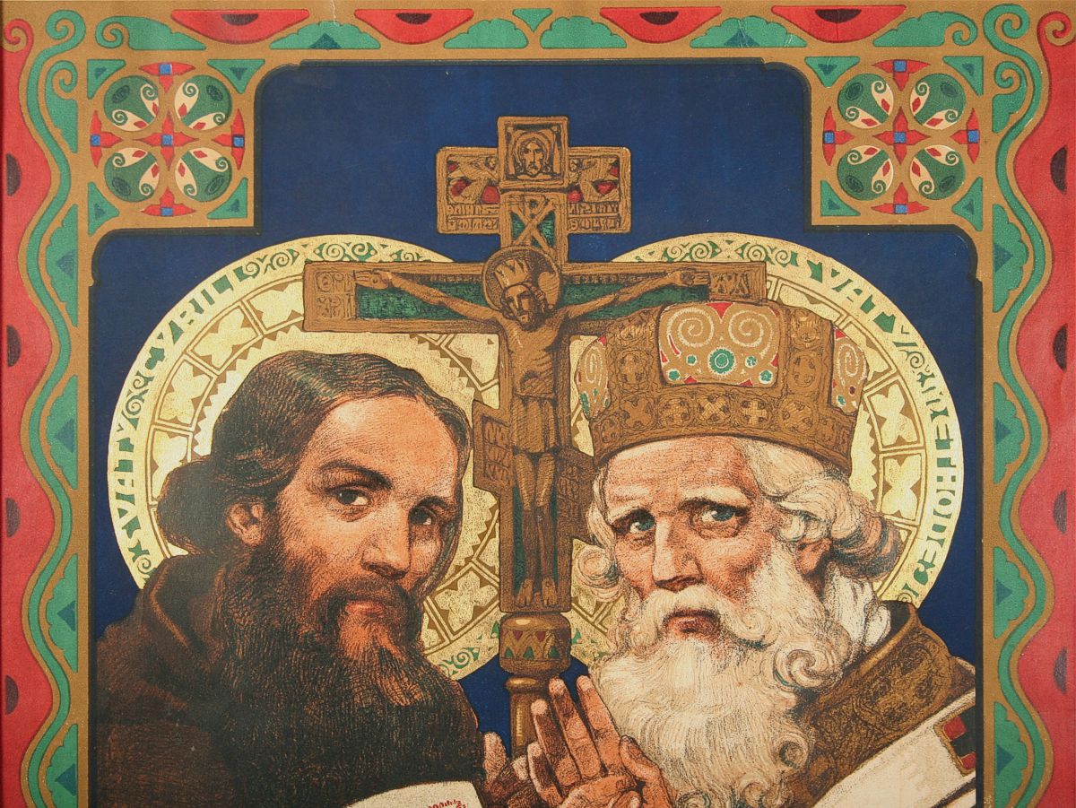 velká barevná litografie Cyrila a Metoděje se zlacenou svatozáří, 78 x 60 cm s rámem 86 x 68 cm, autor Jano Kohler, značeno v pravo dole LITH. Jano Kohler v desce, rámováno pod sklem