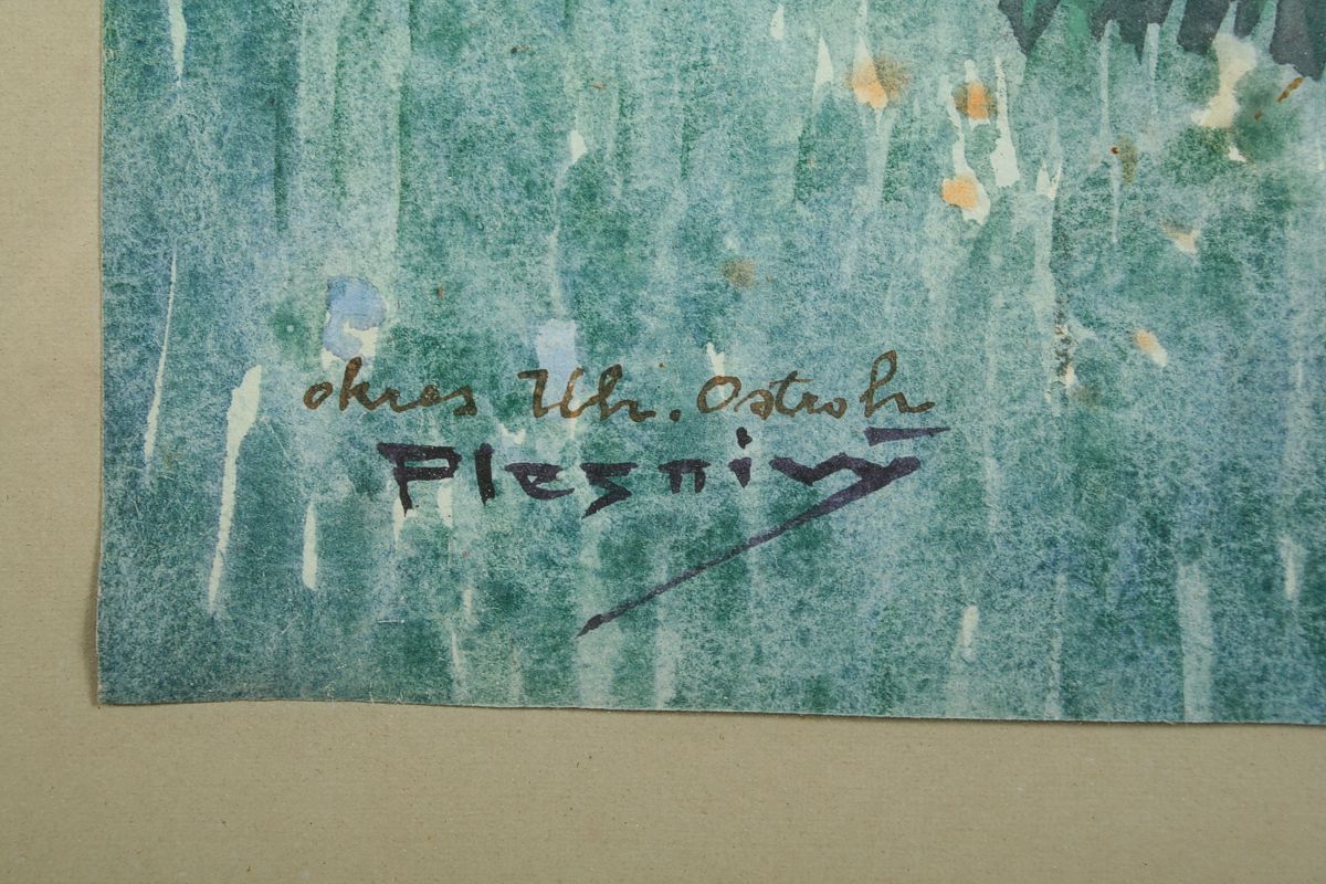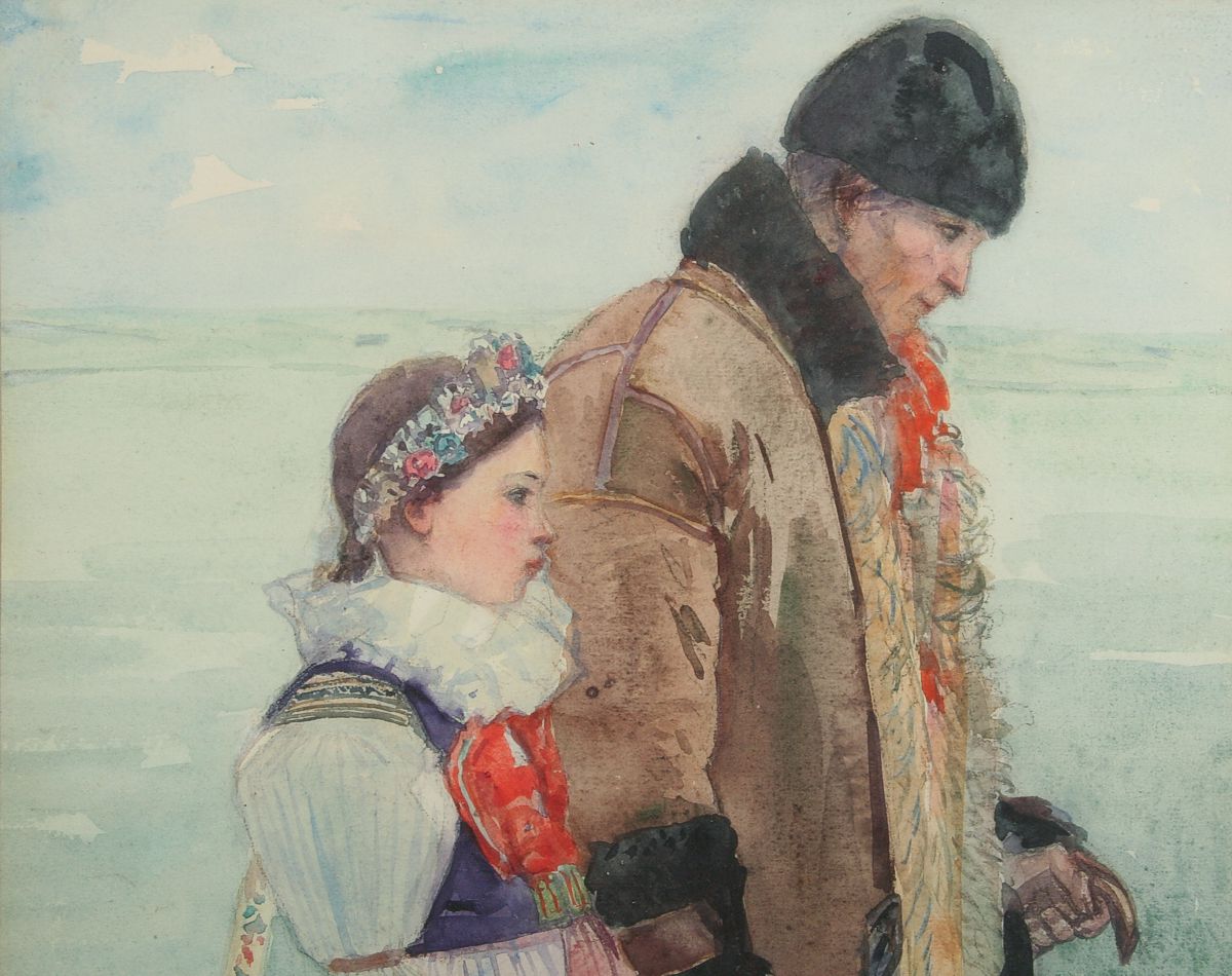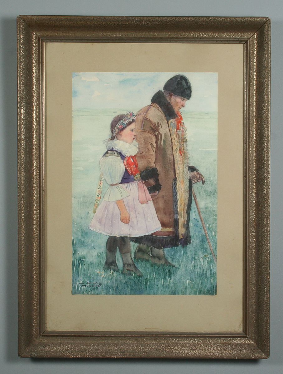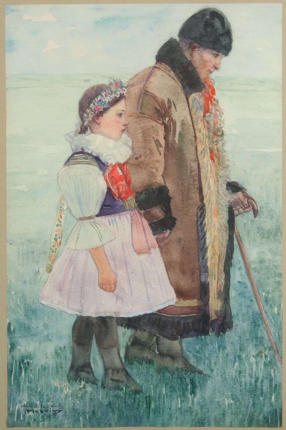 obraz dívky a děda v krajině v moravském lidovém kroji z Uherského ostroha, akvarel na papíře, 50 x 32 cm s rámem 76 x 56 cm, autor Vincent Plesnivý, podepsáno vpravo dole Plesnivý okr. Uh. Ostroh, rámováno v původním rámu pod sklem