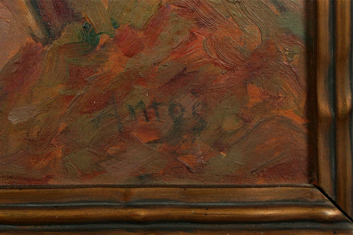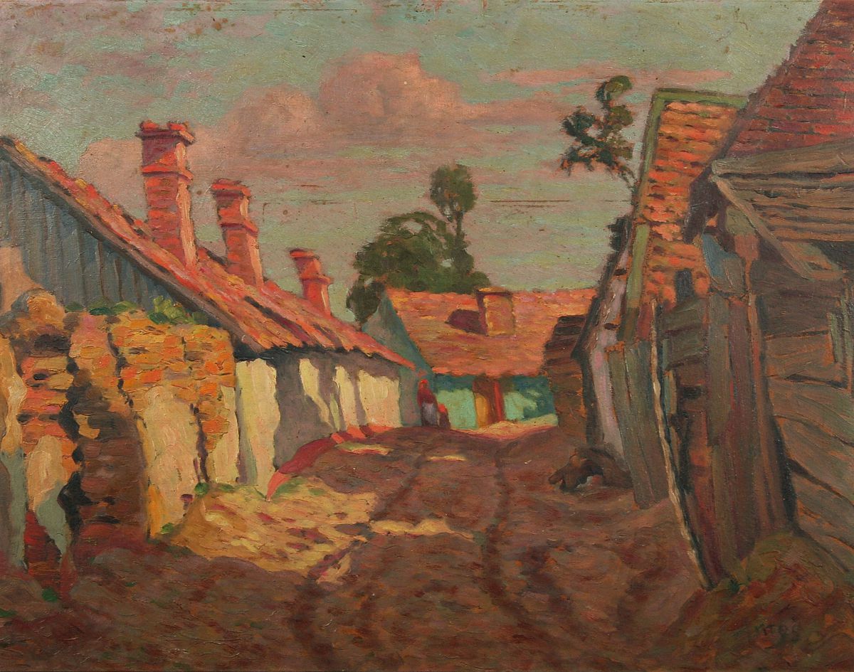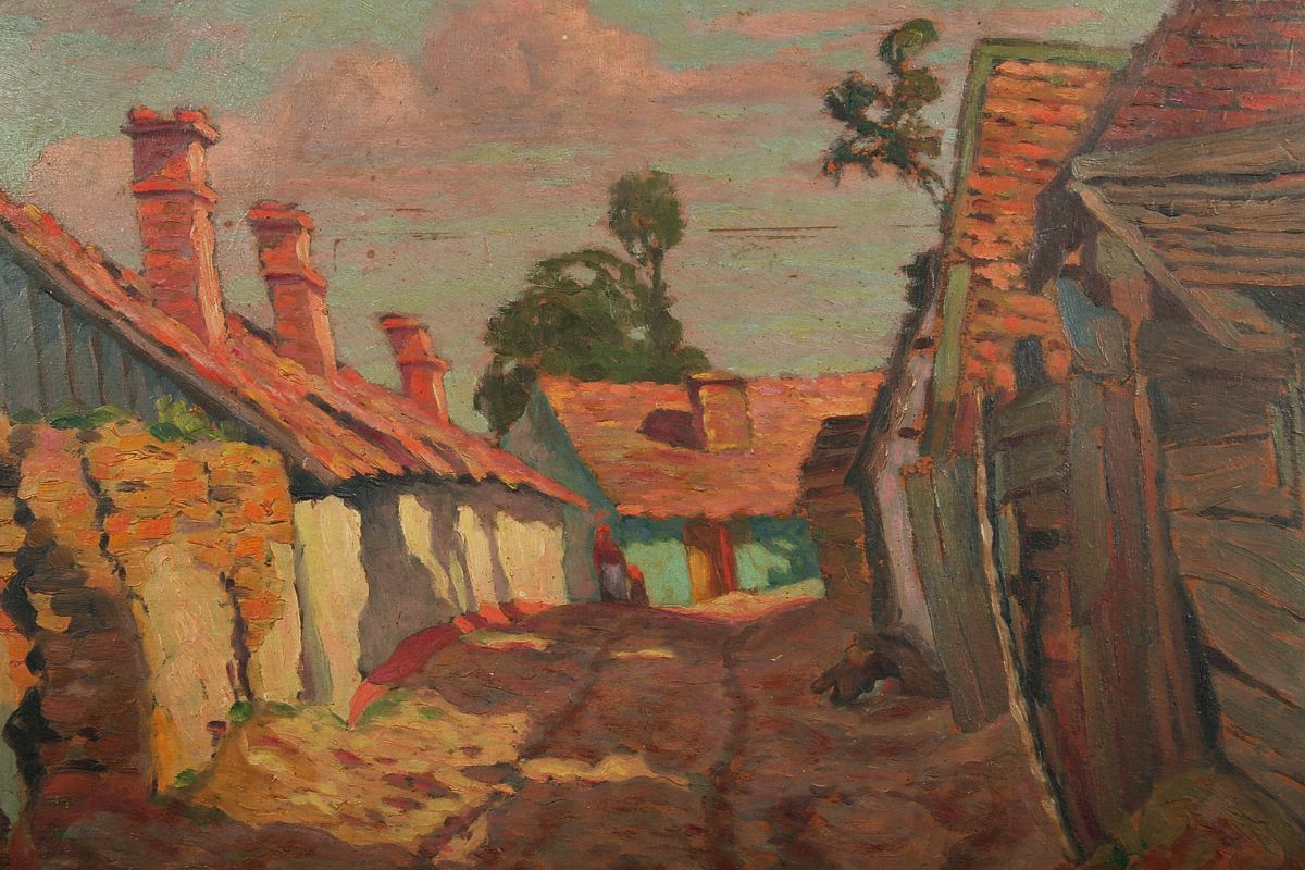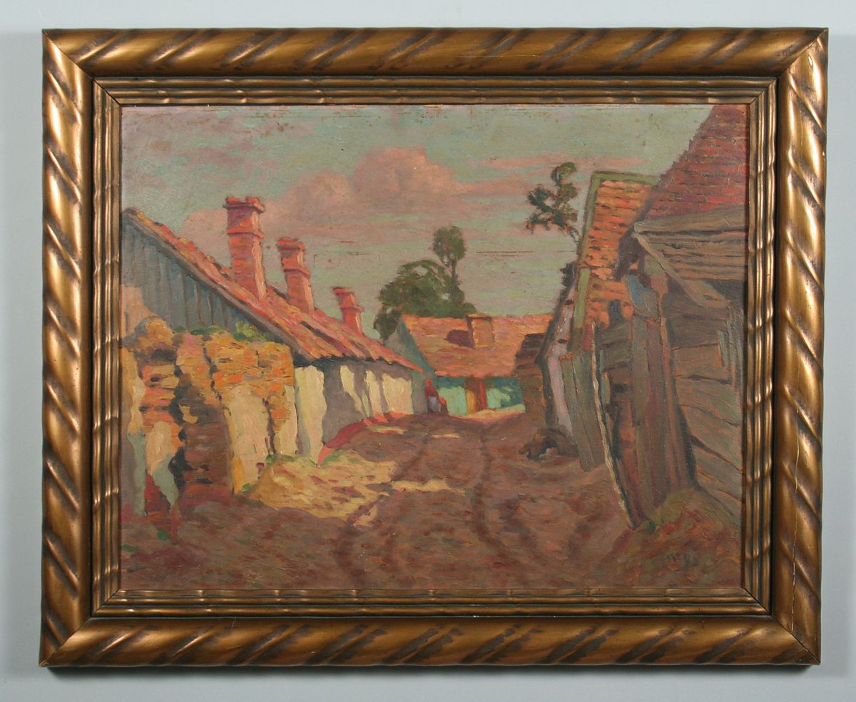 obraz slovenské vesnice při západu slunce, olej na kartonu, 50 x 65 cm s rámem 65 x 80 cm, autor Josef Antoš, podepsáno vpravo dole Antoš, rámováno v původním zlaceném rámu