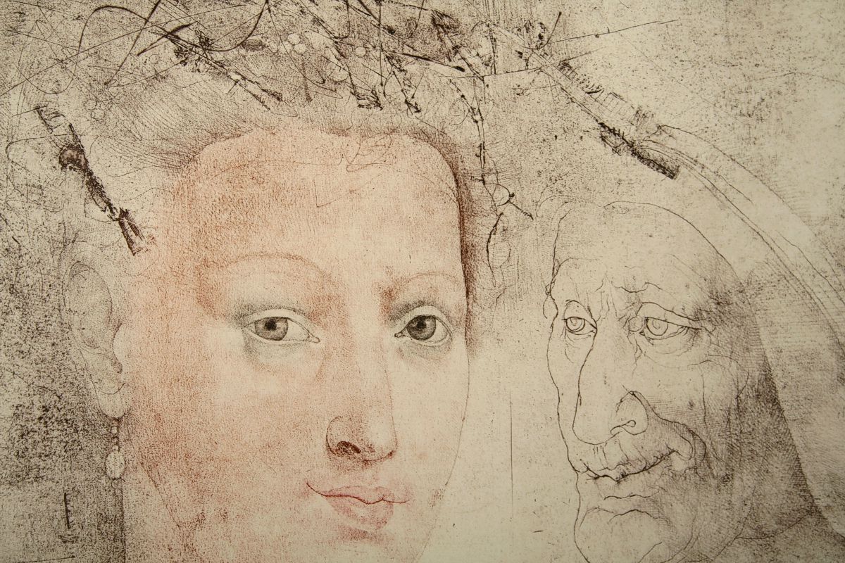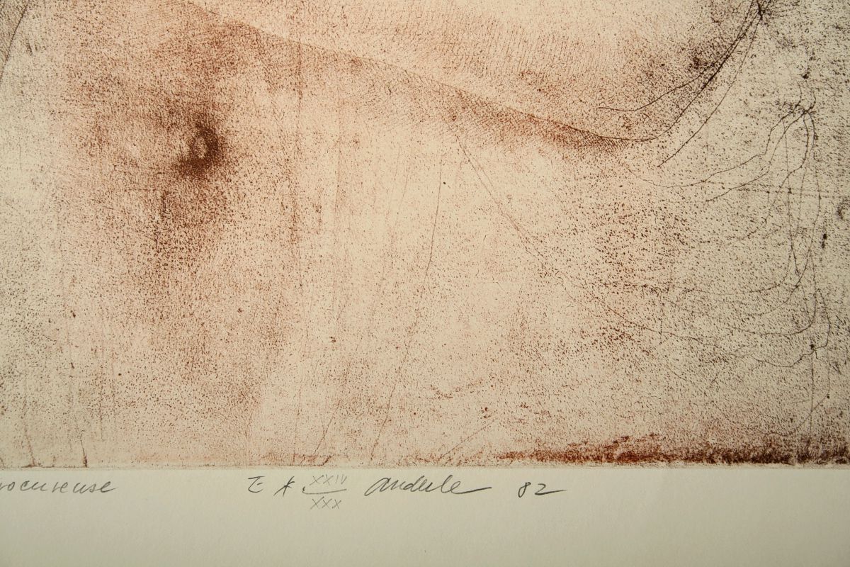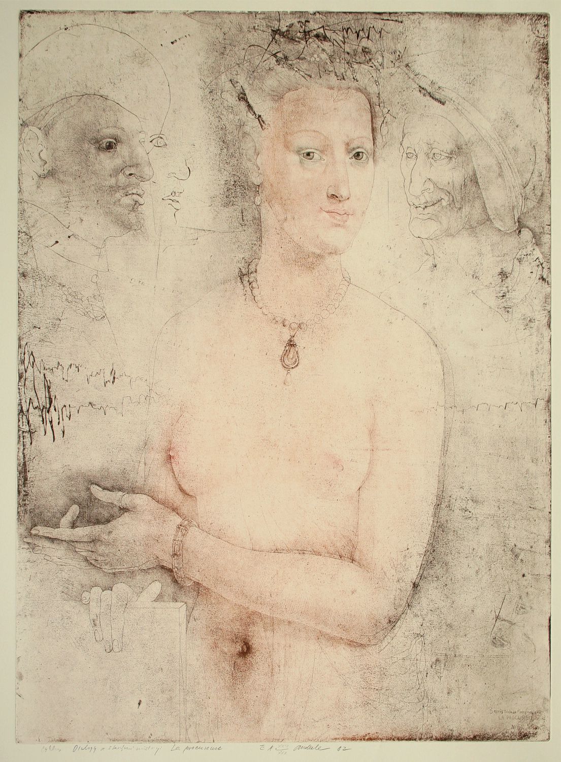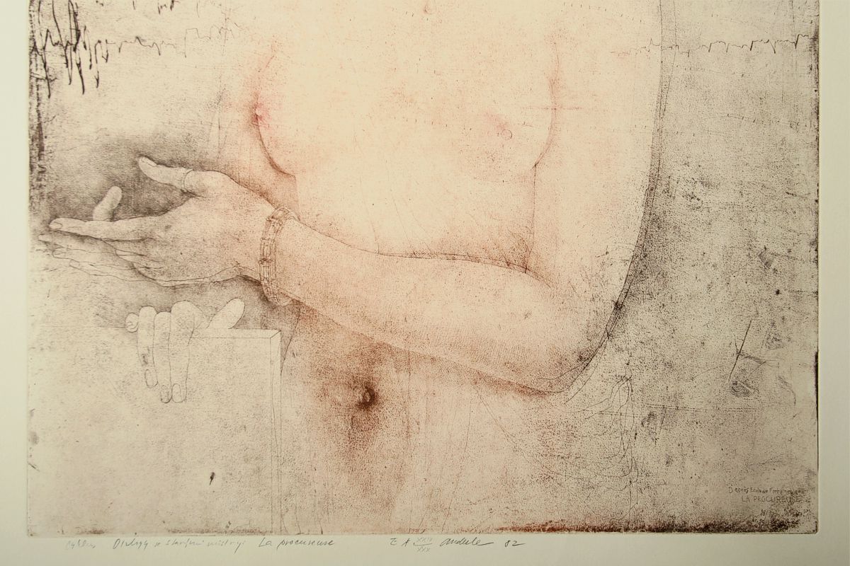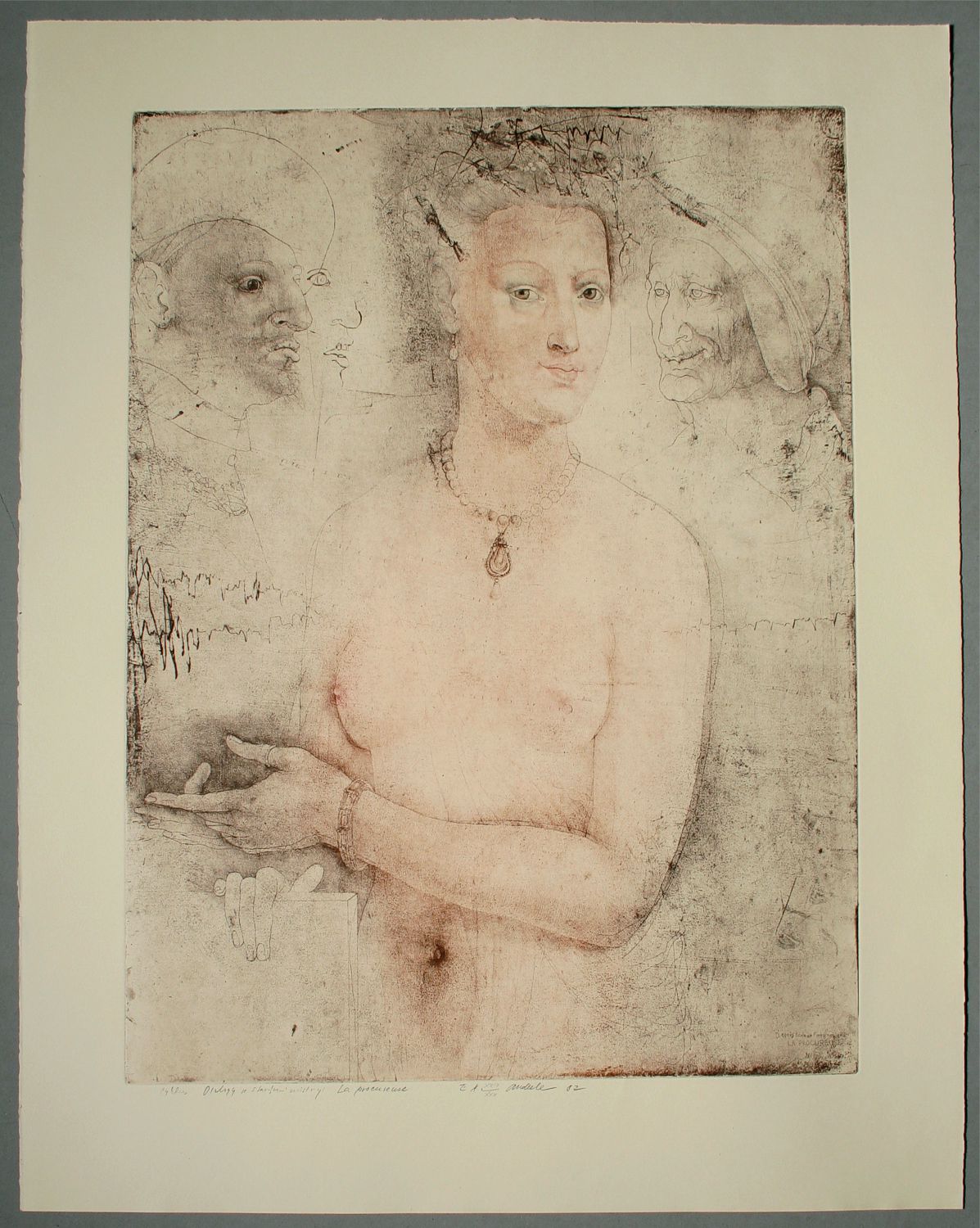 velká originální původní grafika z 80. let, La procureuse (prokurátor) z cyklu dialogy se starými mistry, autor Jiří Anderle, ruční papír s vodotiskem HOLLAND, 81,5 x 64 cm, rozměr tiskové plochy 66 x 49,5 cm, barevný lept suchá jehla mezotinta, podepsáno vlastní rukou tužkou Anderle 82 a přípis, volný list, zcela původní a originální práce světově známého autora pocházející od sběratele jež se osobně přátelil s autorem