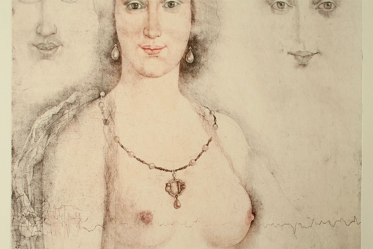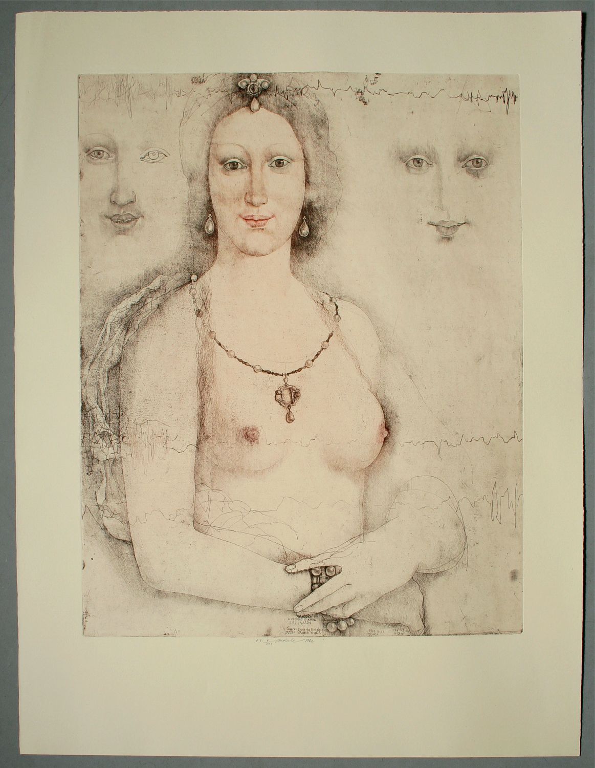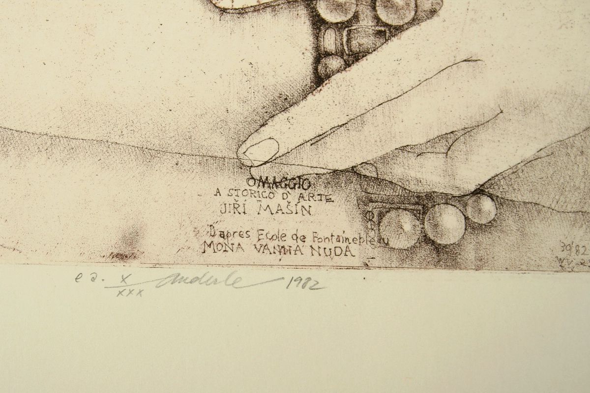 velká originální původní grafika z 80. let, Mona Vanna Nuda z cyklu dialogy se starými mistry, autor Jiří Anderle, ruční papír s vodotiskem HOLLAND, 82 x 64 cm, rozměr tiskové plochy 61,5 x 50 cm, barevný lept suchá jehla mezotinta, podepsáno vlastní rukou tužkou Anderle 1982 a přípis, volný list, zcela původní a originální práce světově známého autora pocházející od sběratele jež se osobně přátelil s autorem