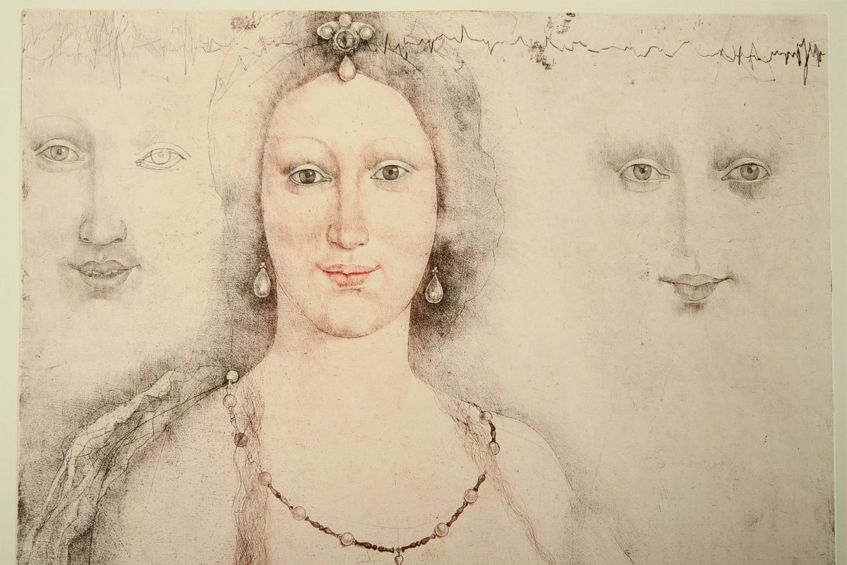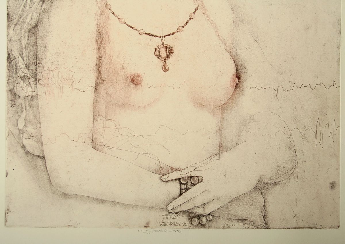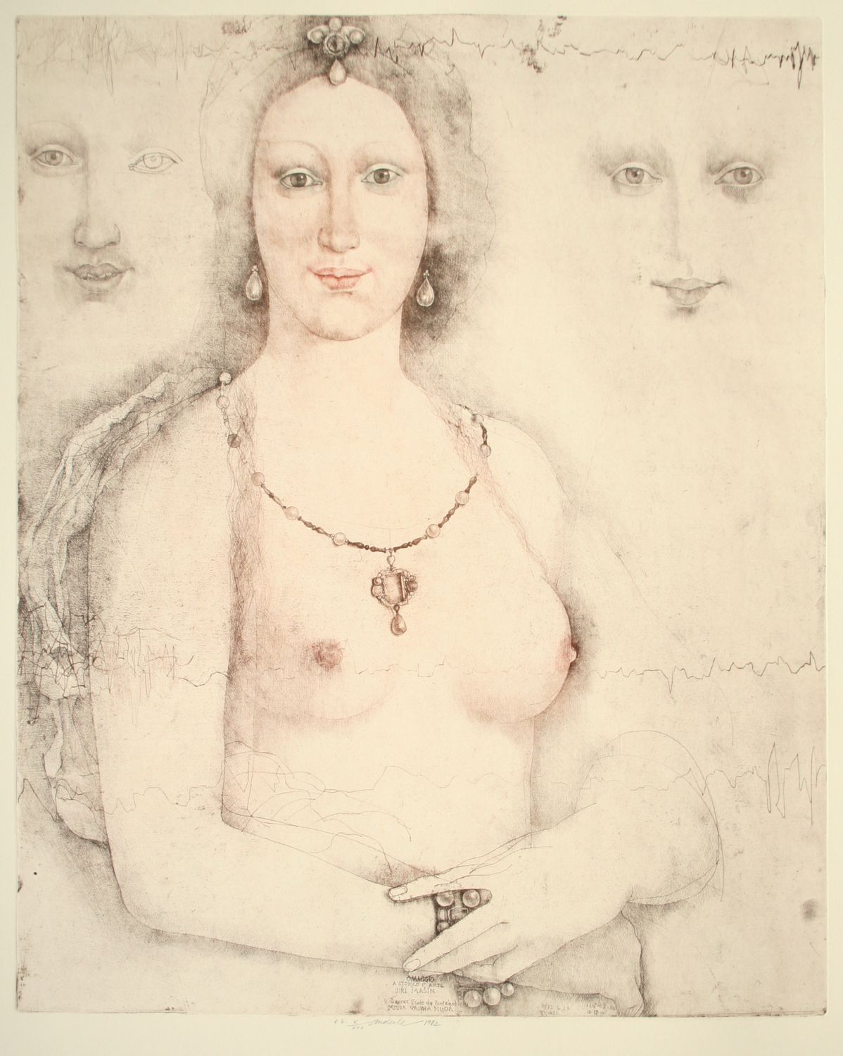 velká originální původní grafika z 80. let, Mona Vanna Nuda z cyklu dialogy se starými mistry, autor Jiří Anderle, ruční papír s vodotiskem HOLLAND, 82 x 64 cm, rozměr tiskové plochy 61,5 x 50 cm, barevný lept suchá jehla mezotinta, podepsáno vlastní rukou tužkou Anderle 1982 a přípis, volný list, zcela původní a originální práce světově známého autora pocházející od sběratele jež se osobně přátelil s autorem