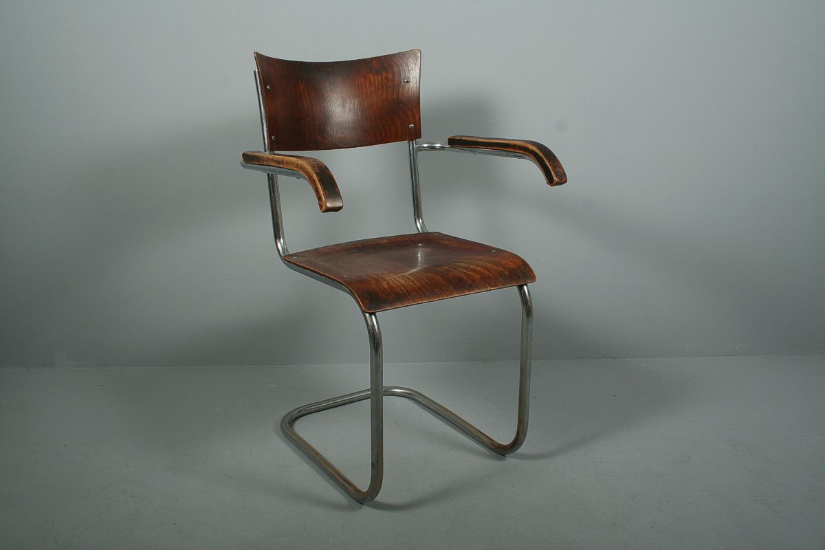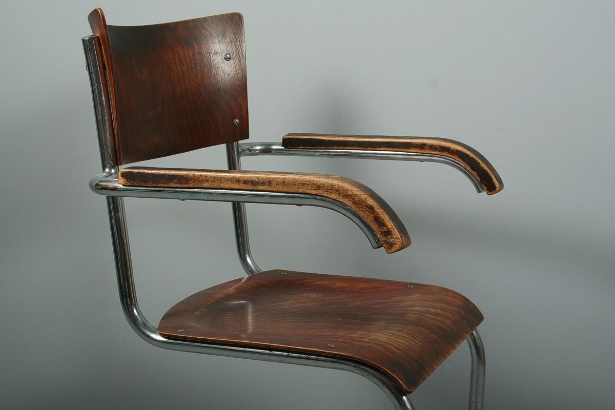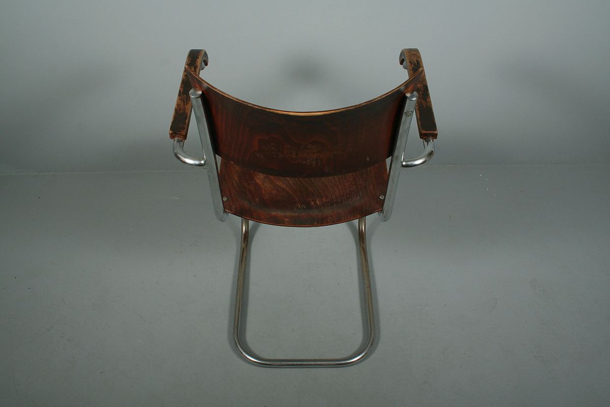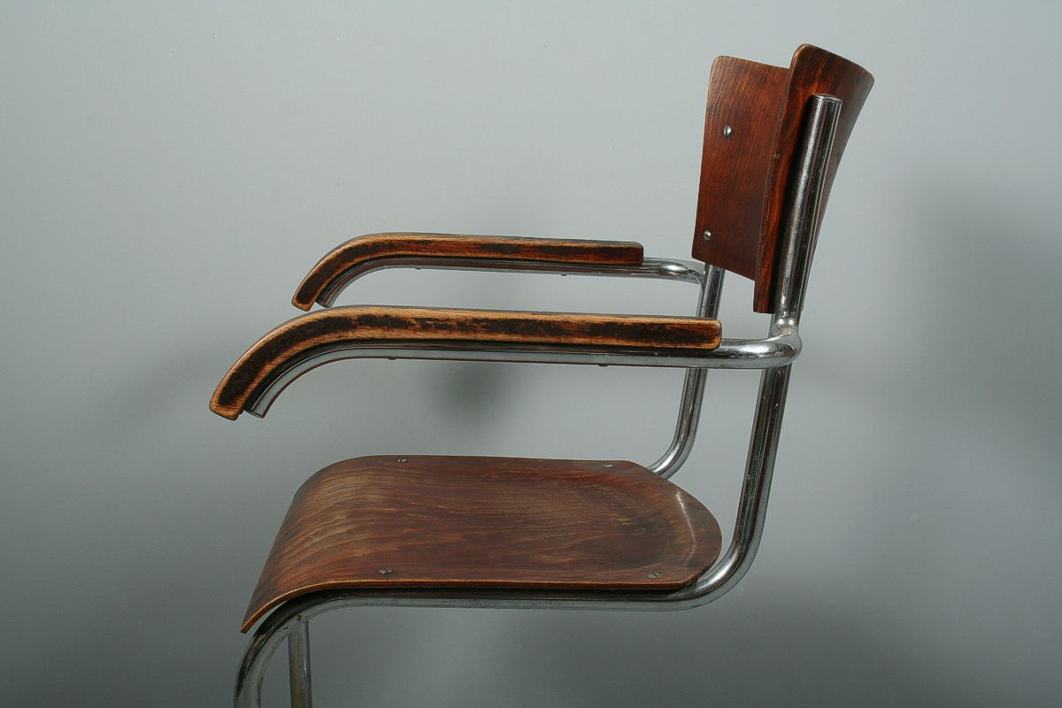 trubková židle s područkami / polokřesílko, dřevěný sedák, opěrák a područky na kostře z tenké chromované trubky, značeno kovovým cvočkem Mücke Melder, Fryštát ČSR, 20.-30. léta 20. století, 83 × 39 × 40 cm, zcela původní stav