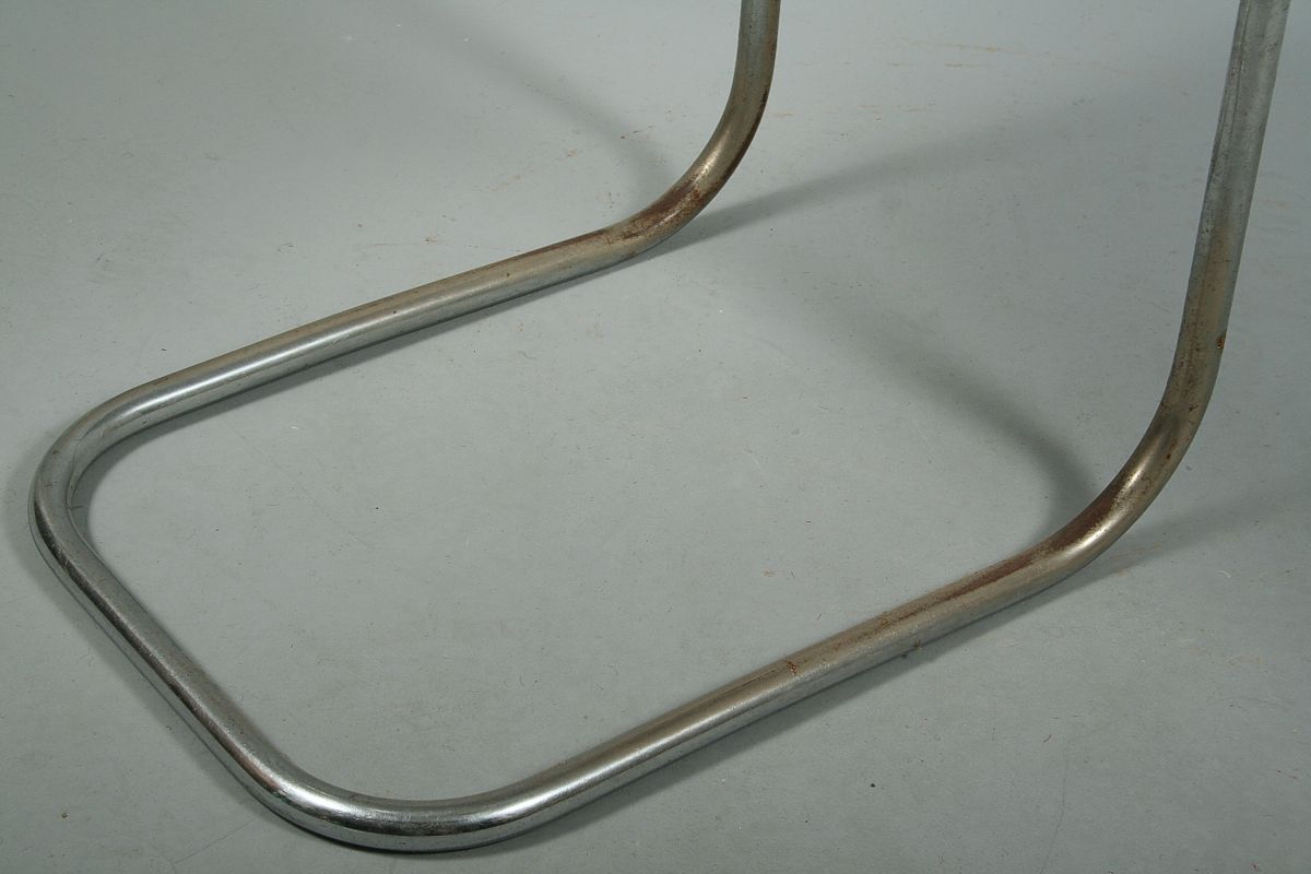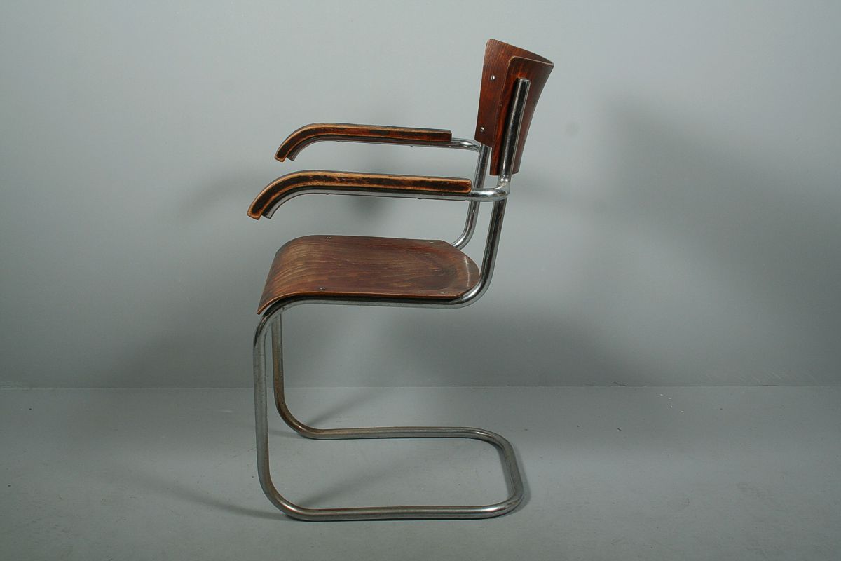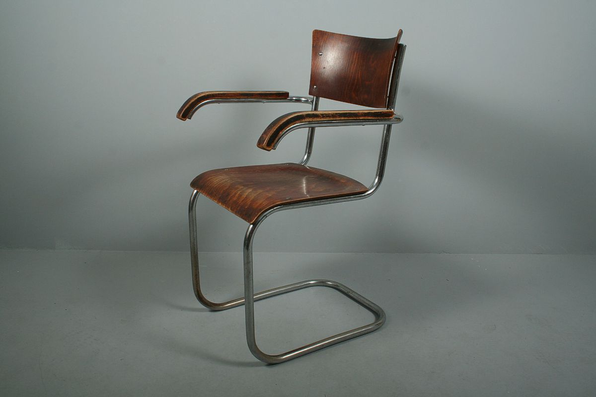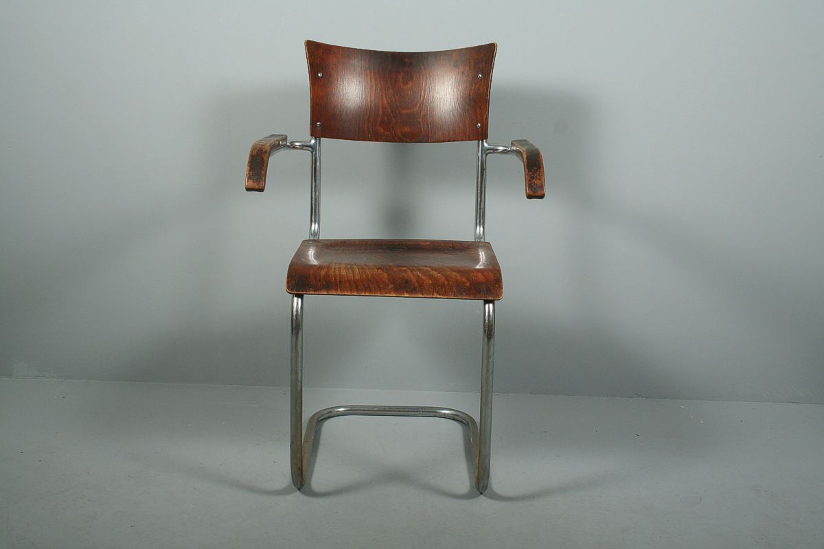 trubková židle s područkami / polokřesílko, dřevěný sedák, opěrák a područky na kostře z tenké chromované trubky, značeno kovovým cvočkem Mücke Melder, Fryštát ČSR, 20.-30. léta 20. století, 83 × 39 × 40 cm, zcela původní stav