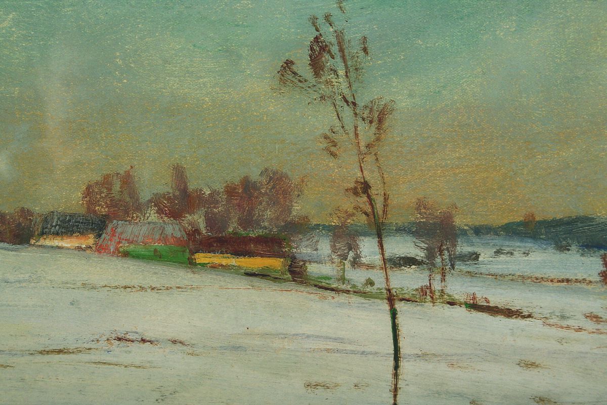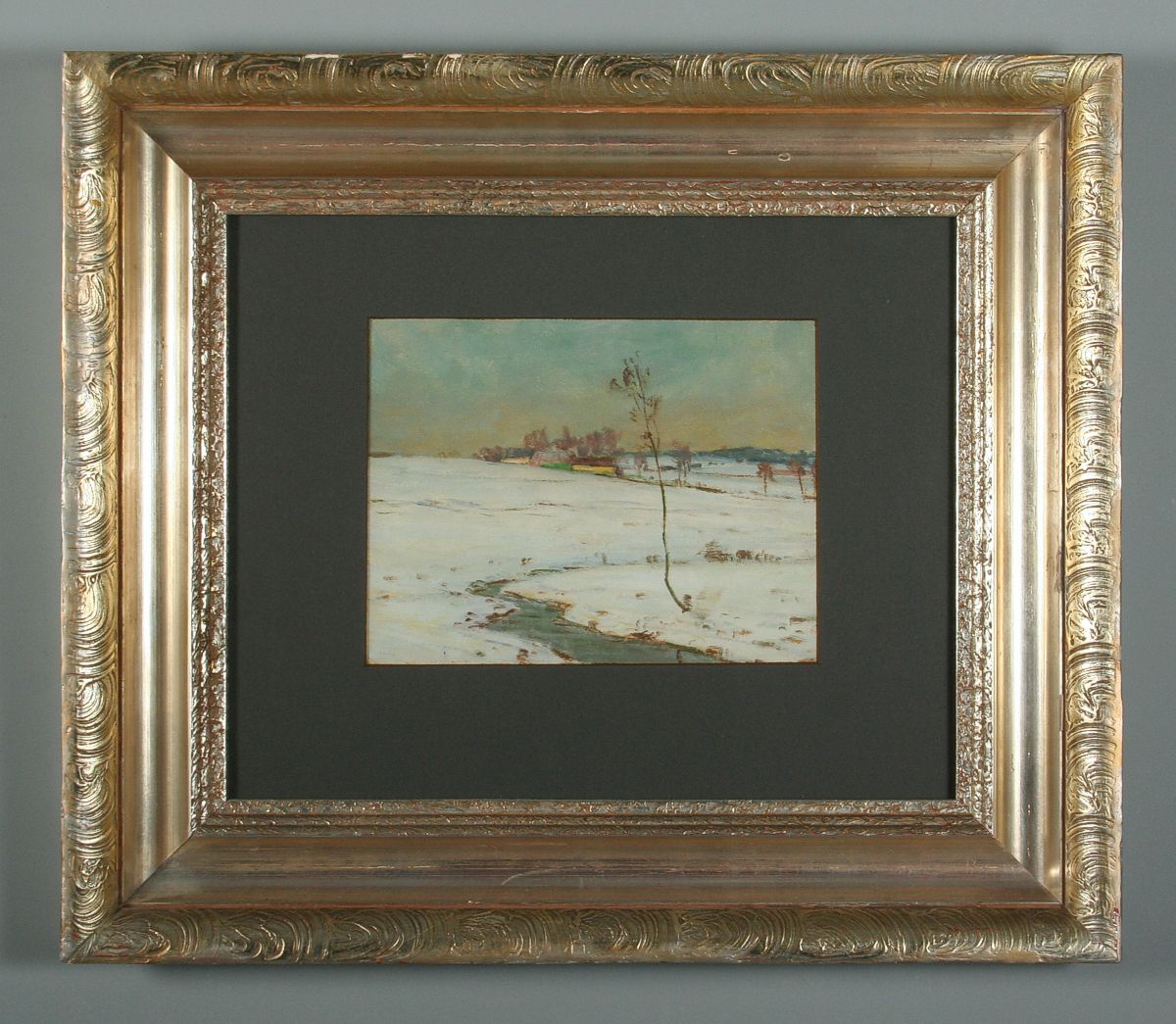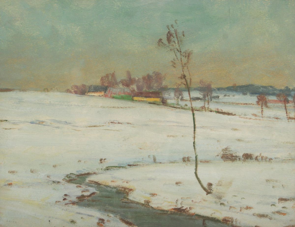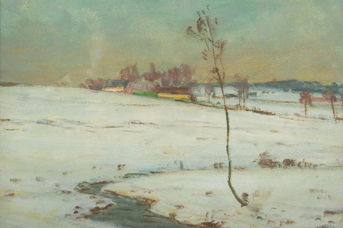 obraz zimní krajiny s potůčkem z okolí Vítanova, olej na kartonu, 23 x 30 cm s rámem 59 x 68 cm, autor František Kaván, podepsáno v malbě v levo dole Kaván, konzultováno a určeno s datací kolem roku 1915 z okolí Vítanova PhDr. Michalem Zachařem, rámováno v původní paspartě a rámu pod sklem
