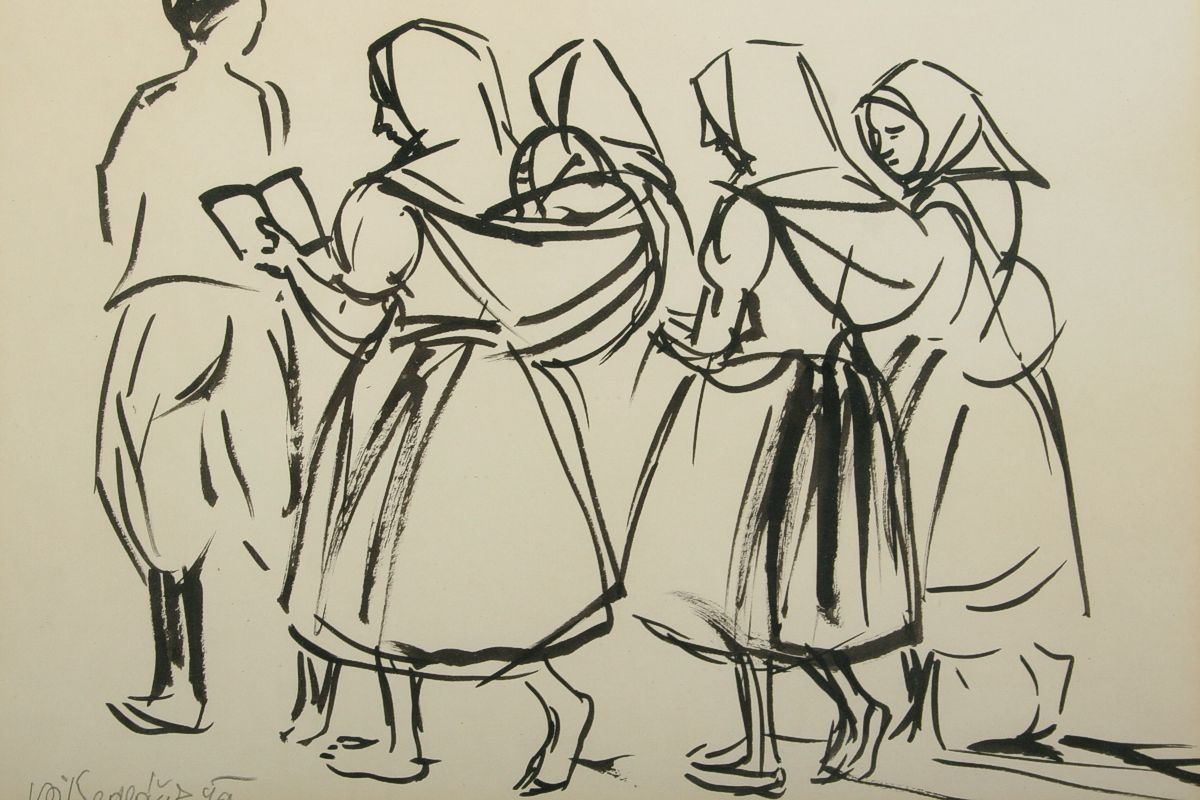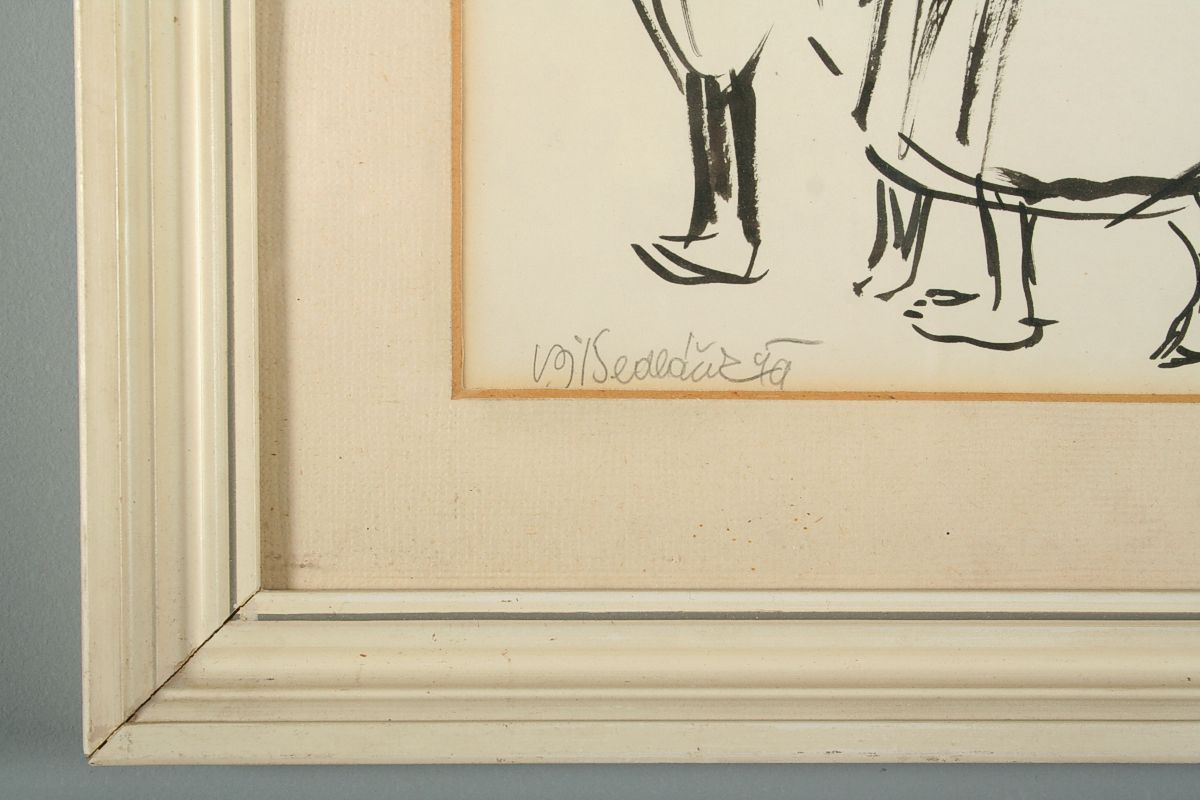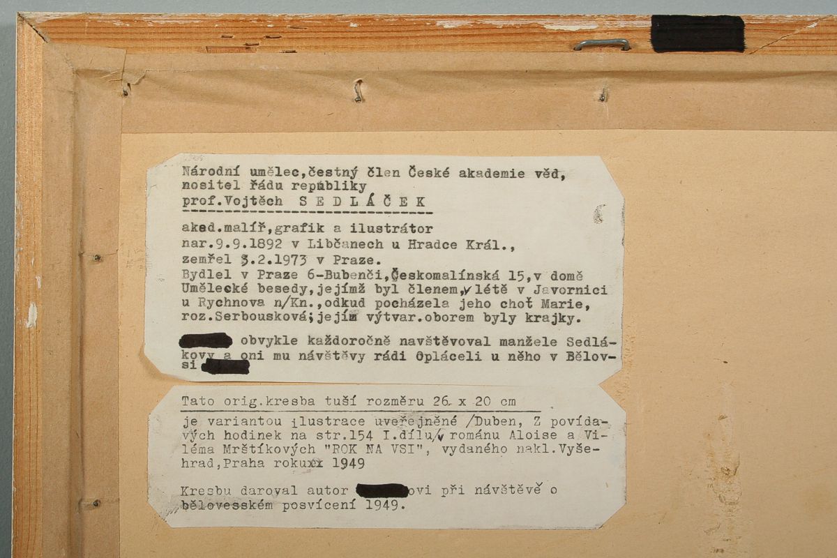 varianta ilustrace z Roku na vsi, kresba tuší na papíře 26x 20 cm s rámem 30 x 36 cm, autor Vojtěch Sedláček, podepsáno tužkou vlevo dole Vojt. Sedláček 49, na zadní straně přípis s dedikací, rámováno v paspartě pod sklem