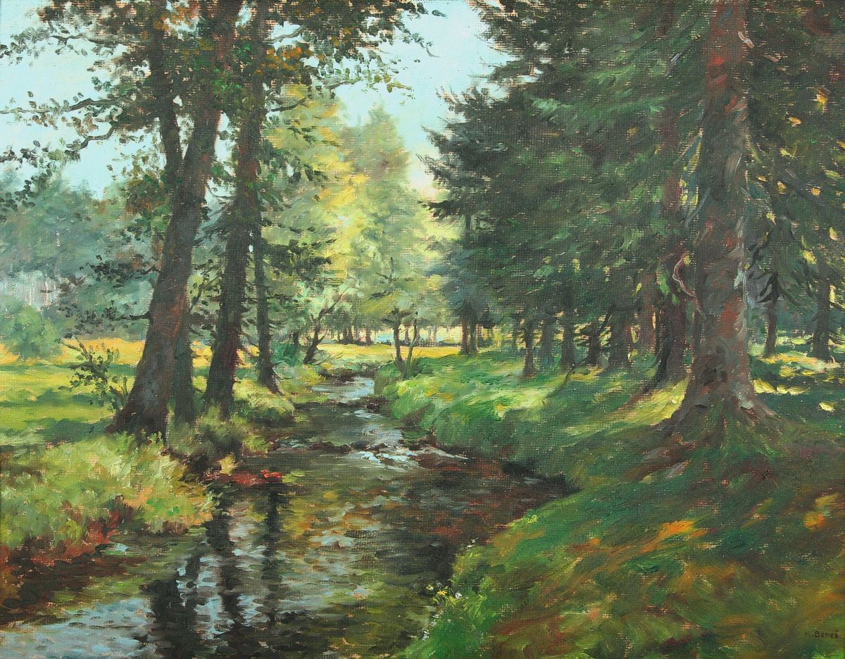 obraz protékající říčky Chrudimky letní krajinou u Ovčína, olej na kartonu, 33 x 43 cm s rámem 51 x 61 cm, autor Karel Beneš, podepsáno vlevo dole K. Beneš na zadní straně autorský přípis, rámováno ve zdobeném rámu