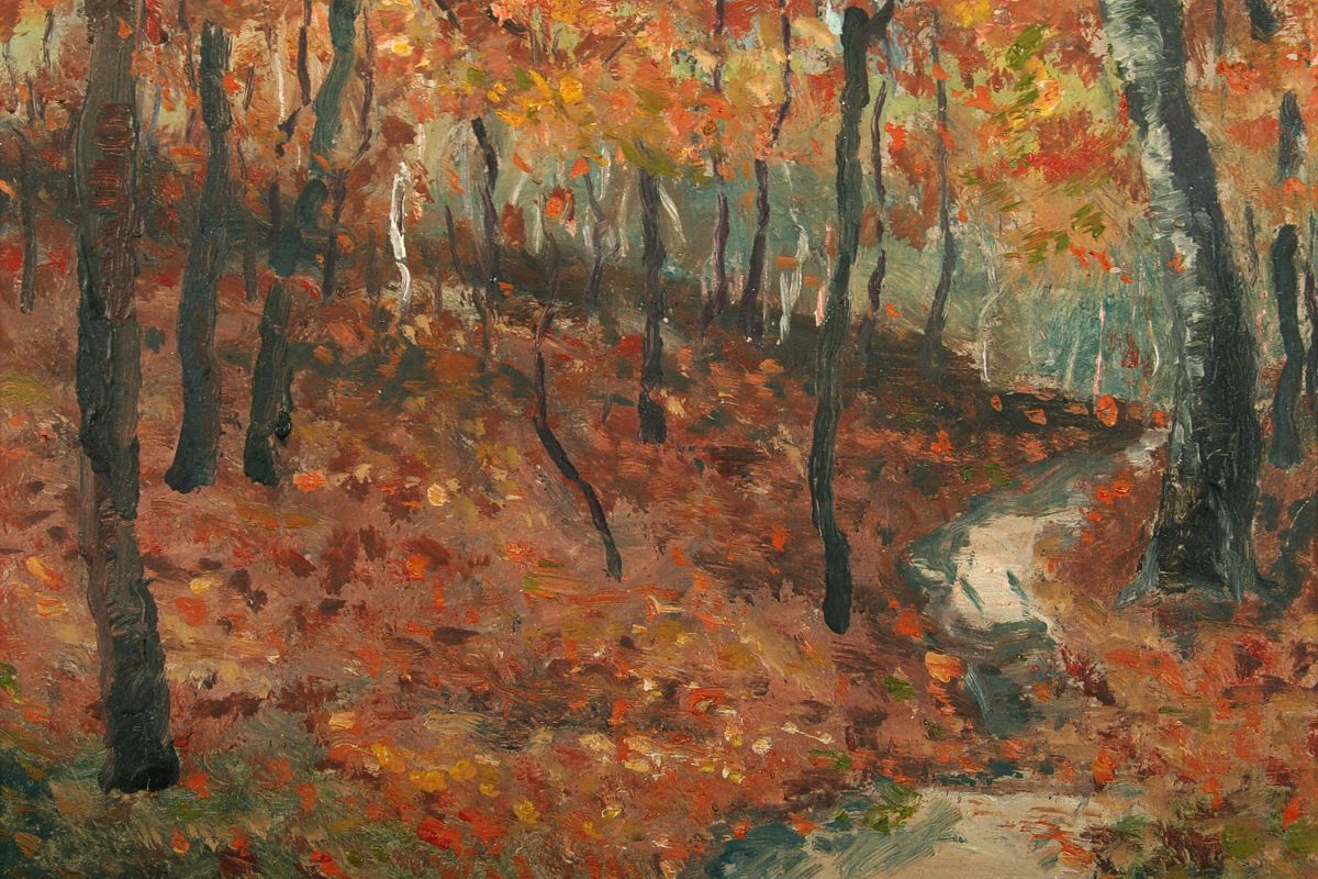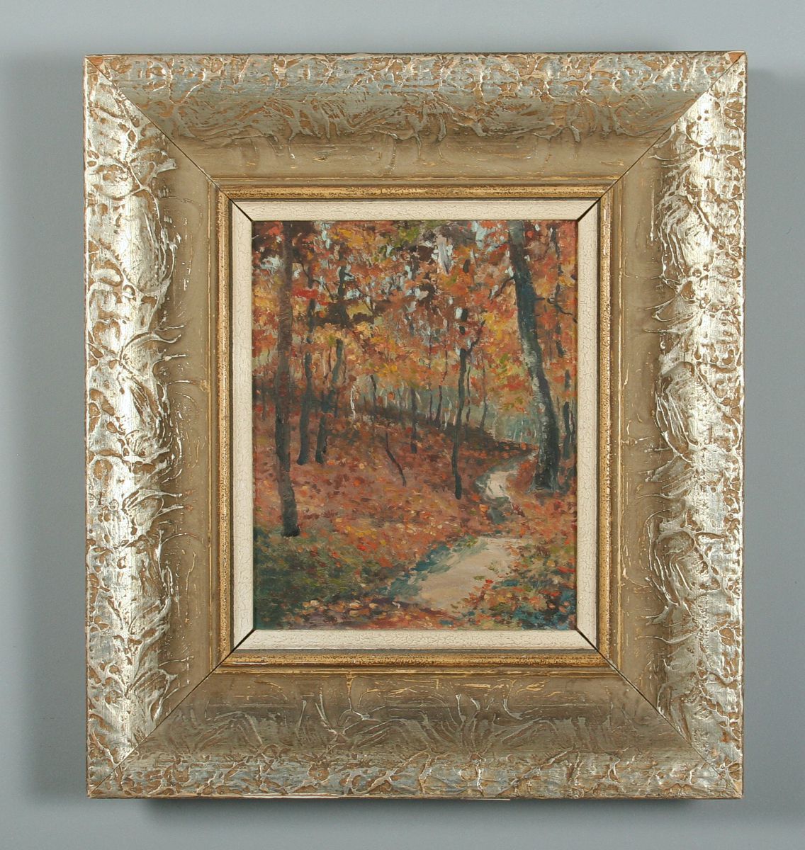 obraz podzimní krajiny v listnatém parku, olej na kartonu, 26 x 20 cm s rámem 45 x 40 cm, autor Stanislav Feikl, maloval pod silným vlivem A. Slavíčka, což tento obraz jen dokládá, podepsáno vpravo dole Feikl, rámováno v původním stříbřeném rámu