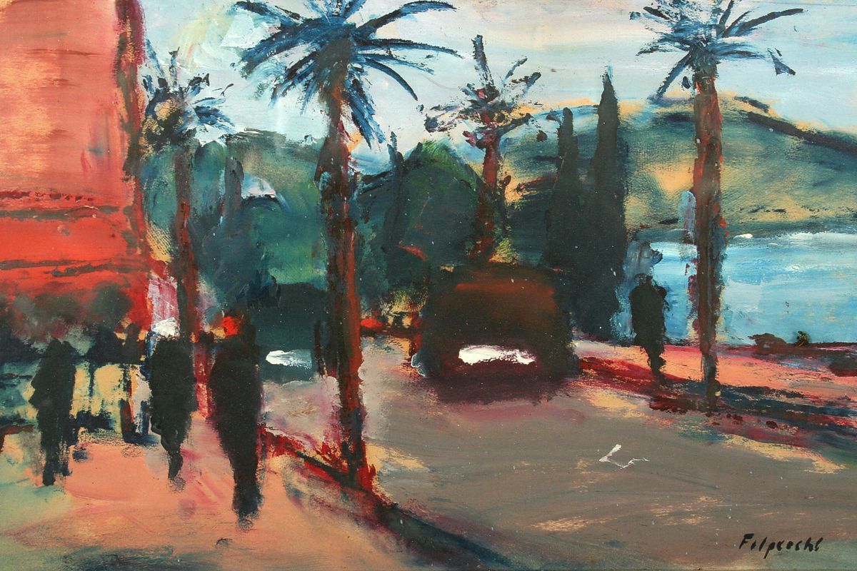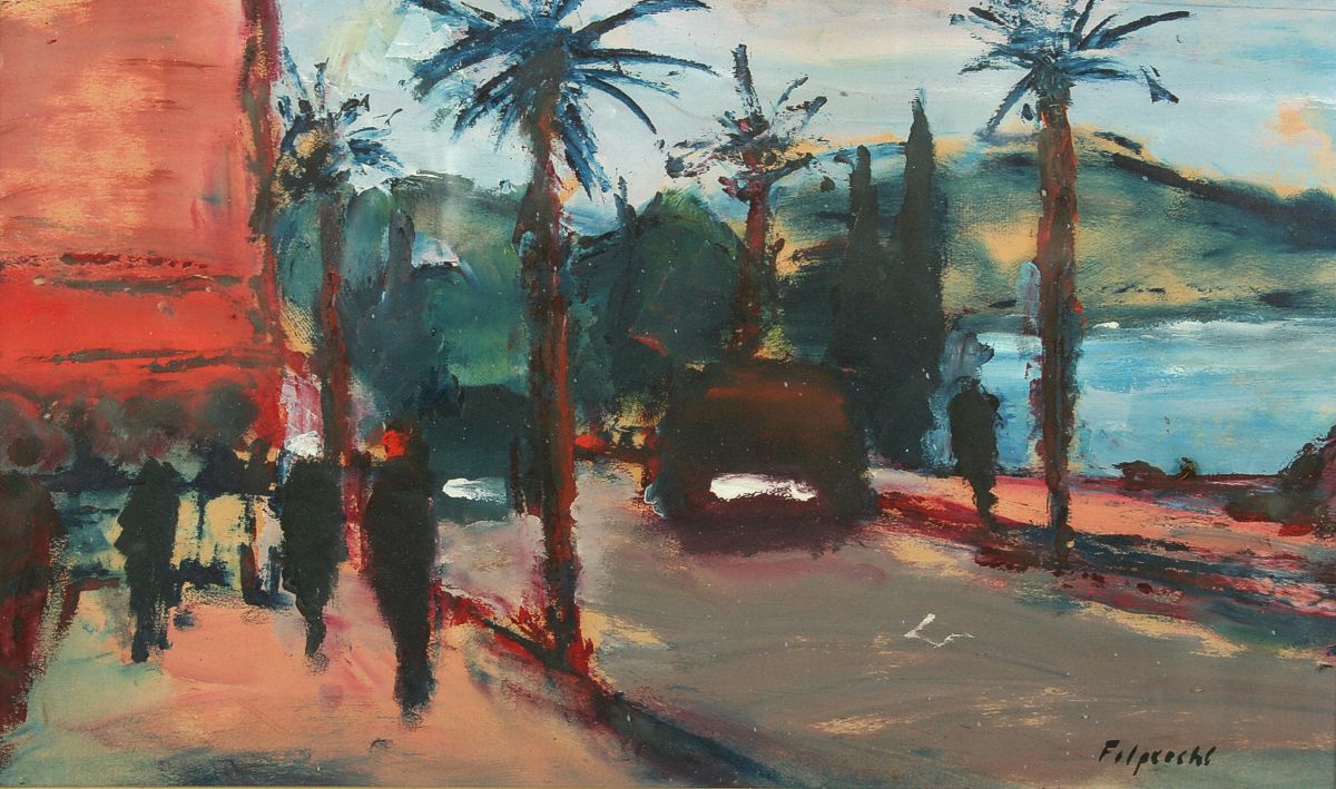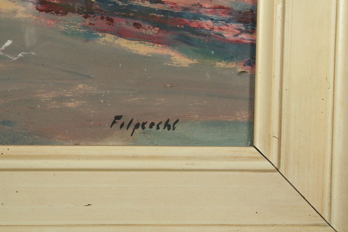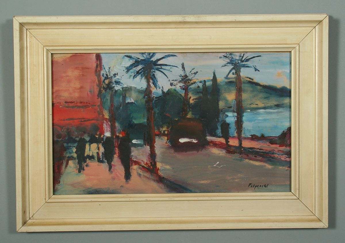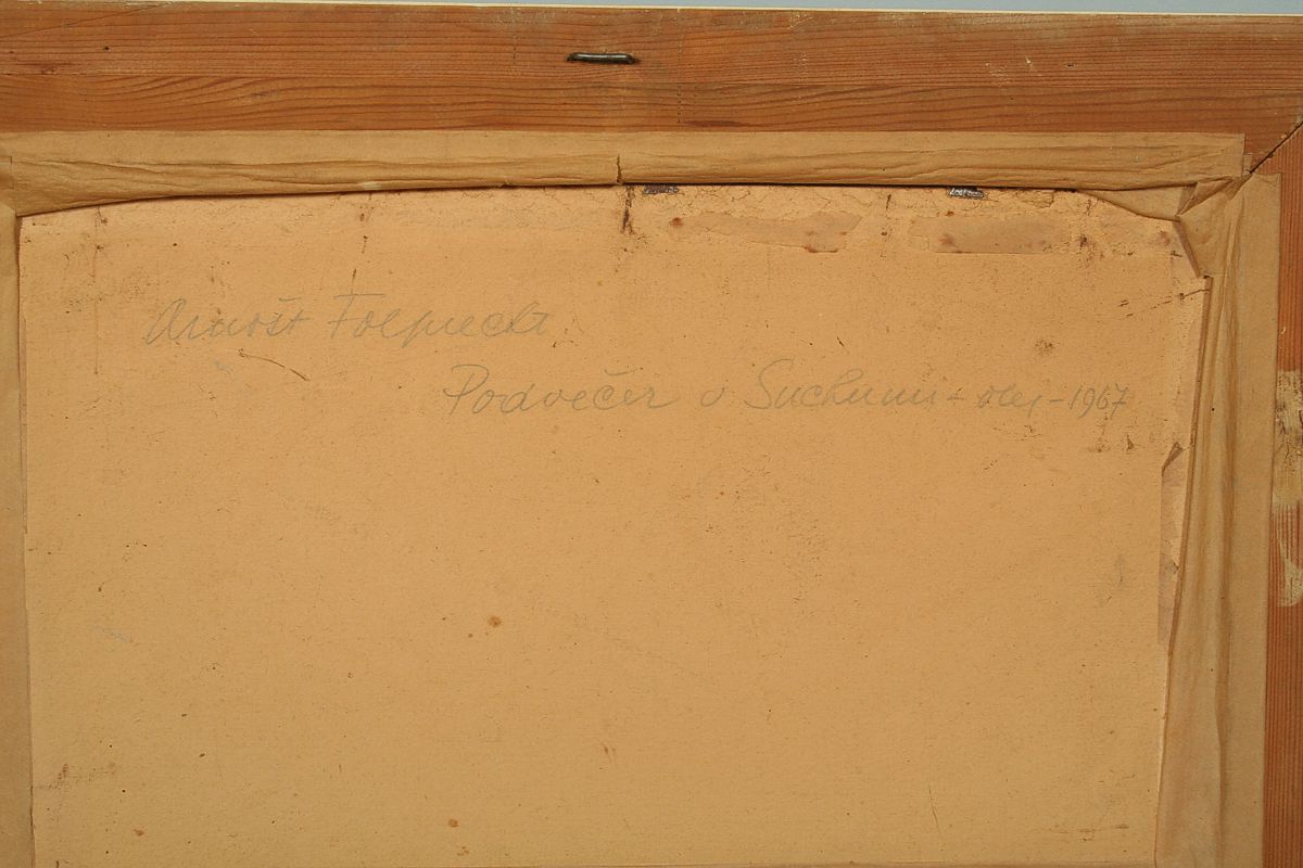 obraz přímořské krajiny s názvem "Podvečer v Suchumi 1967", olej na lepence, 26 x 44 cm s rámem 40 x 58 cm, autor Arnošt Folprecht, podepsáno vpravo dole Folprecht a na zadní straně přípis autora Arnošt Folprecht Podvečer v Suchumi, olej 1967, rámováno v původním rámu pod sklem