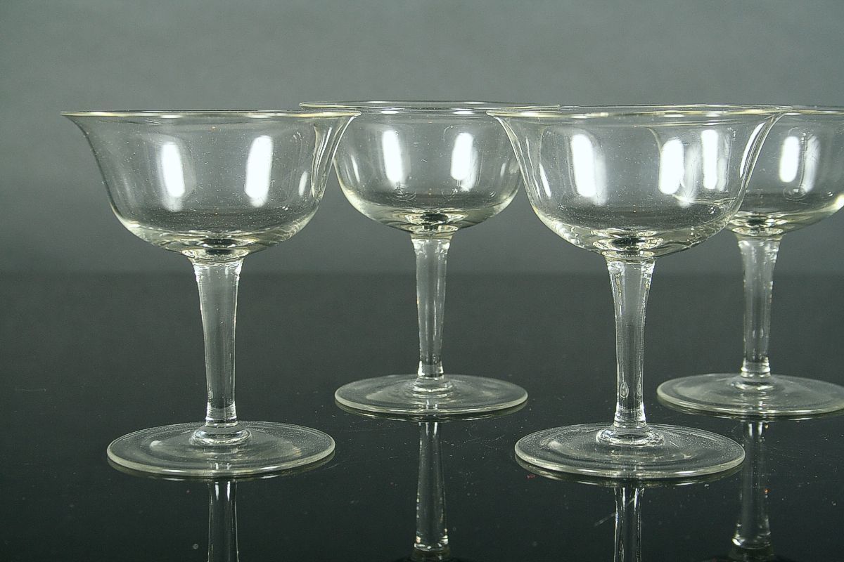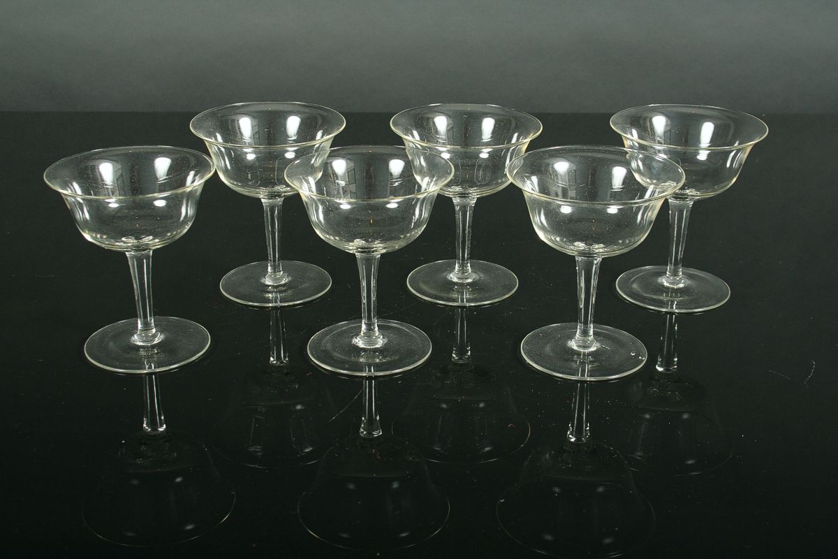 kompletní skleněný nápojový servis na aperitiv od známého autora českého designu Ladislava Sutnara, 6 x sklenice na aperitiv z bélého tenkého skla, bez poškození, 11 x 10 cm