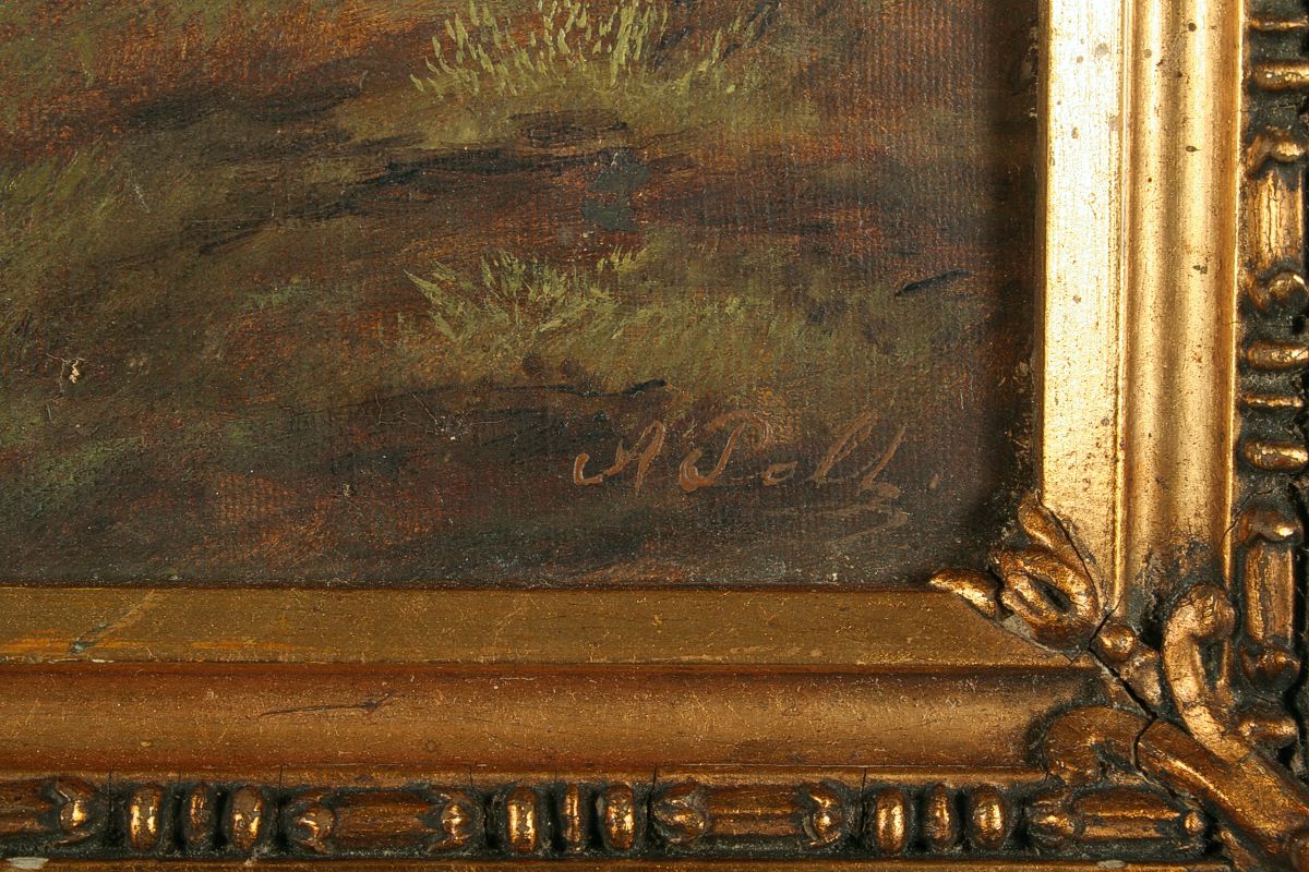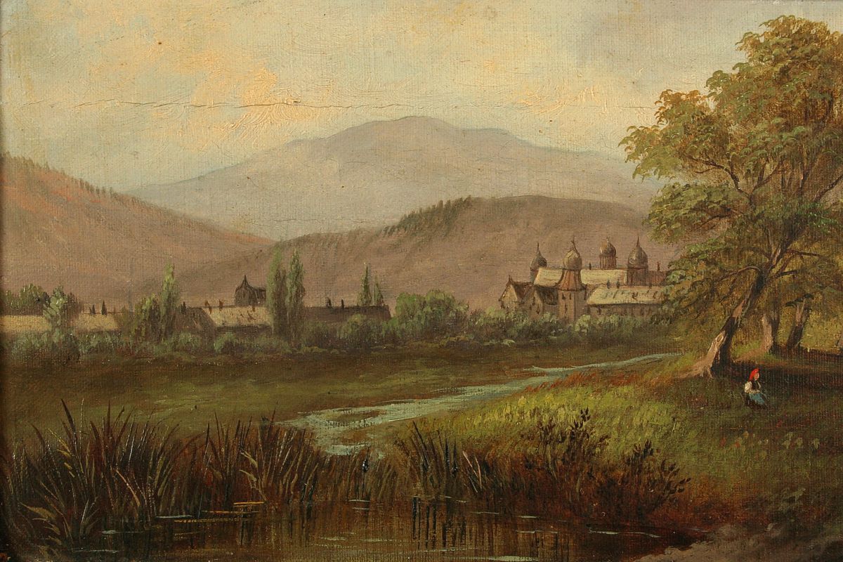 obraz romantické krajiny s figurální stafáží a městem v pozadí z konce 19. století, olej na plátně napnutém na dřevěném vyklínkovaném rámu, 16 x 31 cm s rámem 30 x 46 cm, autor J. Poltz, podepsáno vpravo dole J. Poltz, rámováno v původním zlaceném a zdobeném rámu