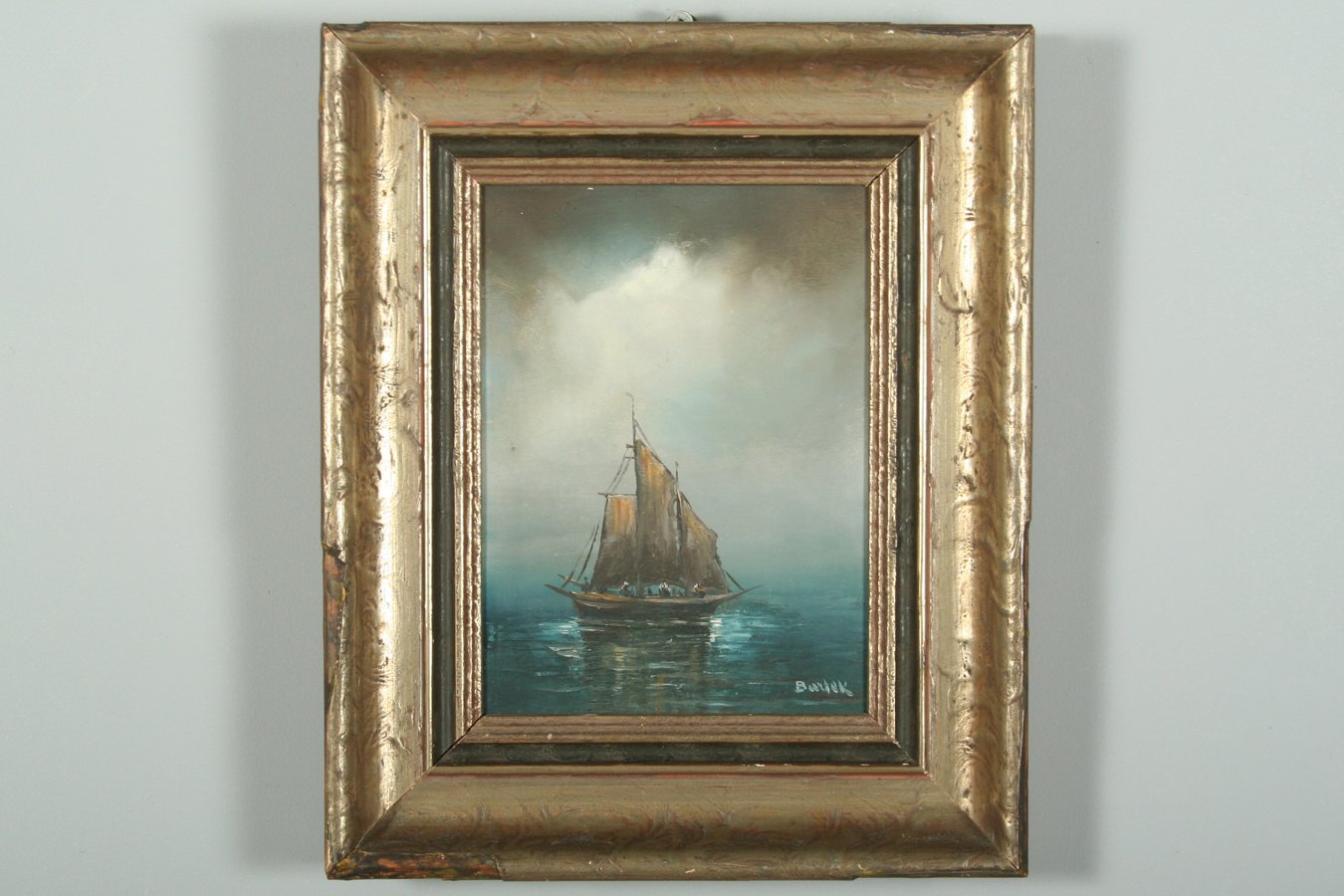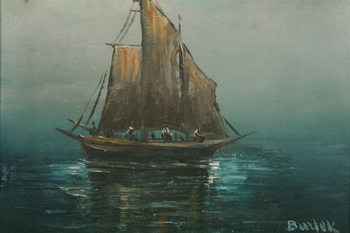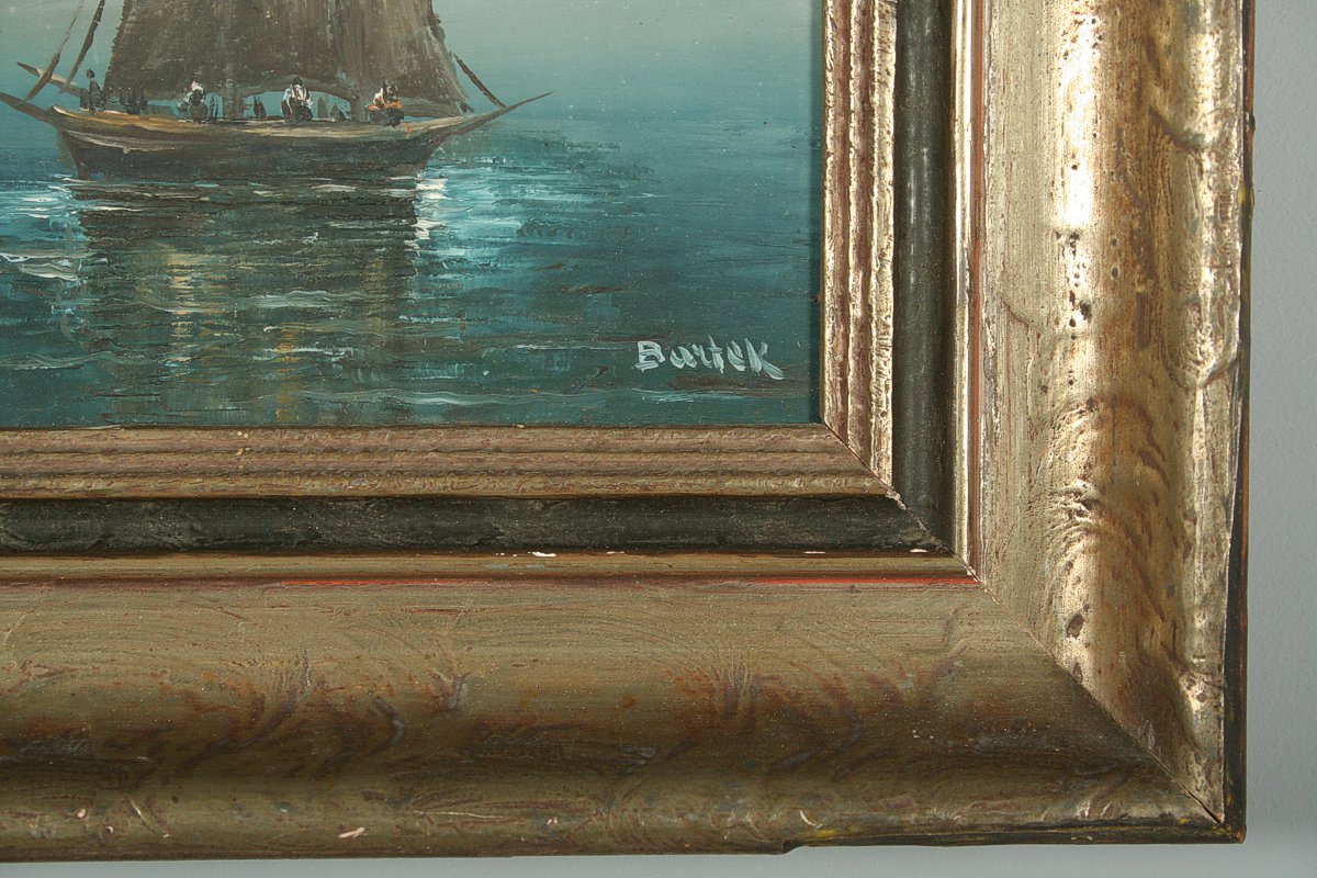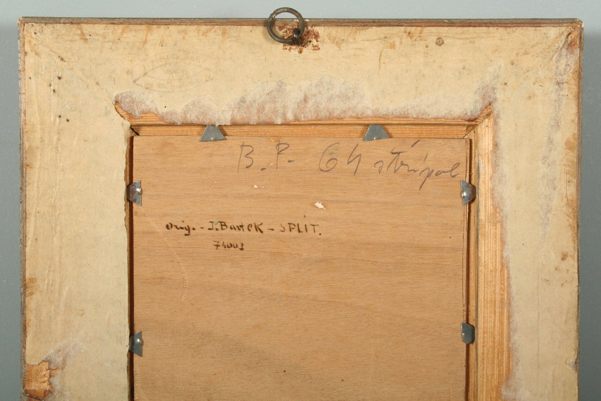 obraz marína u Splitu, olej na dřevěné desce, 22 x 16 cm, s rámem 35 x 29 cm, autor J. Bartek, podepsáno vpravo dole Bartek a vzadu přípis J. Bartek - Split, rámováno v původním částečně poškozeném rámu