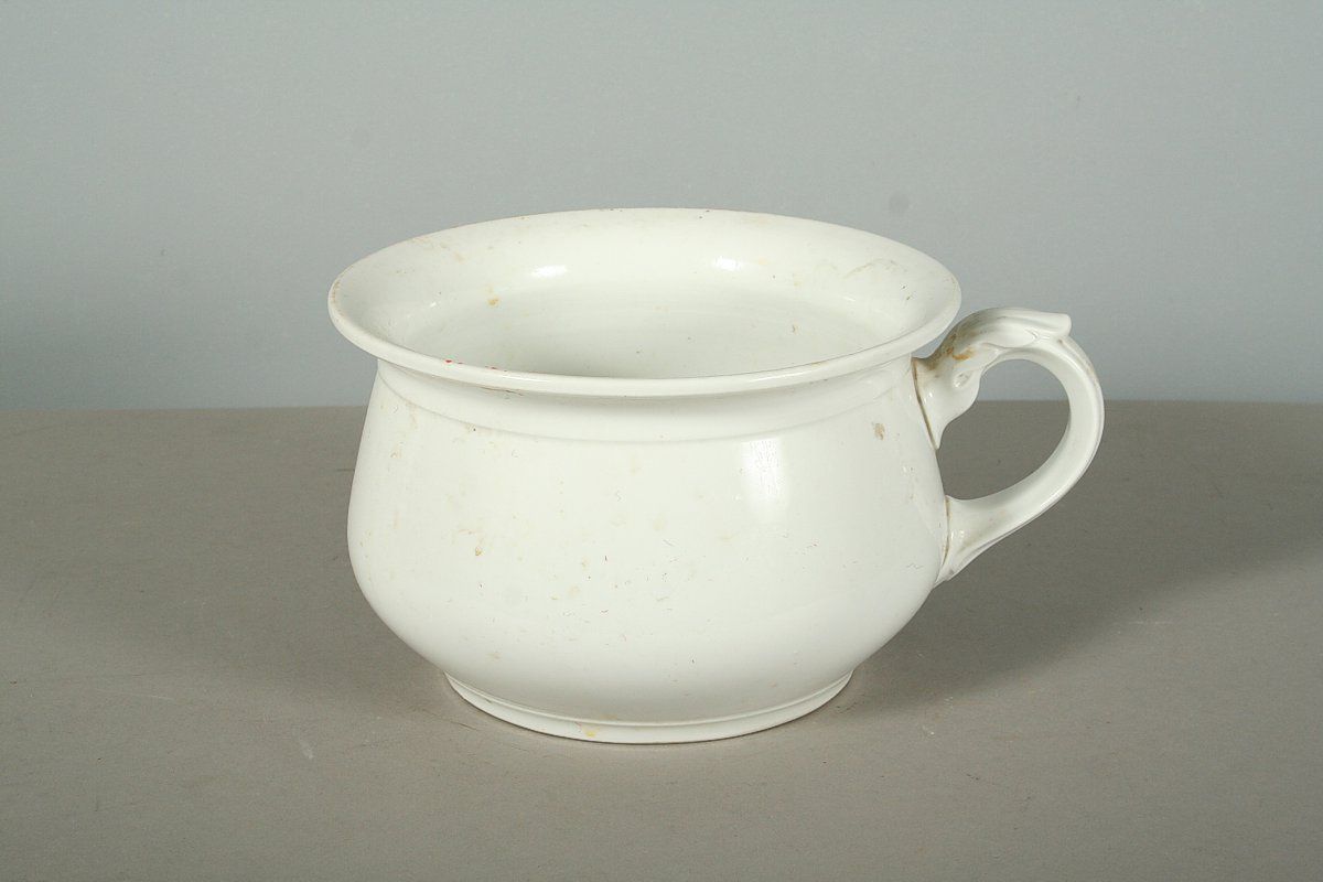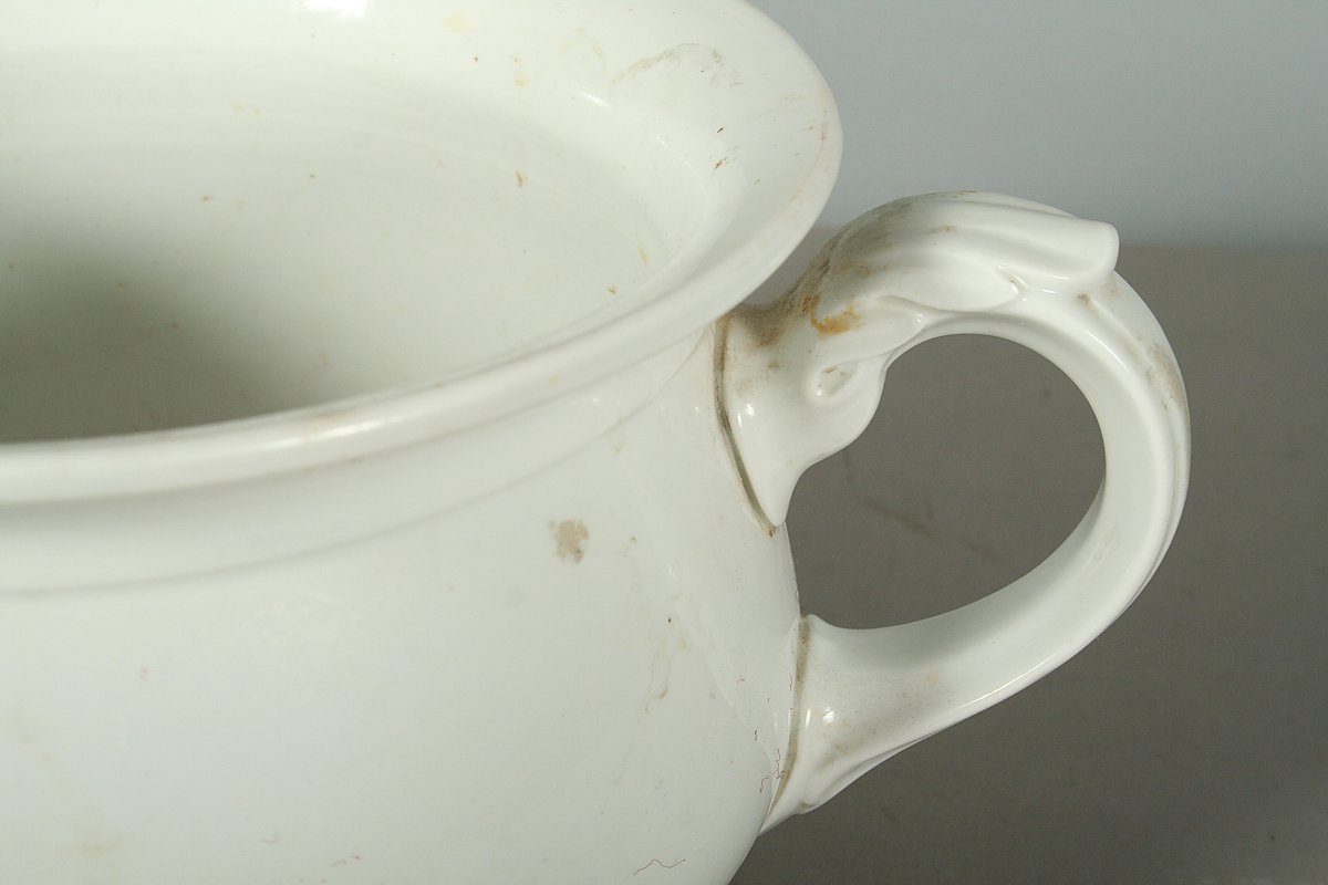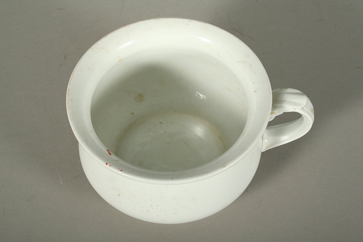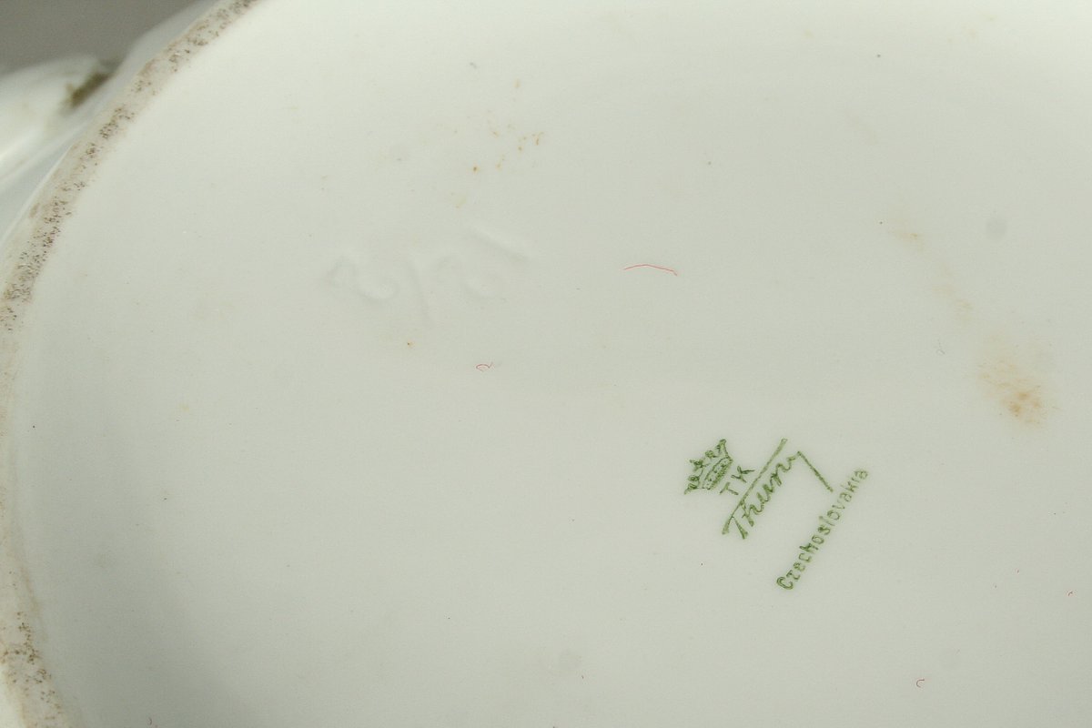 starý porcelánový nočník projmutého tvaru s plasticky zdobeným úchytem, značený na dně TK Thun, Klášterec nad Ohří, 13 x 26 cm