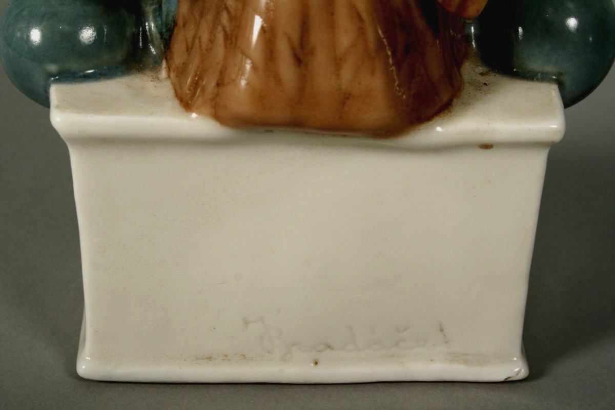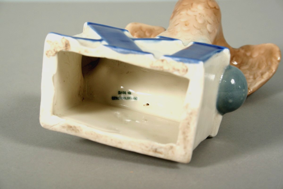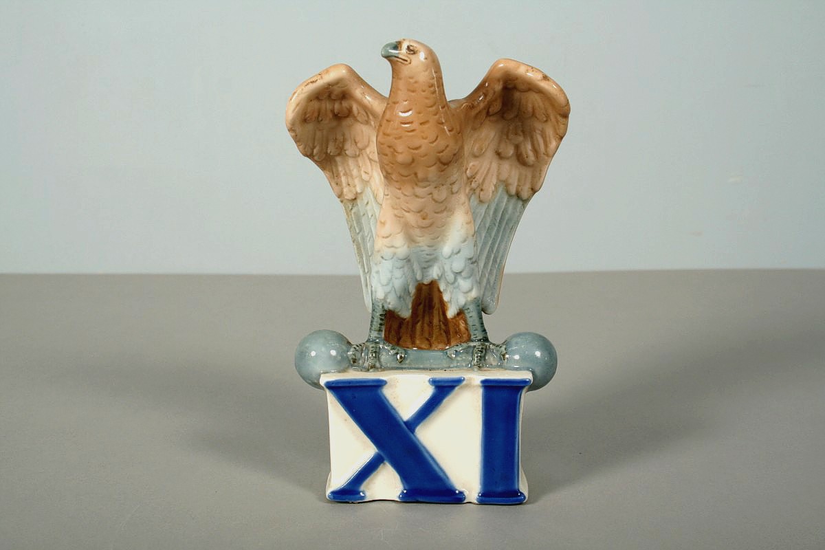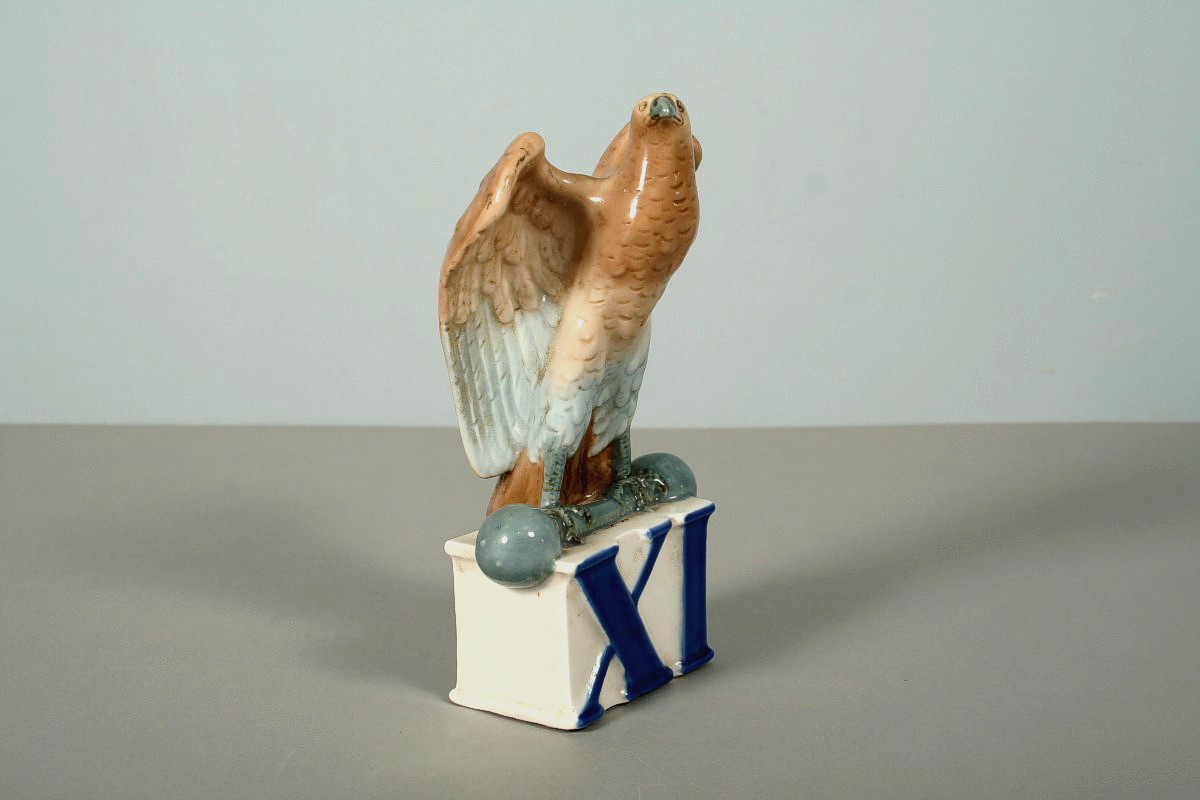 porcelánová socha sokola držícího čínku na podstavci s římskou XI, autor sochař Jiří Bradáček, značeno na zadní části podpisem a na dně razítkem Royal DUX, 20 cm, u příležitosti 11. všesokolského sletu