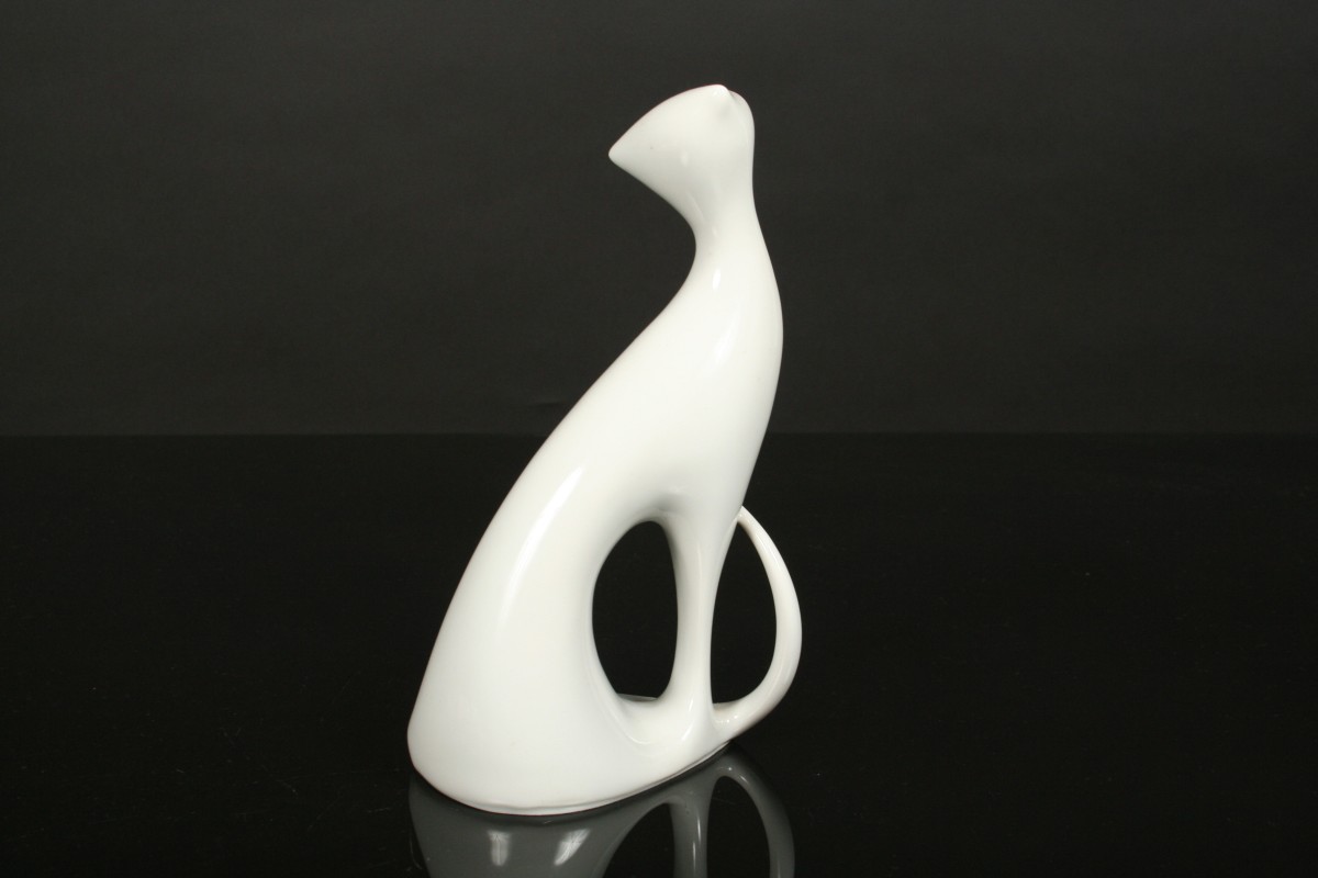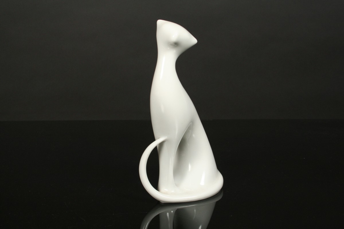 stylizovaná soška kočky, bílý glazovaný porcelán, autor návrhu Jaroslav Ježek, značená na dně starou tištěnou značkou Royal DUX Duchcov 60. léta 20. století, koncem 70. let se již tato značka nepoužívala, tzv bruselský styl, výška 19 cm