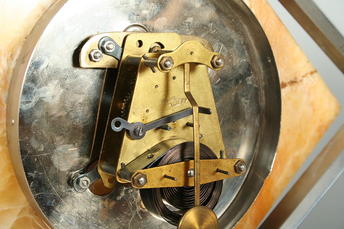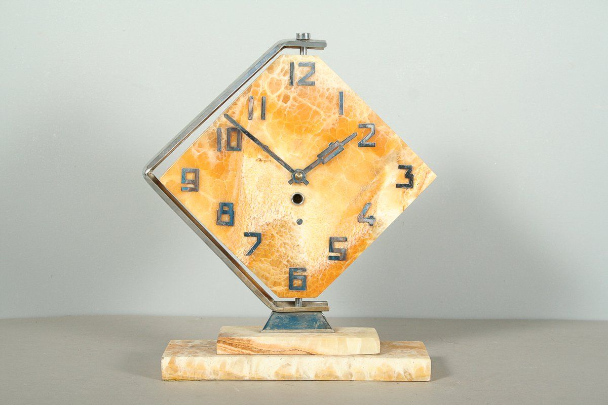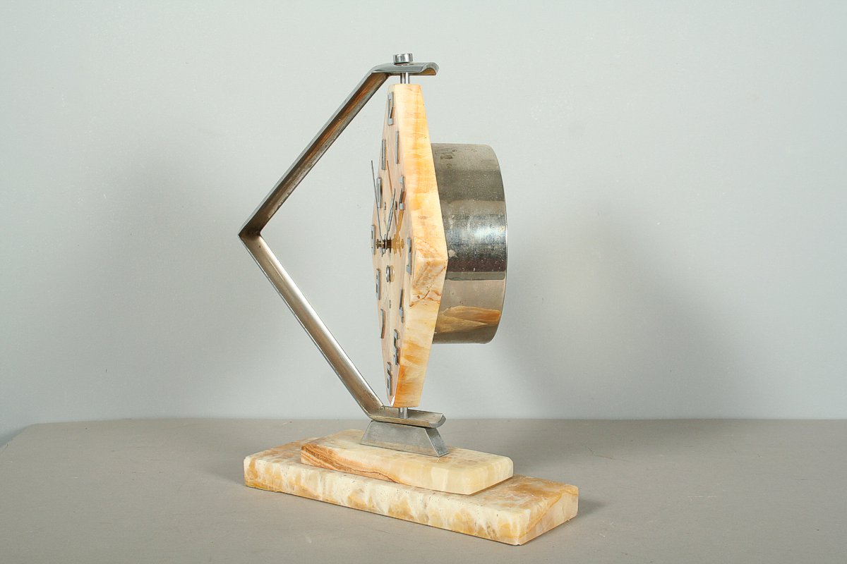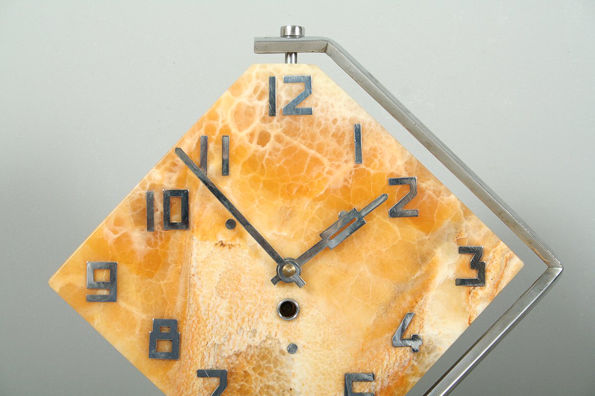 stolní hodiny z 30. let 20. století, styl art deco, onyxový ciferník (Royal Honey Onyx) v otáčivé kovové pochromované montáži, stroj pérový, značený Kinzle, 33 x 28 cm, klíček, funkční stav