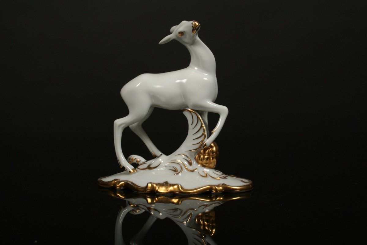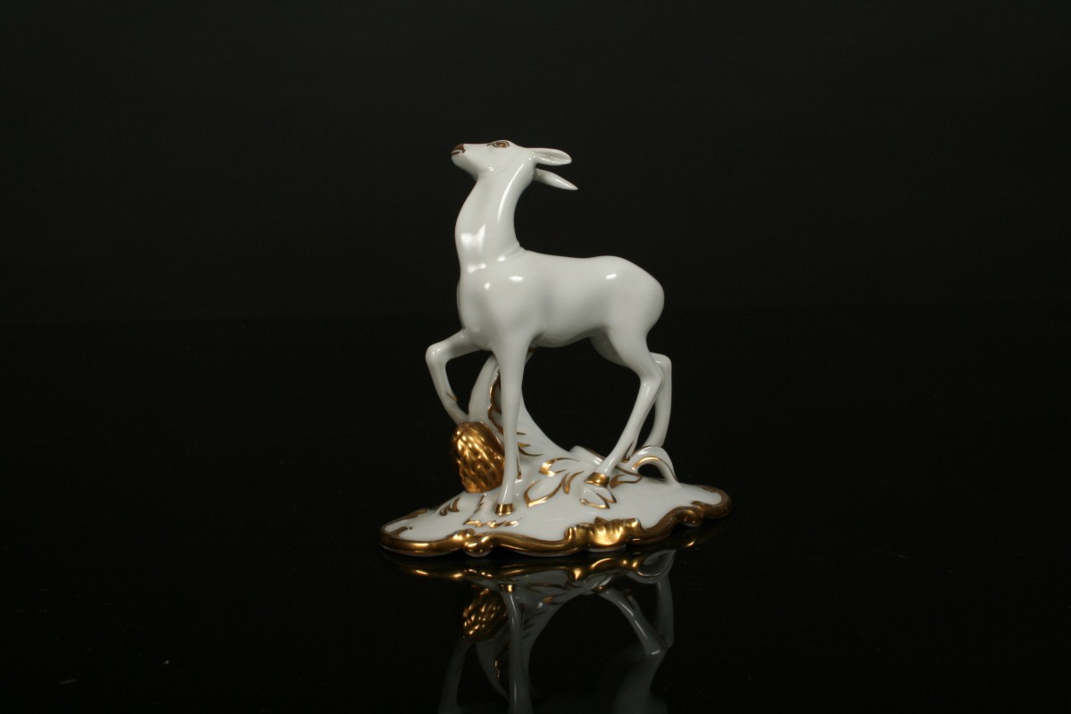 umělecká soška srnky z porcelánu, bílý porcelán se zlacenými detaily, značená na dně čísly a značkou Schlaggenwald Slavkov, 11 cm