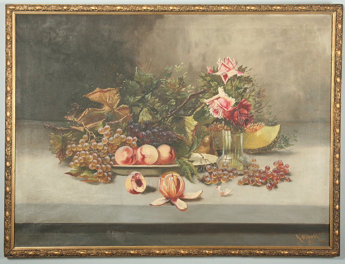 obraz zátiší s ovocem a vázou růží na stole, olej na plátně 74 x 100 cm, s rámem 80 x 106 cm, autor K. Novák, podepsáno vpravo dole K. Novák 1912, rámováno v původním zlaceném a zdobeném rámu