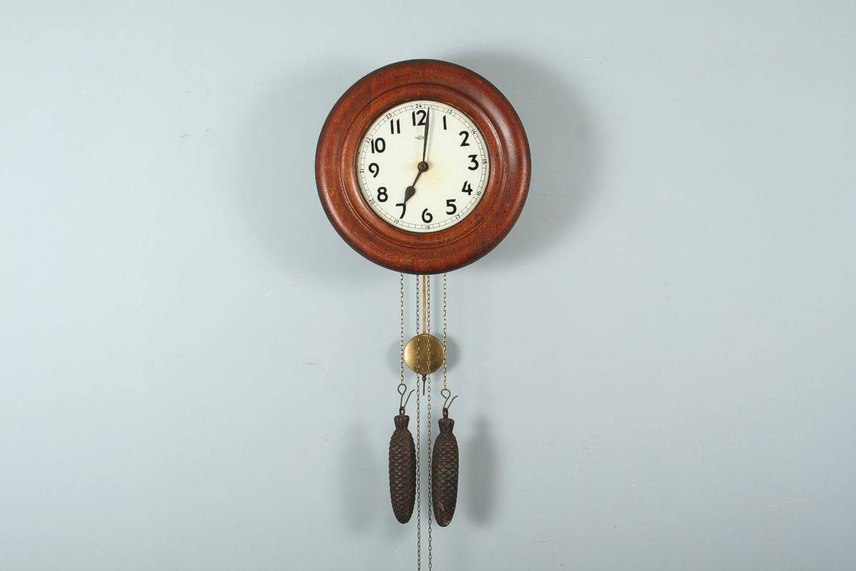 kulaté závěsné hodiny, skleněný ciferník v dřevěném rámu značený Kienzle, hodinový stroj s kyvadlem dvouzávažový s půlovým bitím do spirály, minimální staré stopy po červotoči, celkový průměr hodin 29 cm od stěny vystupují 12 cm, hodiny jsou s bočními dvířky ve funkčním stavu