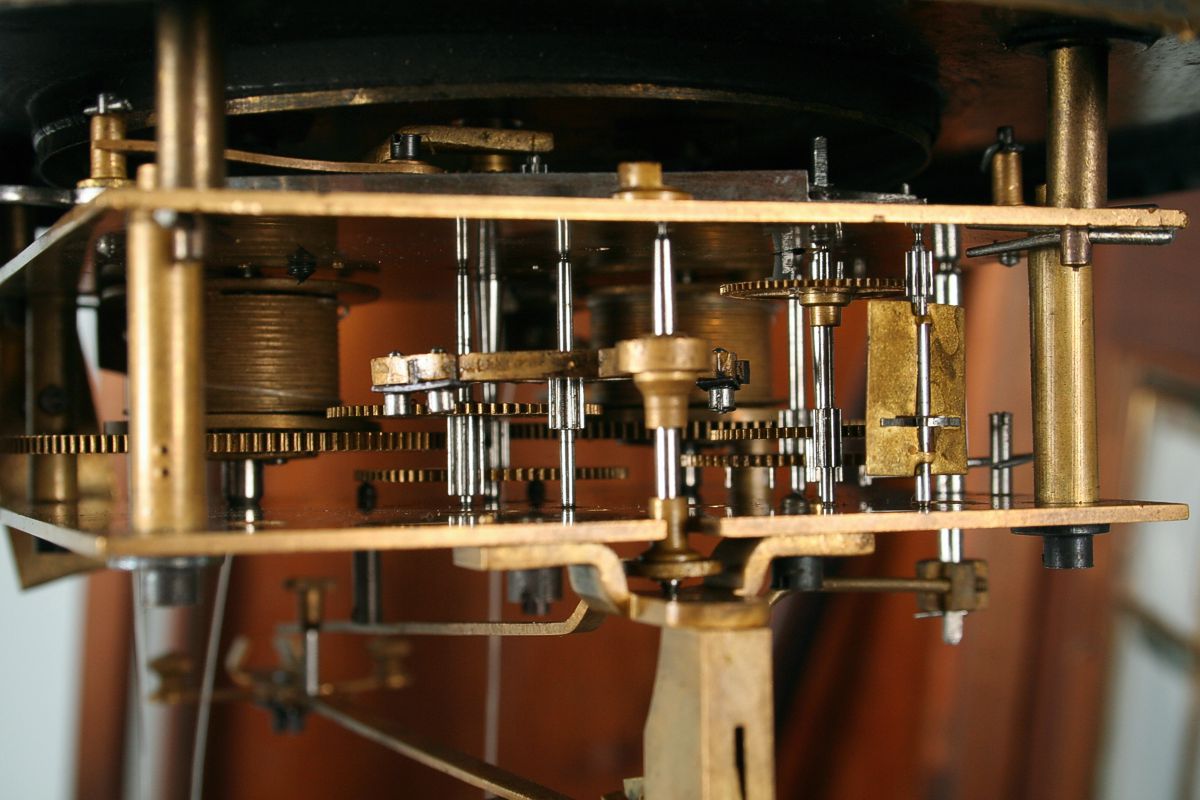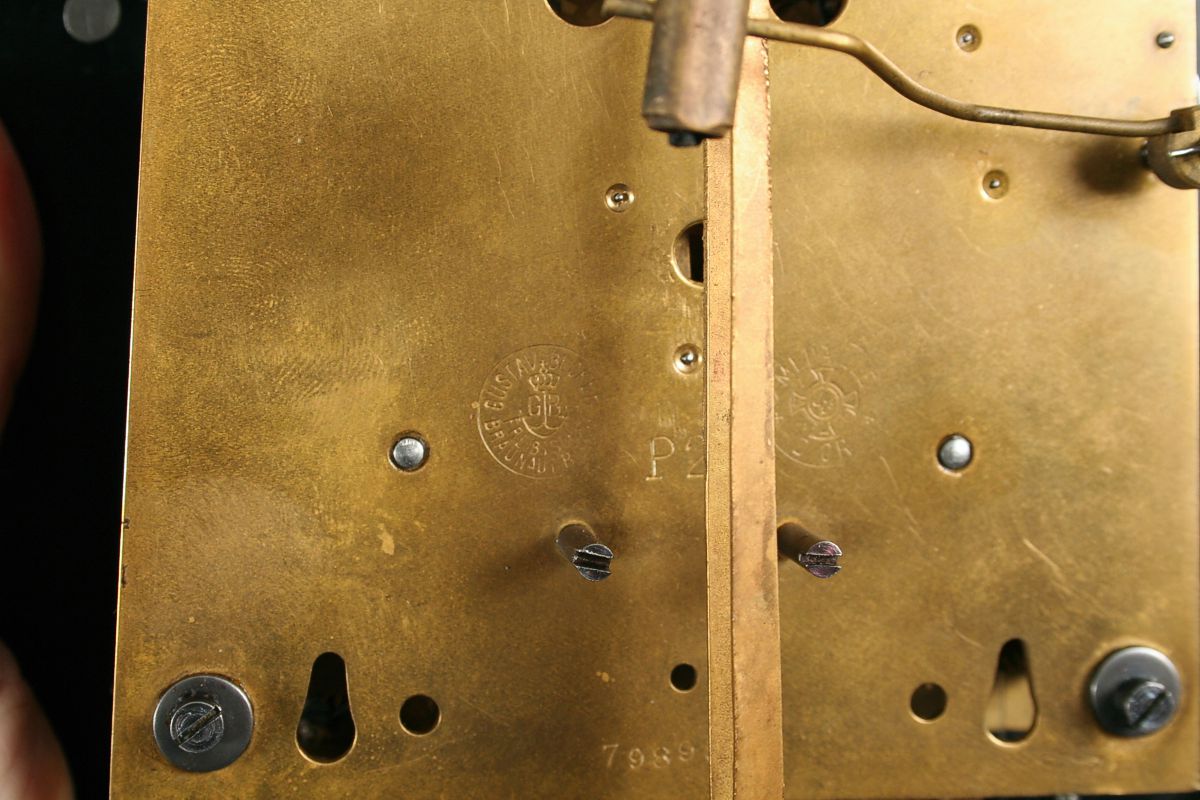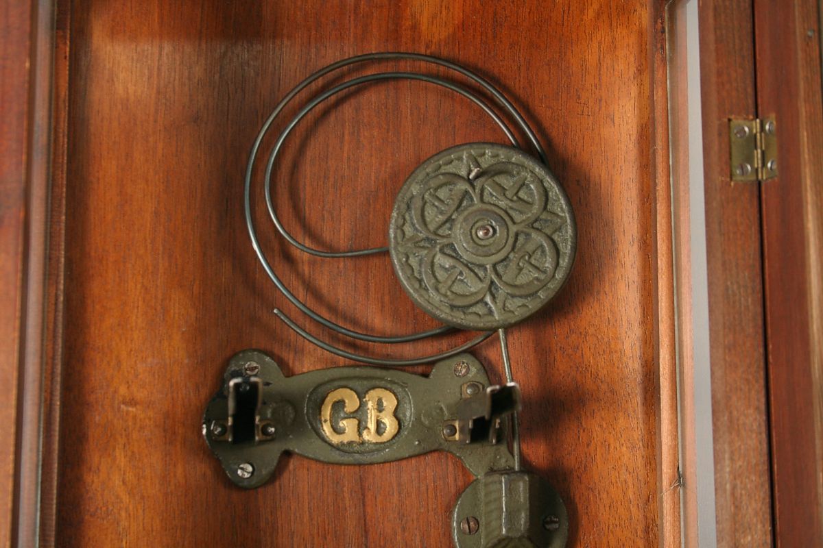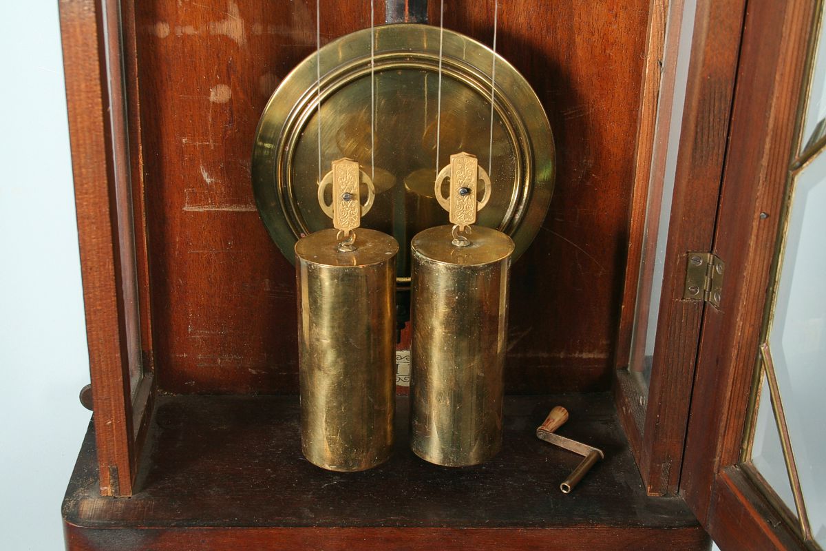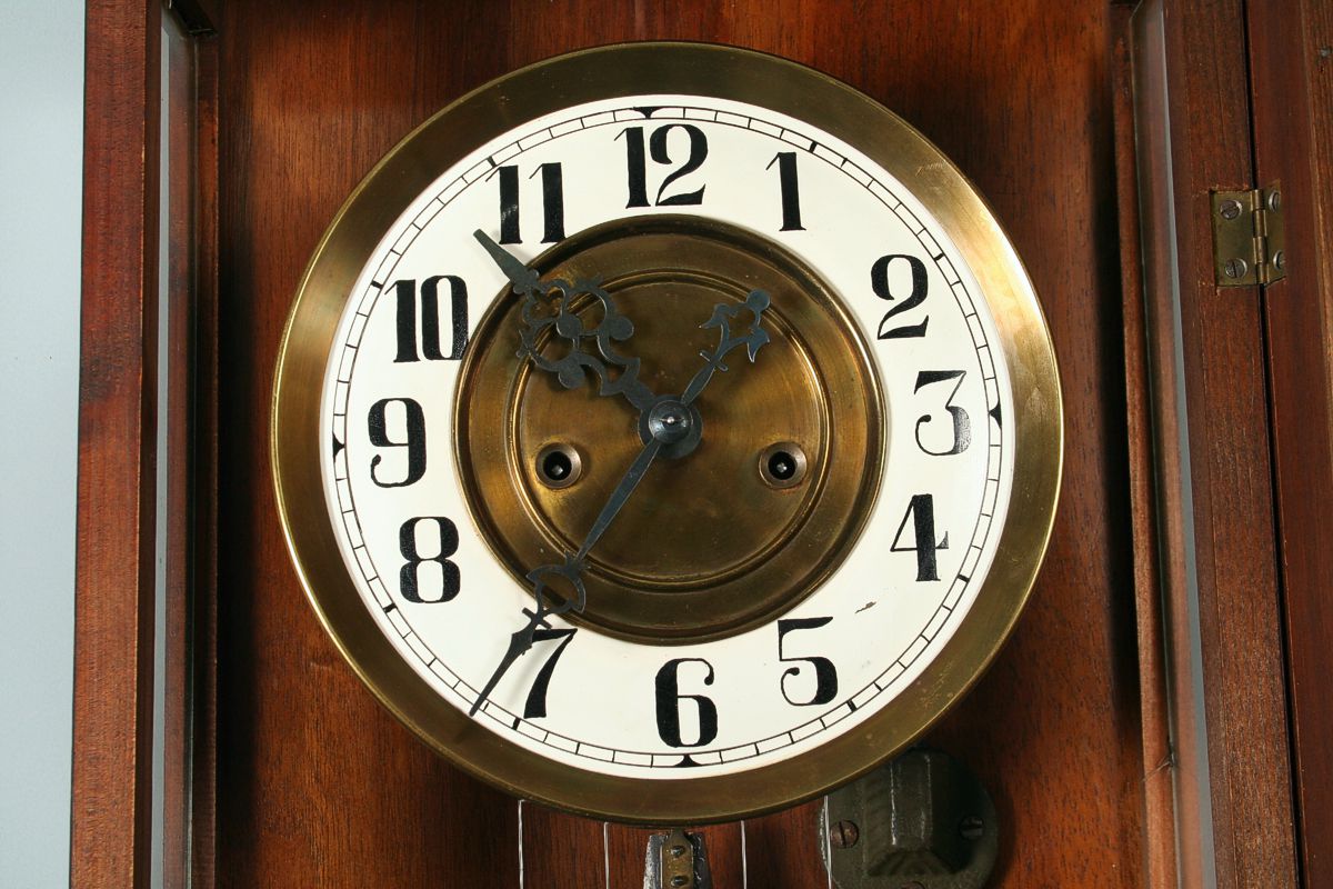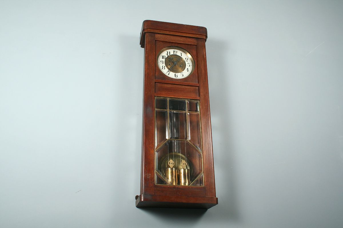 závěsné bicí hodiny v pozdně secesní dřevěné skříňce s fazetovanými skly a mosaznou vitráží, dubový masiv s jednoduchou volutou, dvou závažový stroj s plechovým ciferníkem, stroj značený GB Gustav Becker, půlové bití do patentovaného gongu, po vyčistění funkční s klíčem, 86 x 32 cm