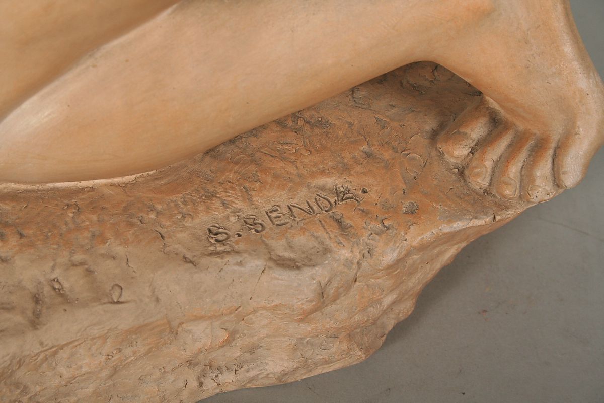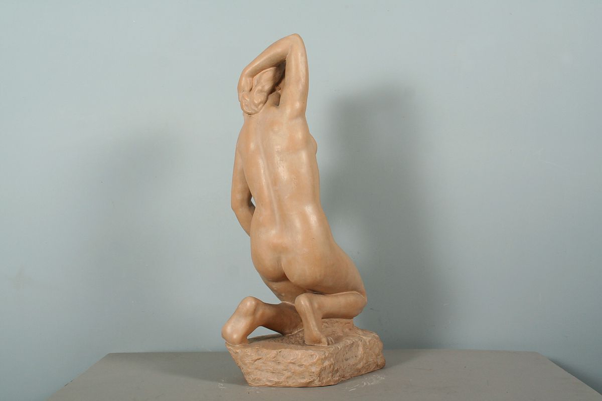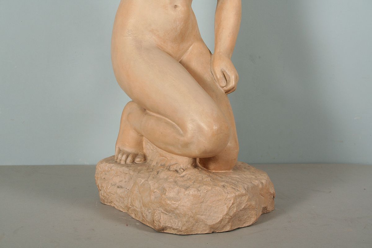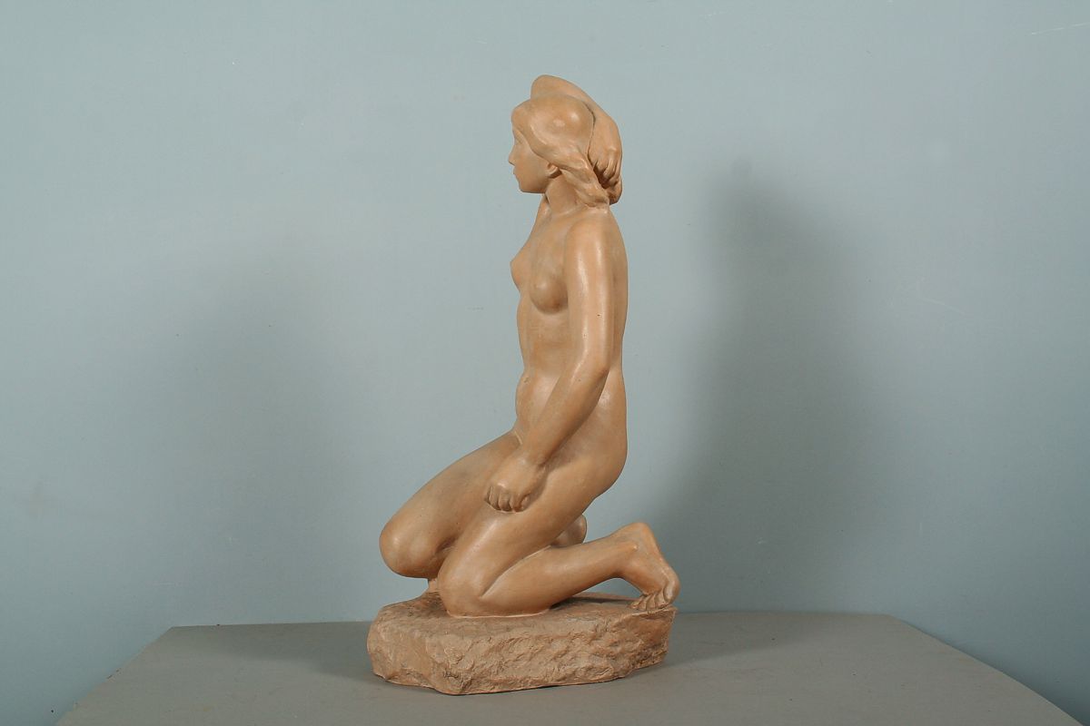 klečící dívčí akt s názvem Překvapená, autor Břetislav Benda, terakota, 56 cm, značeno na podstavci B. Benda