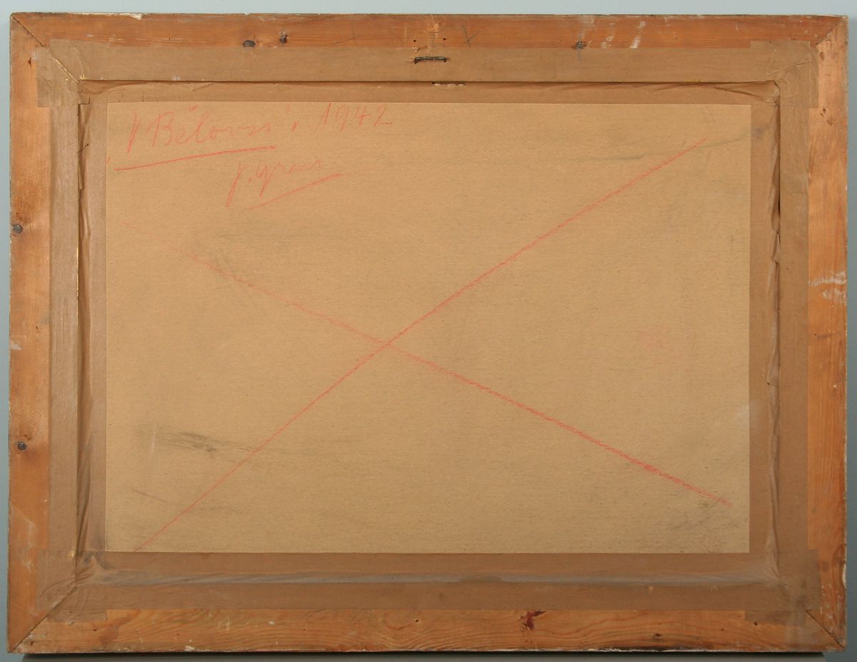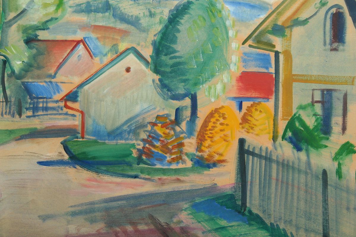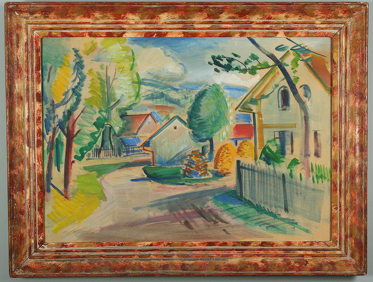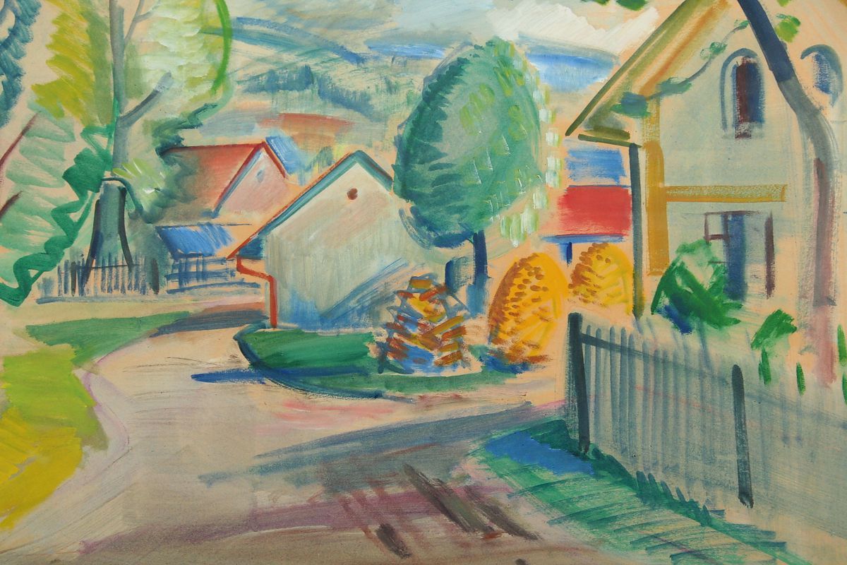 cesta s architekturou domů v Bělovsi v Náchodě, kvaš a tempera na kartonu, 48 x 69 cm s rámem 64 x 85 cm, autor Jaroslav Grus, podepsáno vpravo dole a na zadní straně autodedikace " V Bělovsi 1946 " J. Grus, obraz pochází z významné náchodské sbírky, rámováno v původním rámu pod sklem