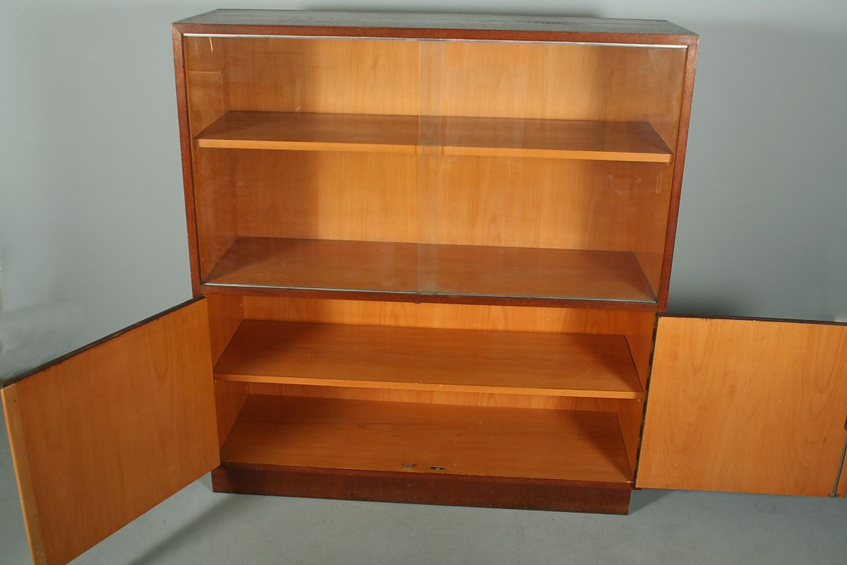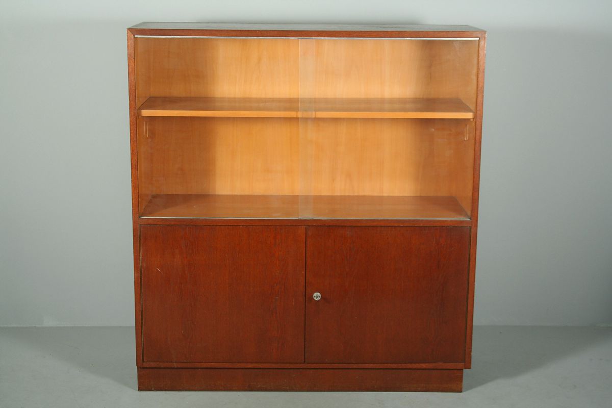 hranatá knihovna s dvířky ve spodní části a zasouvacími skly v kovových pojezdech v horní části, celá ve stylu funkcionalismu, jednoduchý a střídmý design vycházející z návrhů Jindřica Halabaly 30. léta 20. století, původní slušný stav, výška 130 x 120 x 39 cm, možno dokoupit druhou identickou knihovnu, která má v horní části stopy po jednom květináči za 2000,-Kč