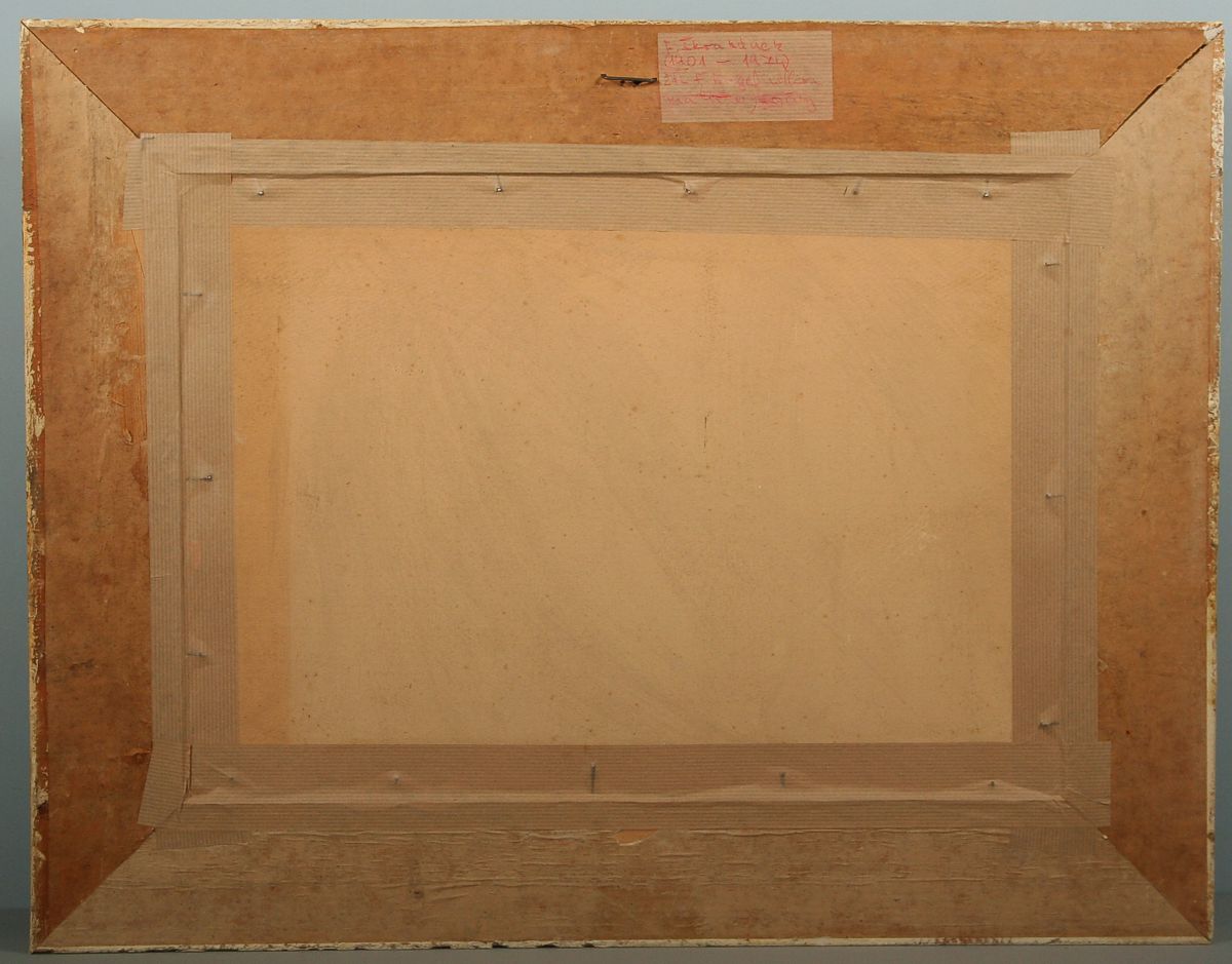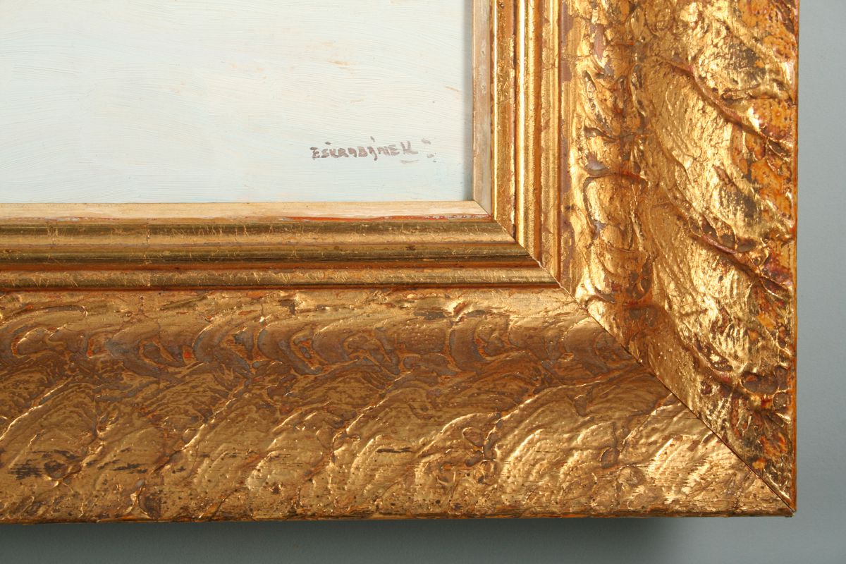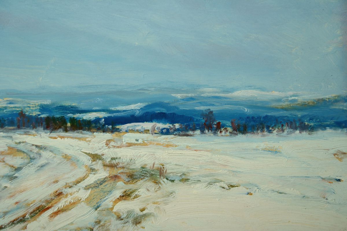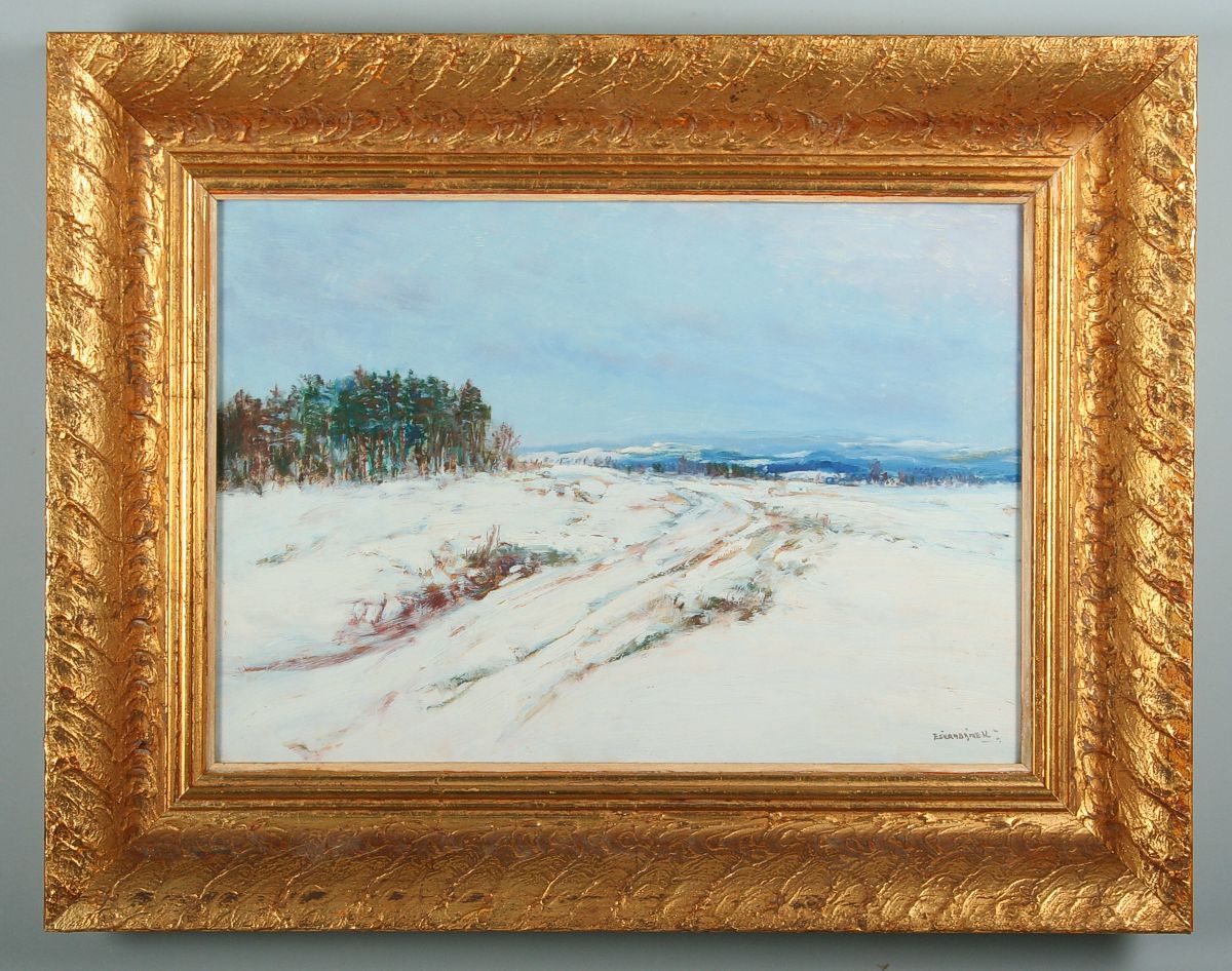 obraz zimní krajiny, olej na kartonu 34 x 49 cm, s rámem 53 x 68 cm, autor František Škrabánek, podepsáno vpravo dole F. Škrabánek, rámováno ve zlaceném rámu pod sklem