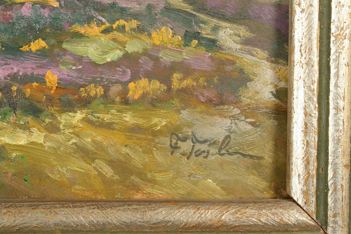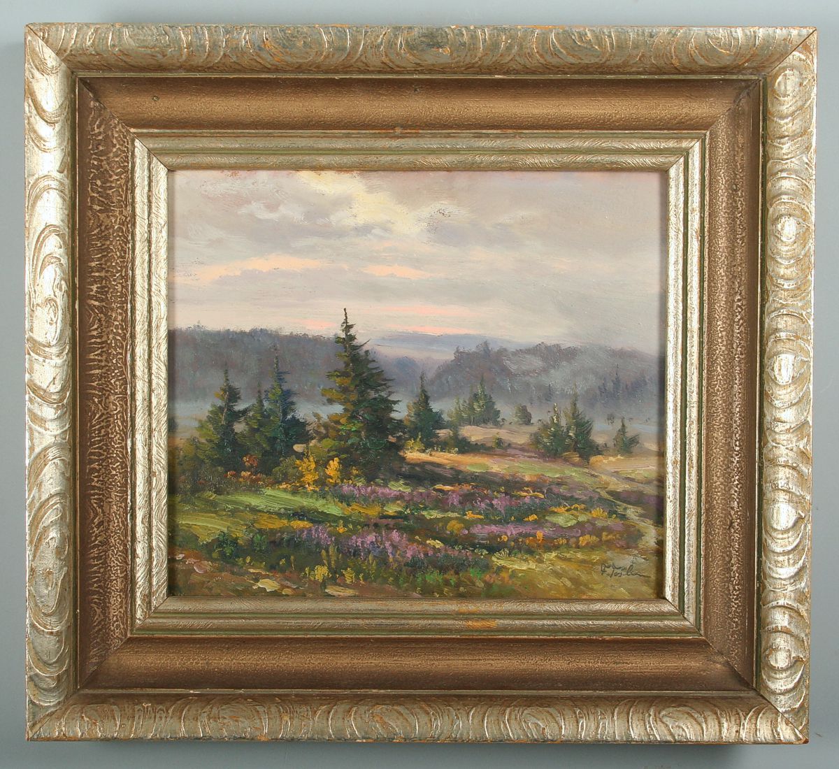 obraz krajiny u Nové Paky s vřesovištěm a červánky, olej na lepence, 30 x 34 cm, s rámem 46 x 50 cm, autor Ferdinand Tásler, podepsáno vpravo dole F. Tásler, rámováno v původním stříbřeném rámu