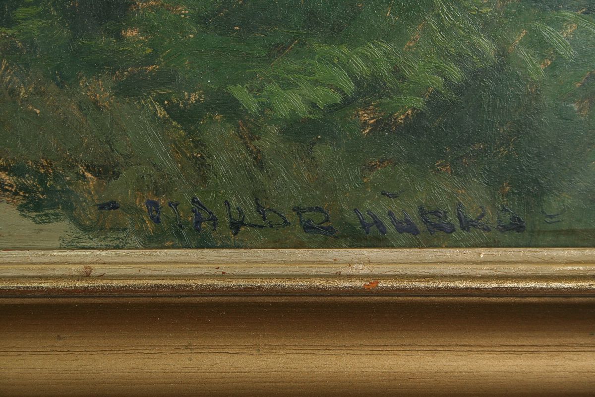 obraz letní krajiny s břízkami a cestou, olej na kartonu, 34 x 45 cm, s rámem 46 x 57 cm, autor Otakar Hůrka, obraz zachycující krajinu v koloritu a výrazu jeho učitele A. Kalvody, podepsáno vpravo dole Otakar Hůrka, rámováno pod sklem
