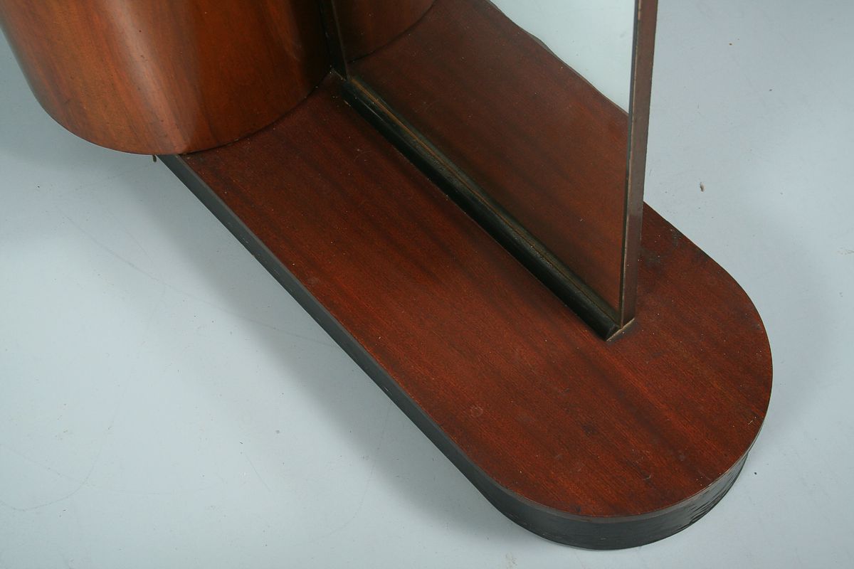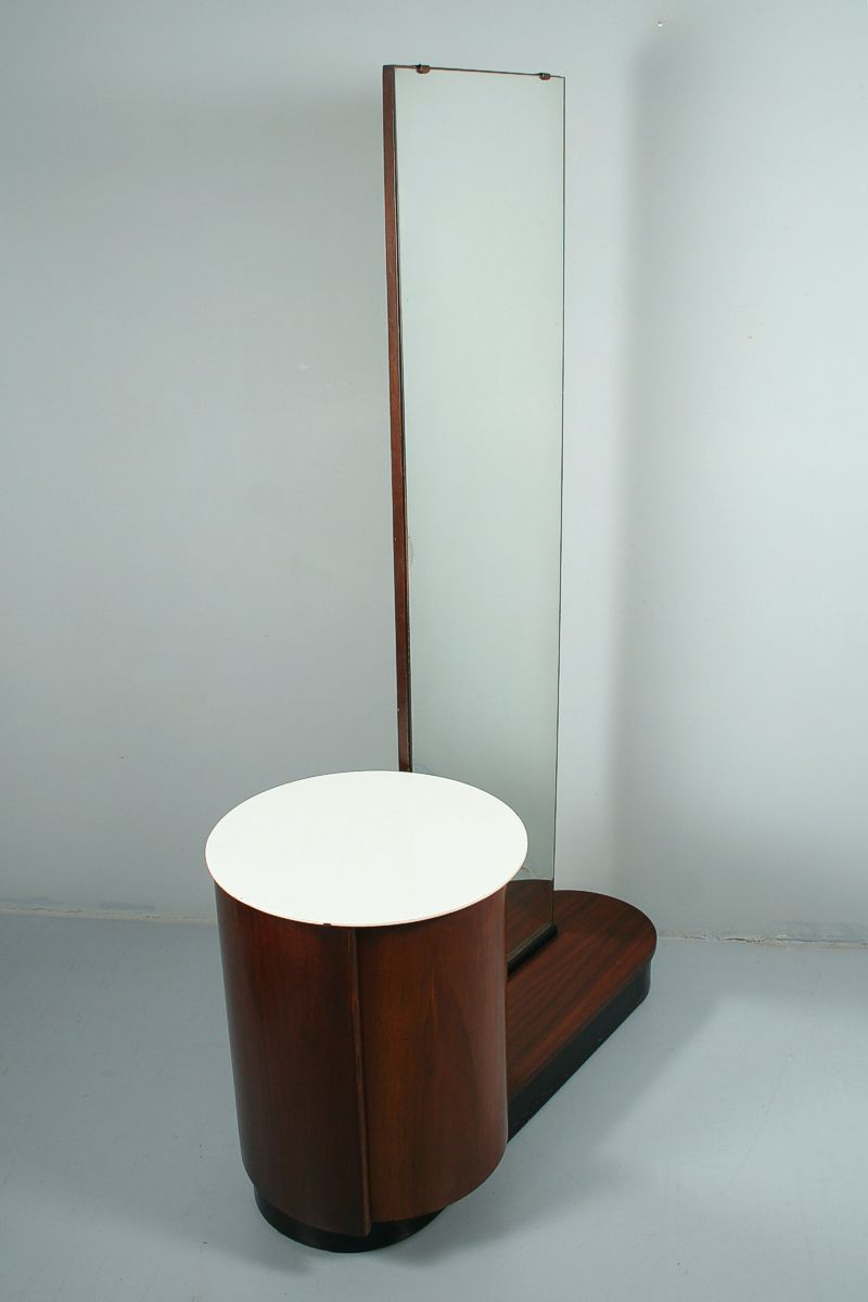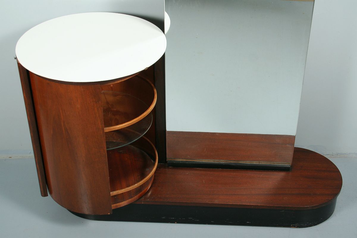 toaletka se zrcadlem a otočnou sříňkou, ořechová dýha, lehce fasetované původní zrcadlo, opaxitové bílé kulaté sklo, otvírání otáčením, uvnitř skleněná police, zcela původní stav, autor návrhu pro Spojené UP závody Jindřich Halabala, výška celkem 166 cm, šíře 107 cm, Φ opaxitového skla 45 cm, šíře zrcadla 44,5 cm