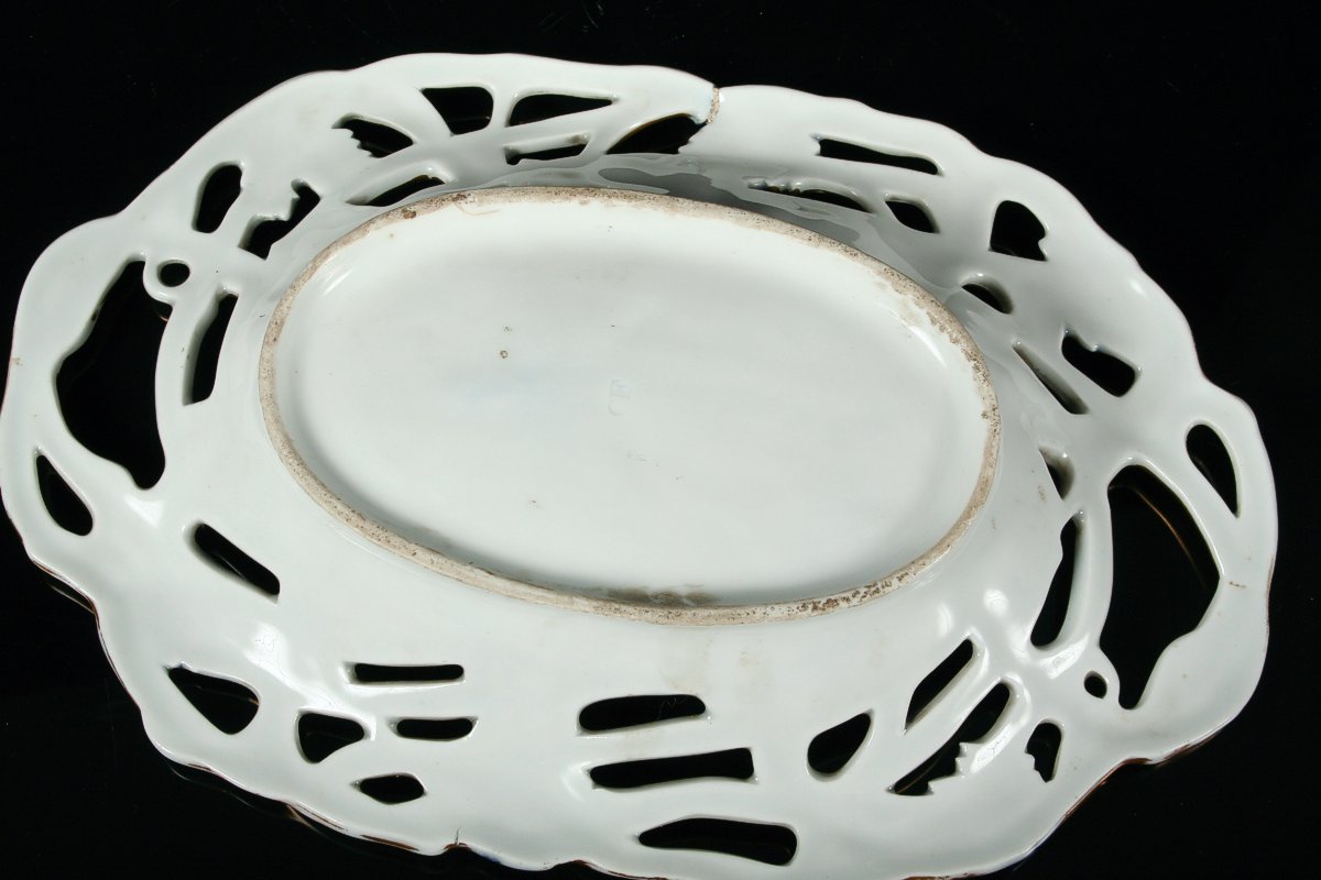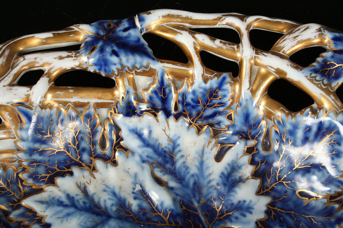ozdobná mísa na ovoce, ve tvaru propletené vinné révy, kobaltem malovaný porcelán, zlacené detaily, značeno na dně tlačenou značkou CF Cristian Fischer, Březová 1846-1853, 31 x 21 x 5 cm