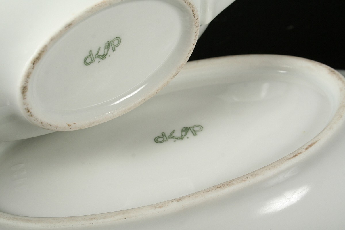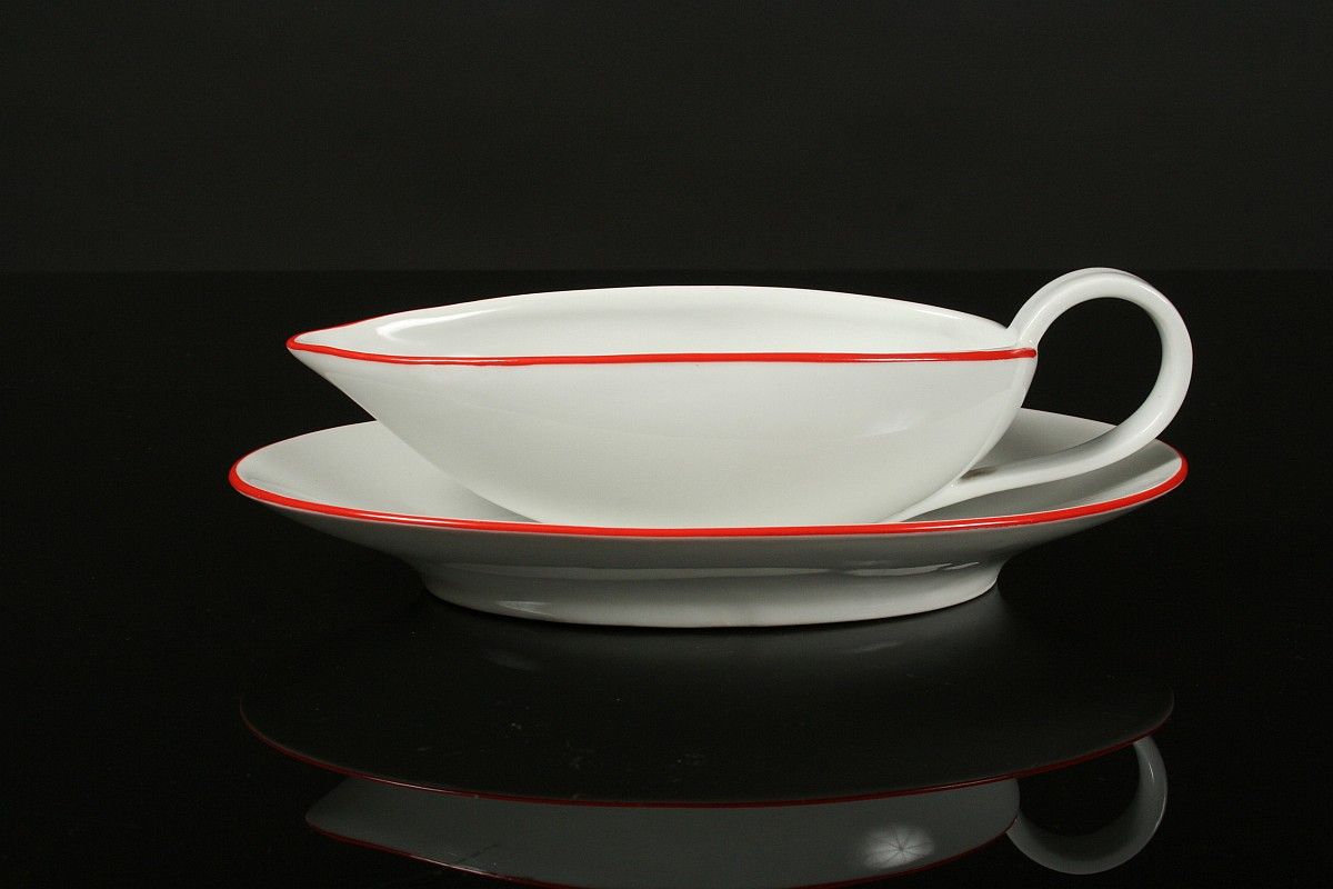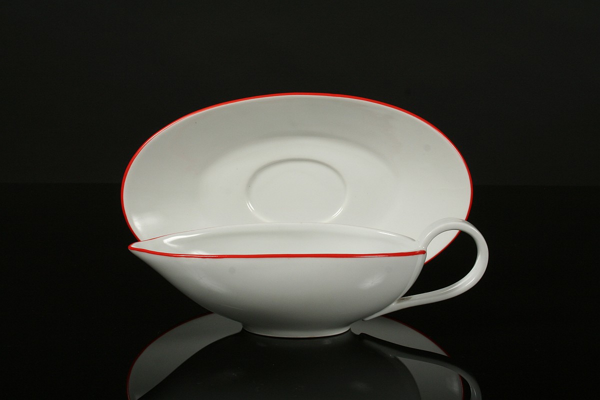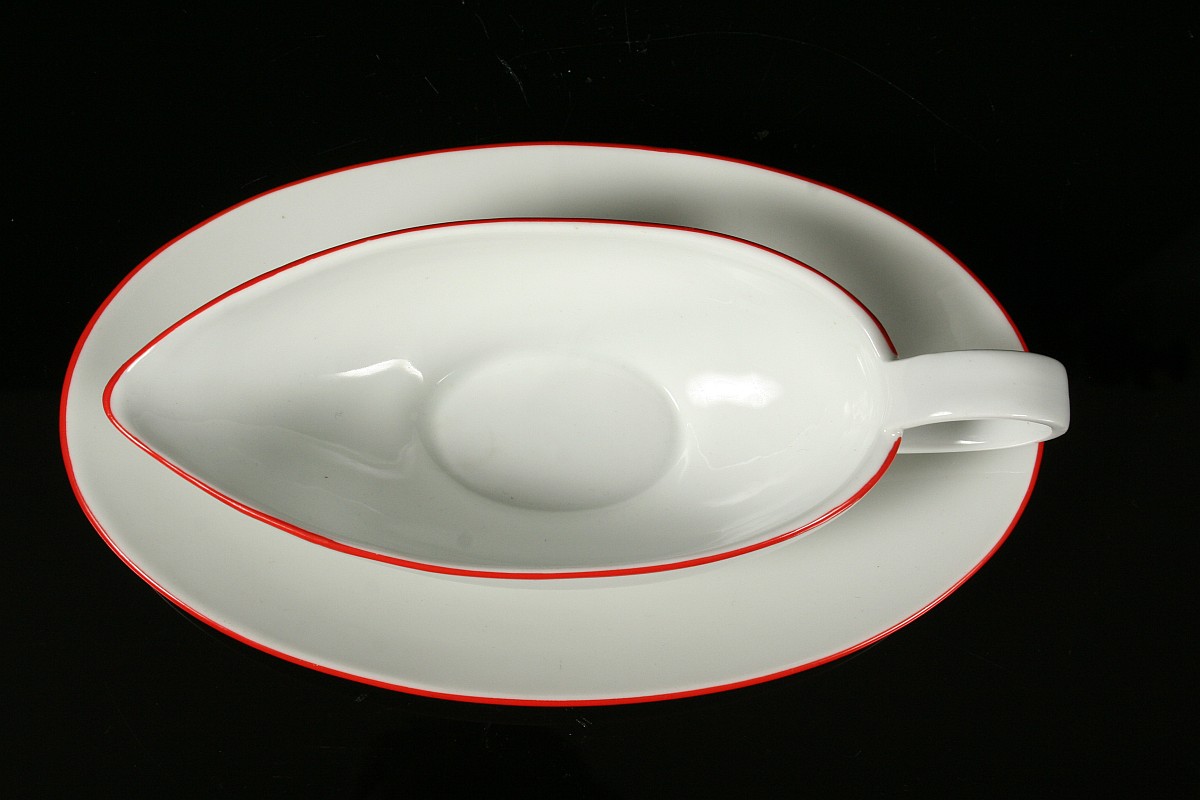 omáčkovník k jídelnímu servisu od známého autora českého designu Ladislava Sutnara, z bélého tenkého porcelánu s črvenou linkou po obvodu, značeno tištěnou značkou DP Loket