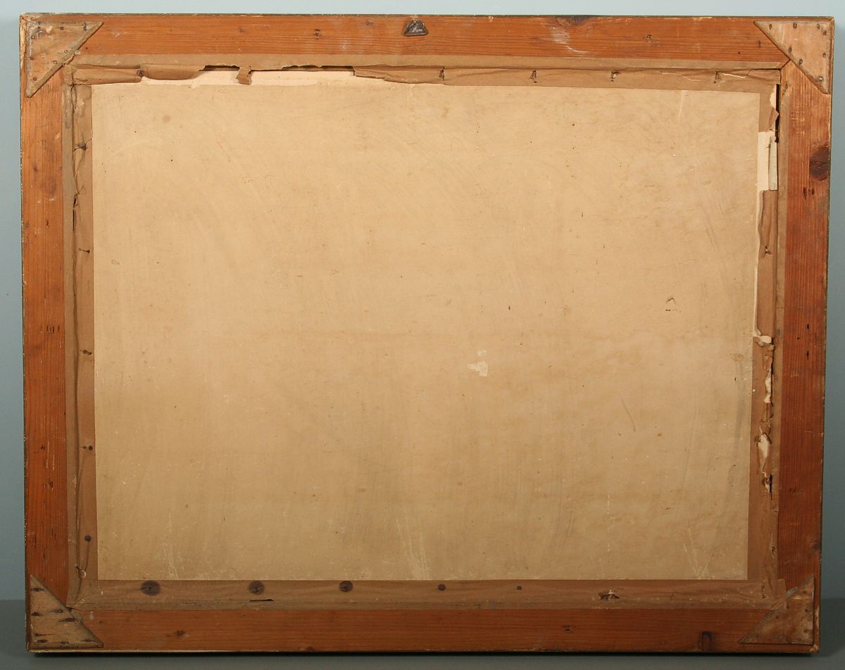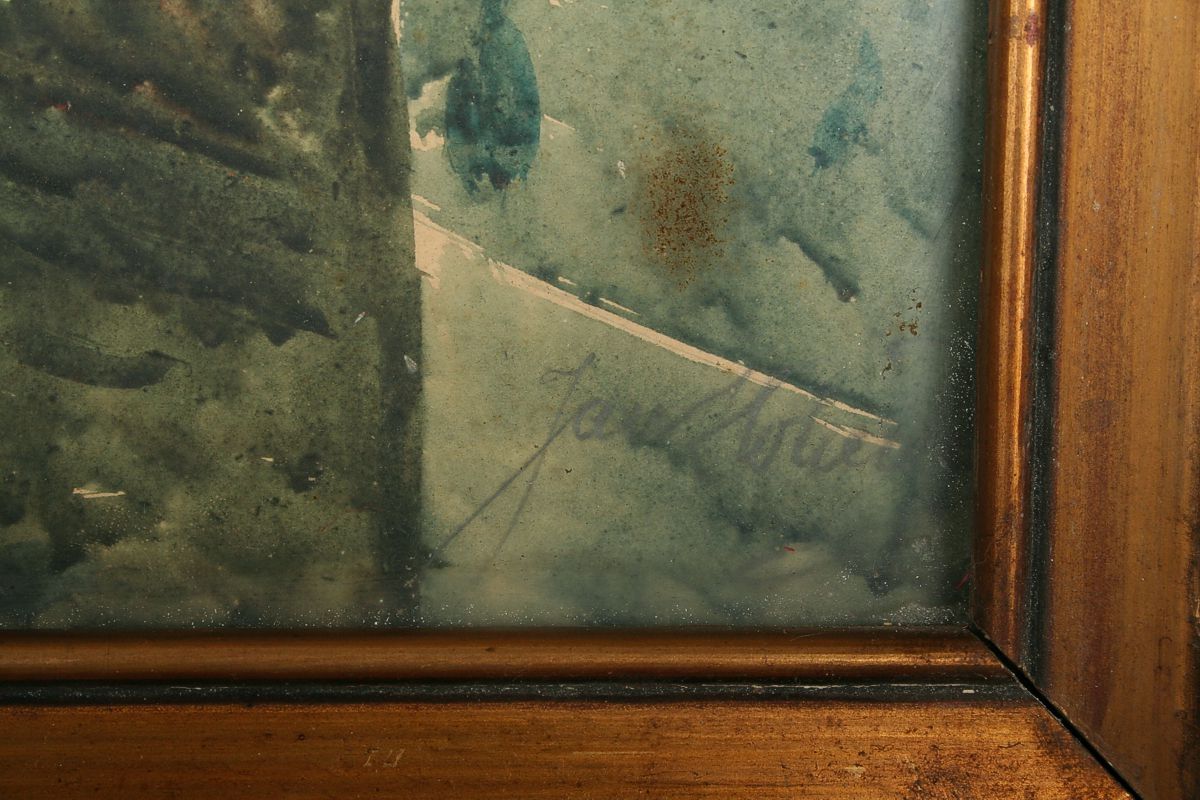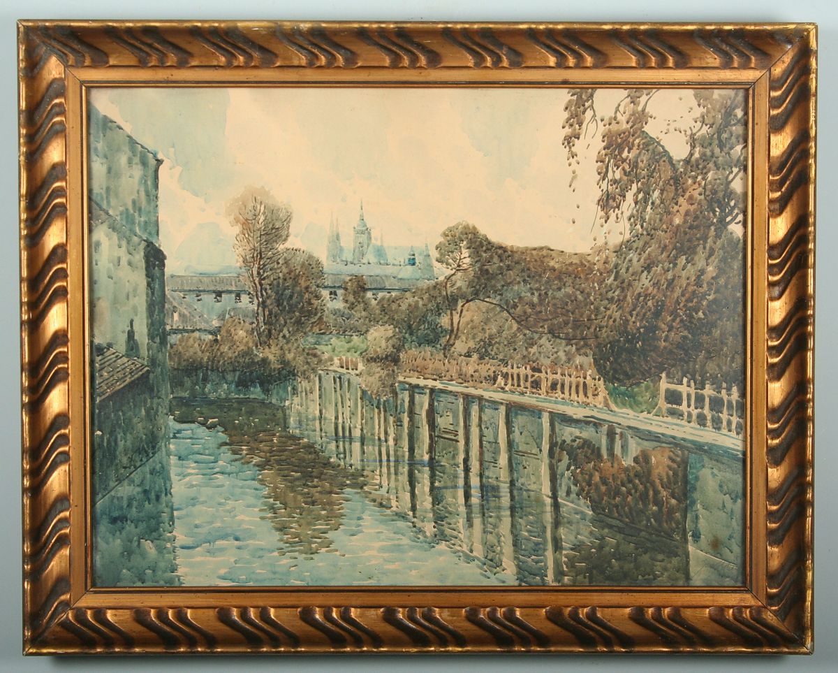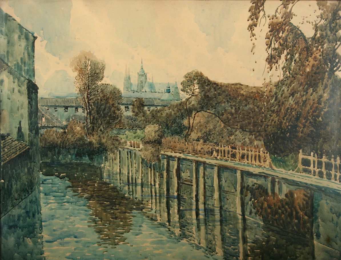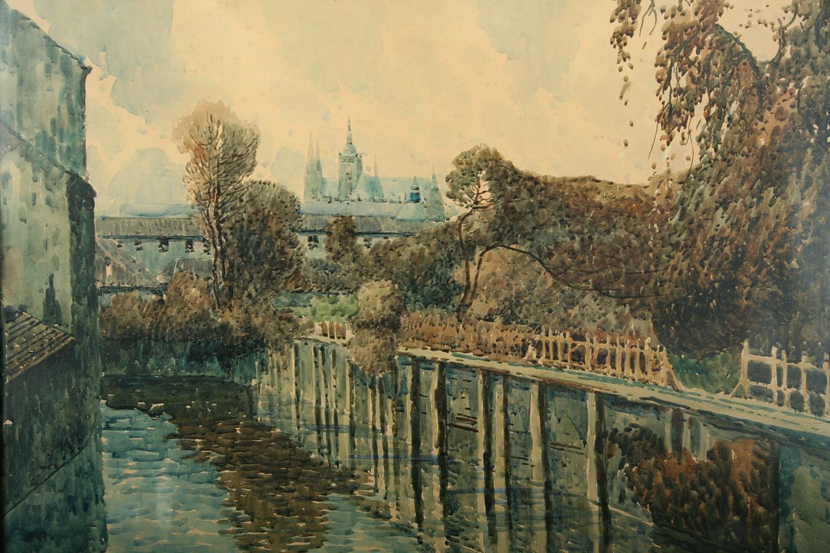 obraz s pražským motivem Čertovky s Hradčany a Tyršovým domem v pozadí (vchod do zahrady u Sovových mlýnů z ulice Říční), akvarel na papíře 49 x 64 cm, s rámem 62 x 77 cm, autor Jaroslav Holeček, podepsáno vpravo dole Jar. Holeček, rámováno v původním rámu pod sklem