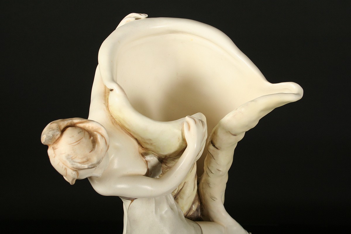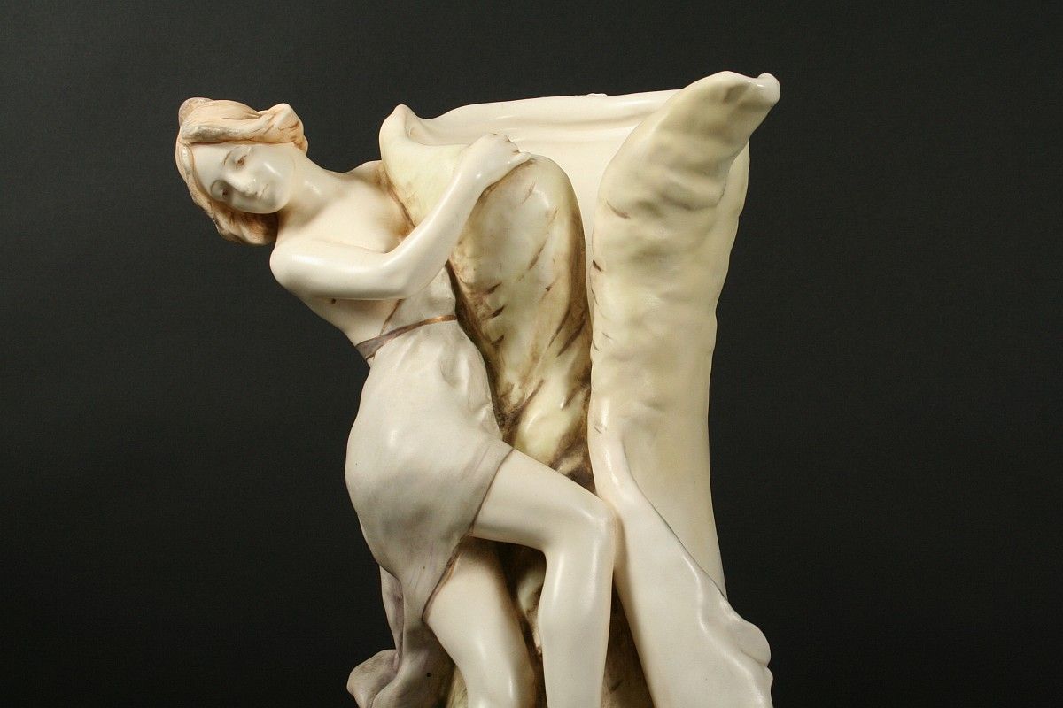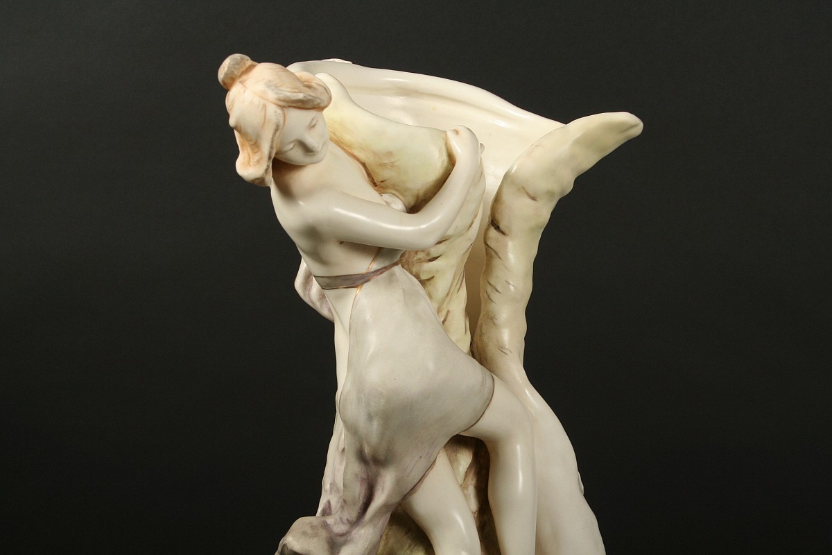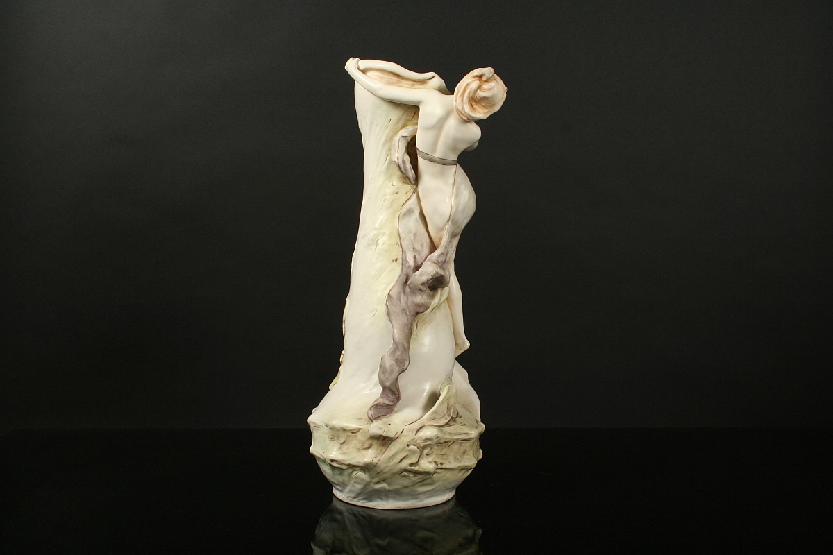 secesní figurální váza, bohatě tvarovaná keramika v tělových barvách, polonahá dívka s drapérií držící se hrdla vázy ve tvaru rozvité škeble, 44 cm, značená na dně tlačenými čísly a velkou tištěnou značkou DUX Duchcov, kolem roku 1900