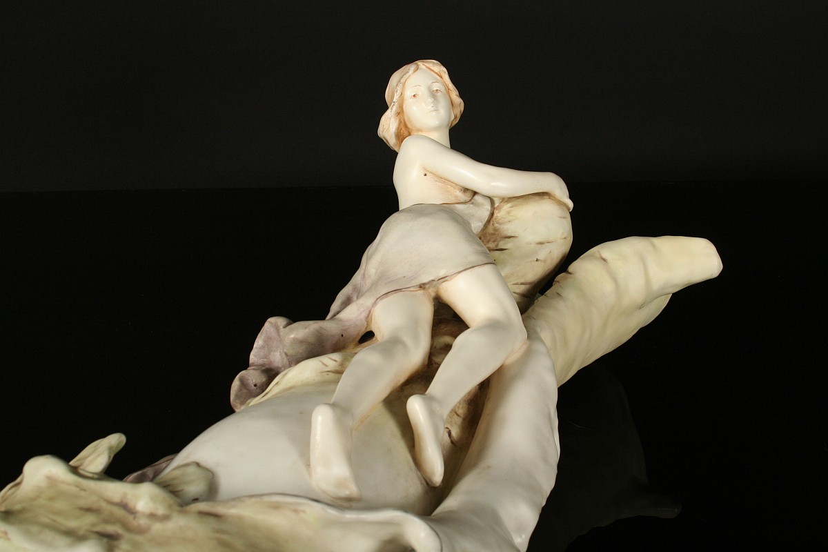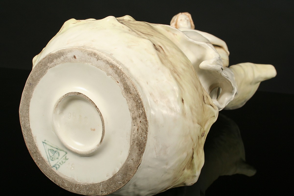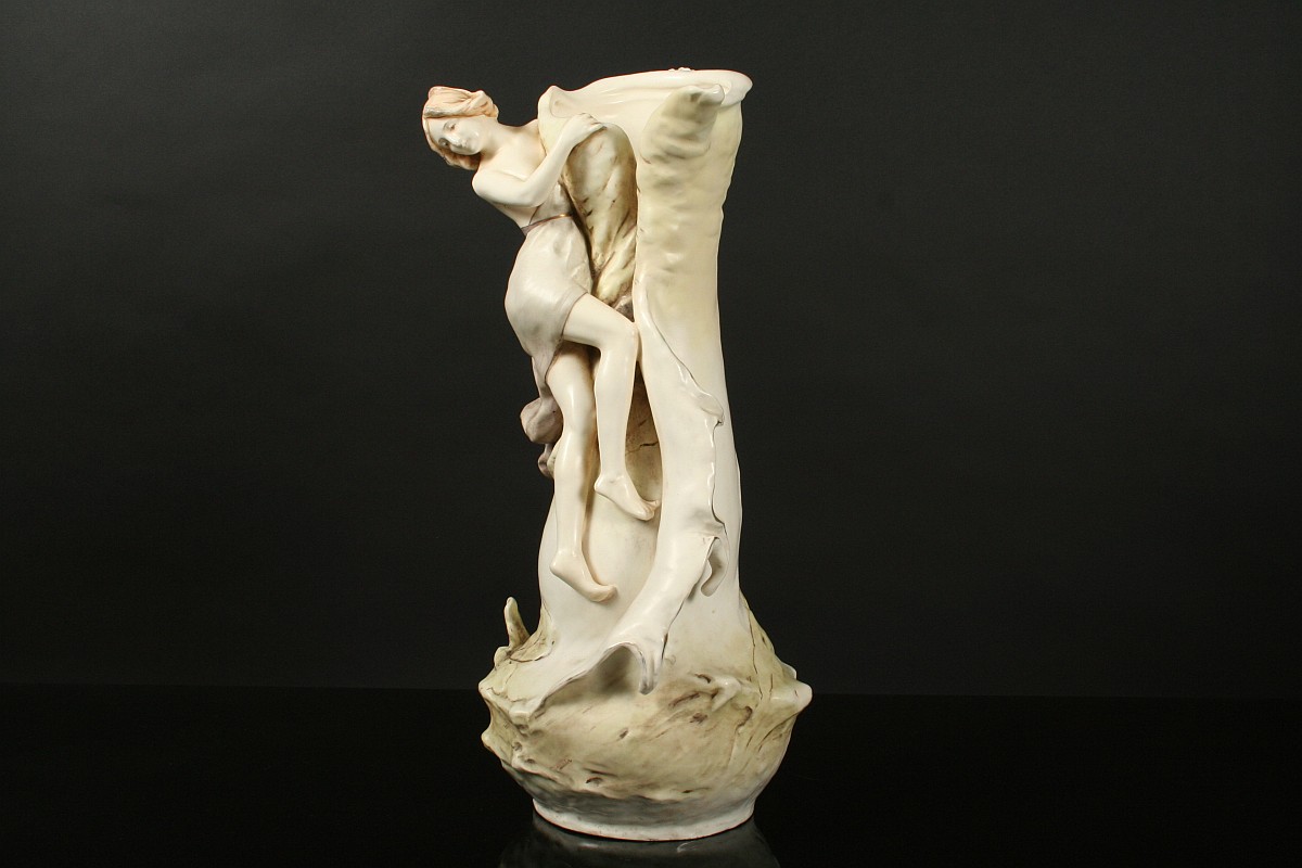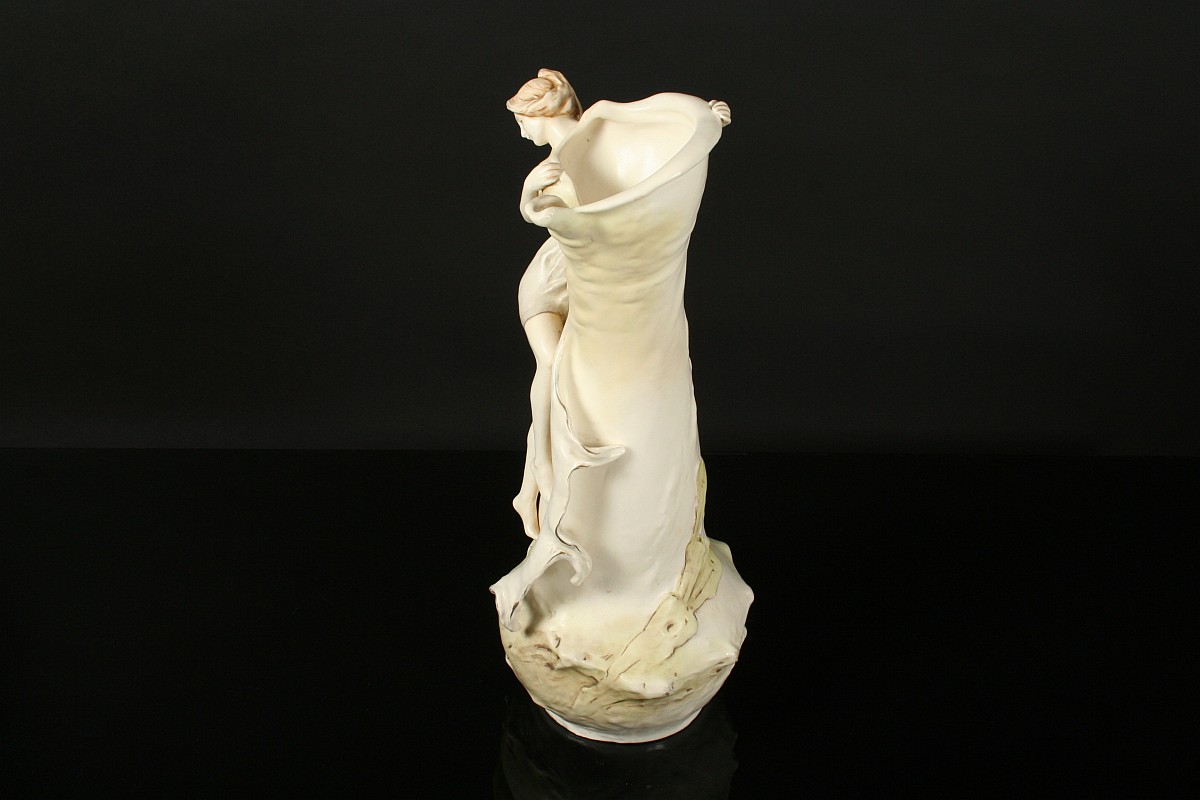 secesní figurální váza, bohatě tvarovaná keramika v tělových barvách, polonahá dívka s drapérií držící se hrdla vázy ve tvaru rozvité škeble, 44 cm, značená na dně tlačenými čísly a velkou tištěnou značkou DUX Duchcov, kolem roku 1900