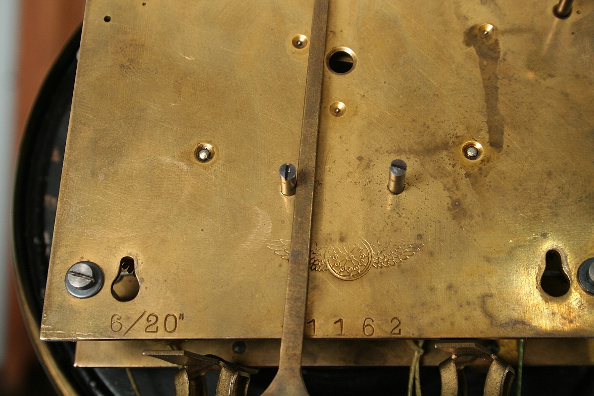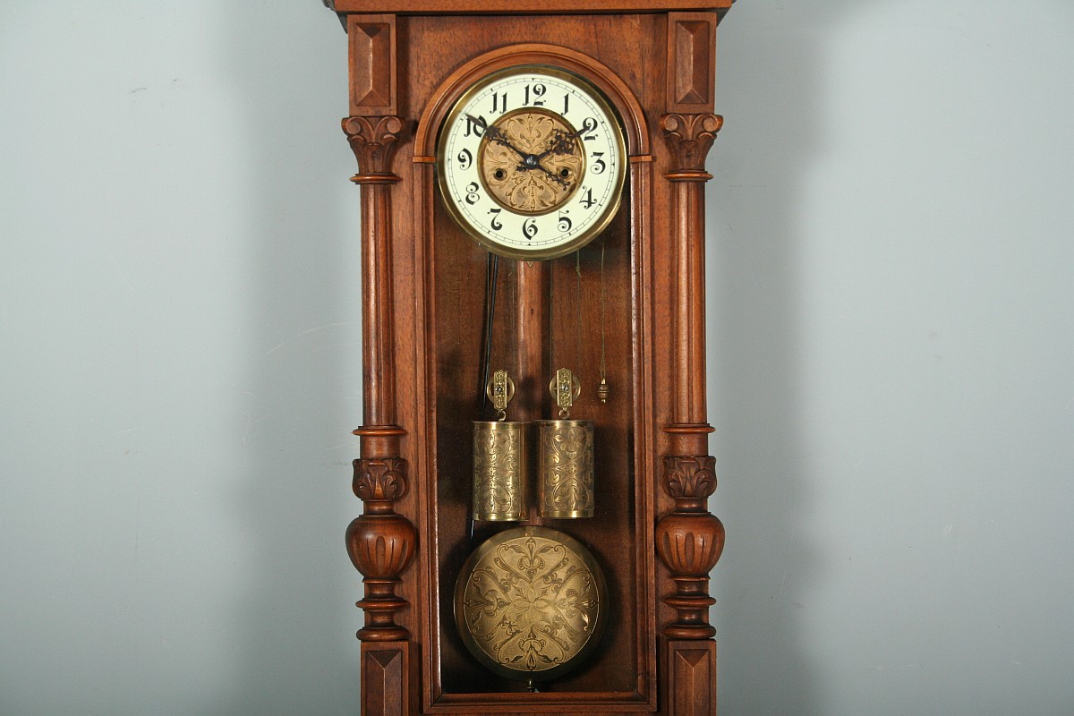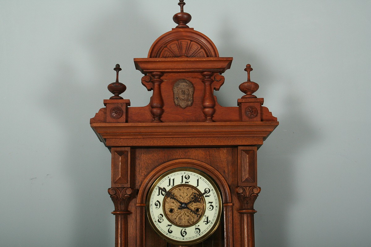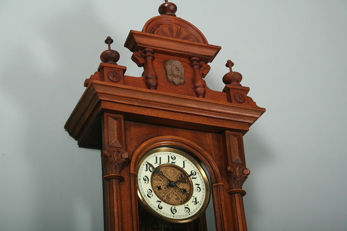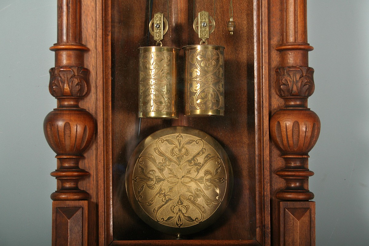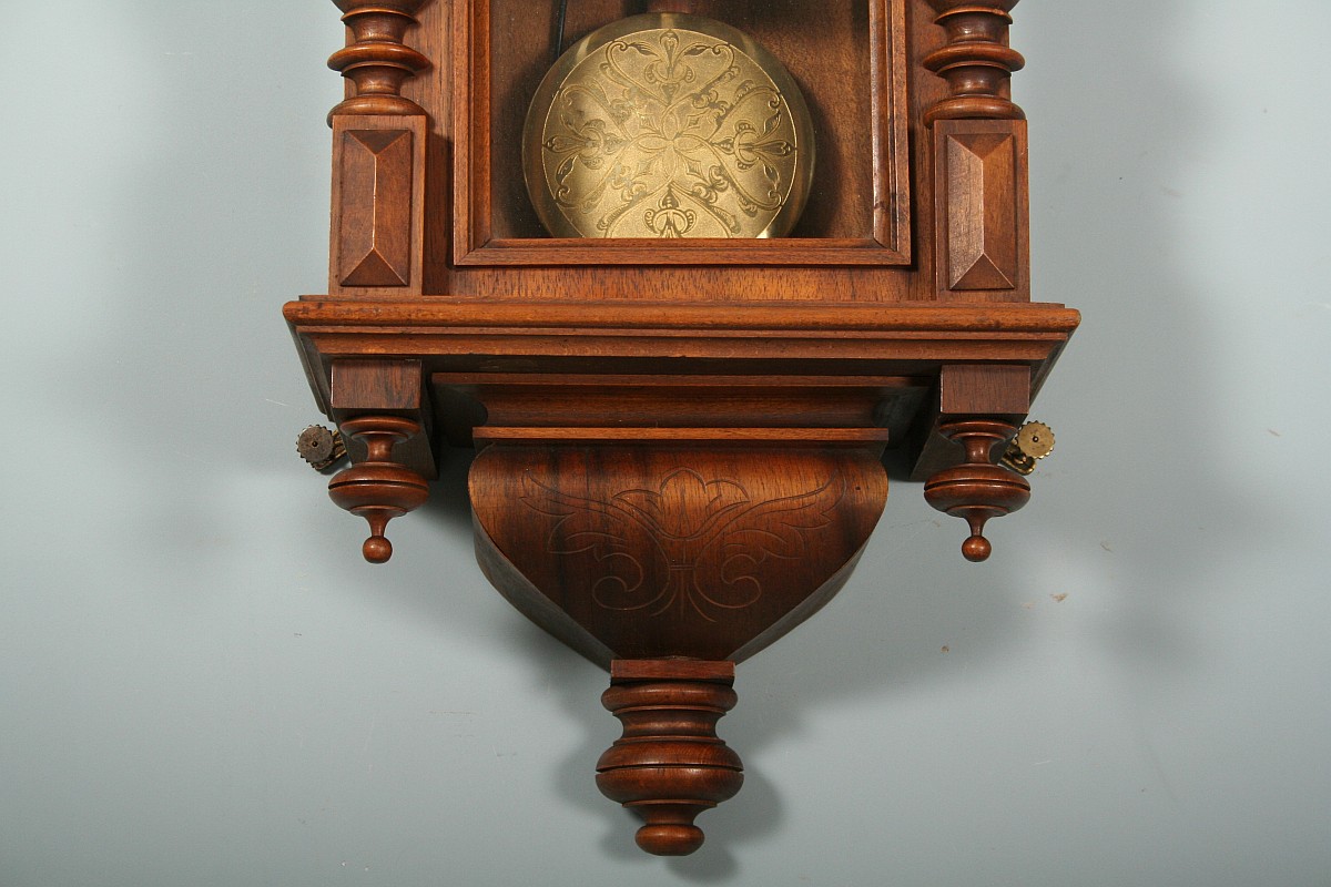 závěsné bicí hodiny bohatě gravírované v dřevěné vyřezávané skříni v pseudorenesančním stylu dýhované ořechem menších rozměrů, v pěkném původním stavu včetně původní koruny z přelomu 19. a 20. století, ciferník smaltovaný s bohatě gravírovaným středem dvěmi závažími a pendlem, stroj závažový značený okřídleným kolem, půlové bití do gongové tyče, funkční s klíčkem, 100 x 39 cm