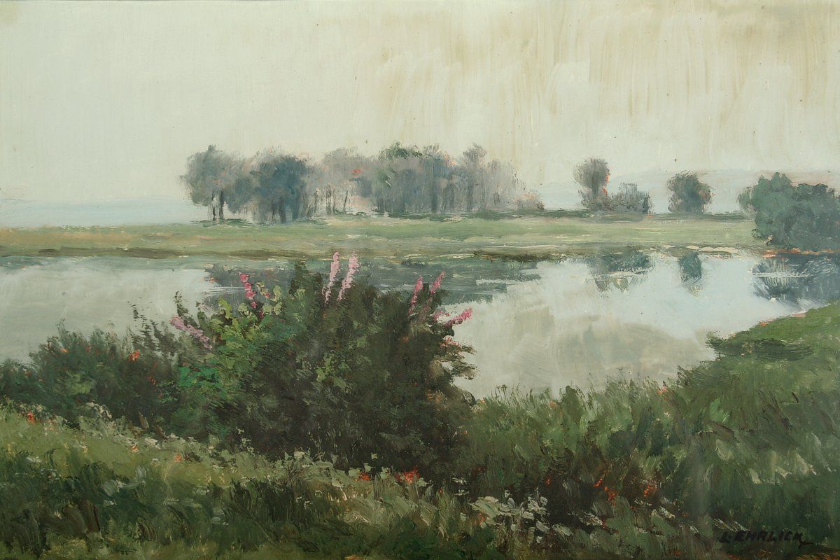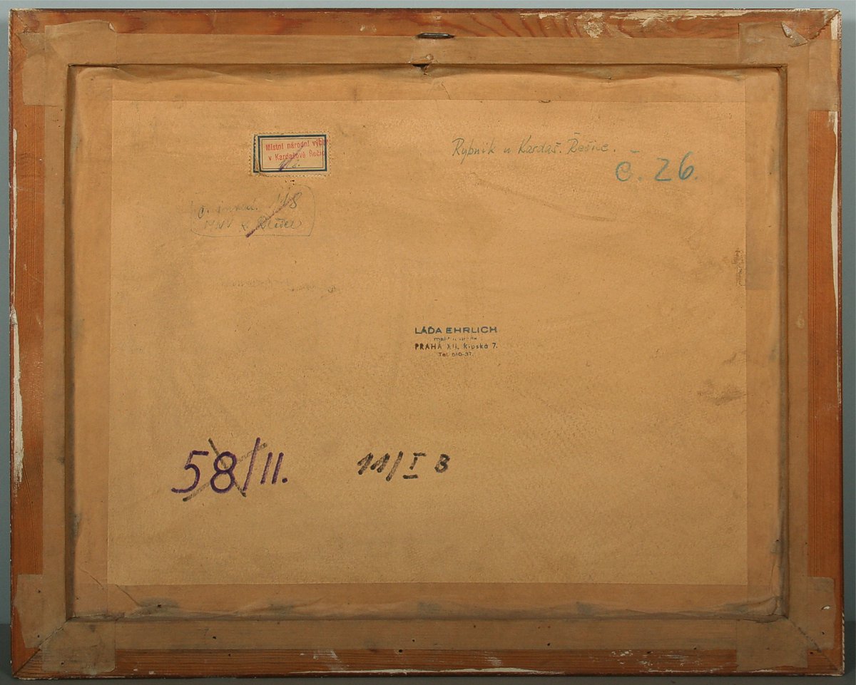 obraz krajina s rozkvetlým keřem v pozadí rybník u Kardašovi Řečice, olej na lepence, 19,5 x 29,5 cm s rámem 37 x 47 cm, autor Láďa Ehrlich, podepsáno vpravo dole L. Ehrlich, na zadní straně ateliérové razítko a přípis s dedikací, rámováno v původním rámu a paspartě pod sklem